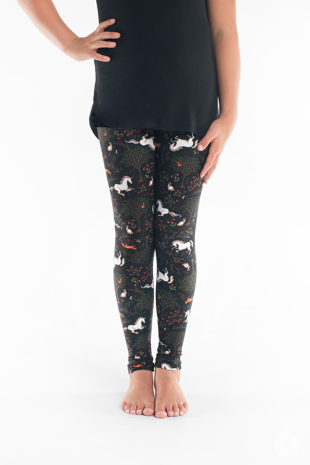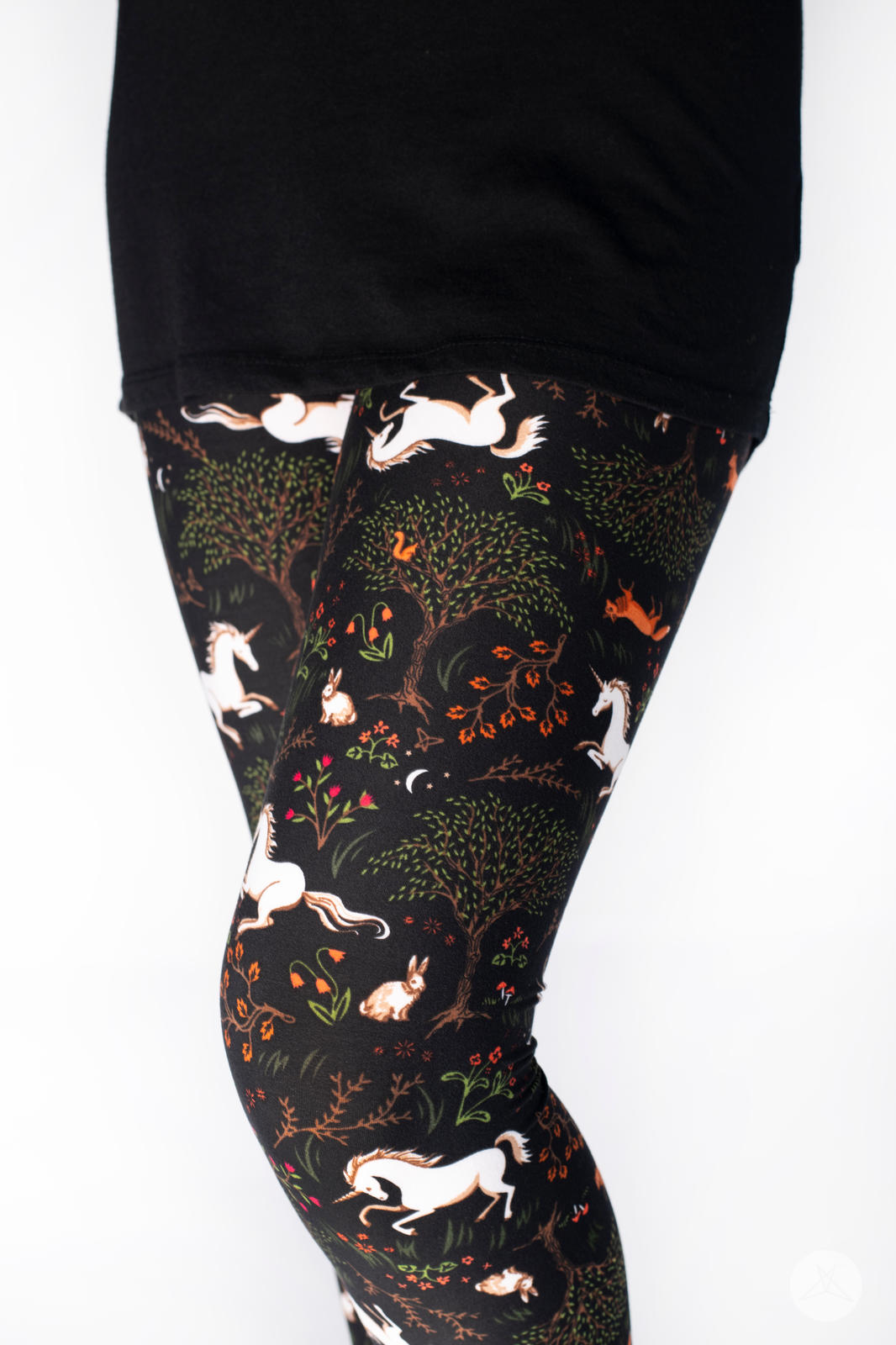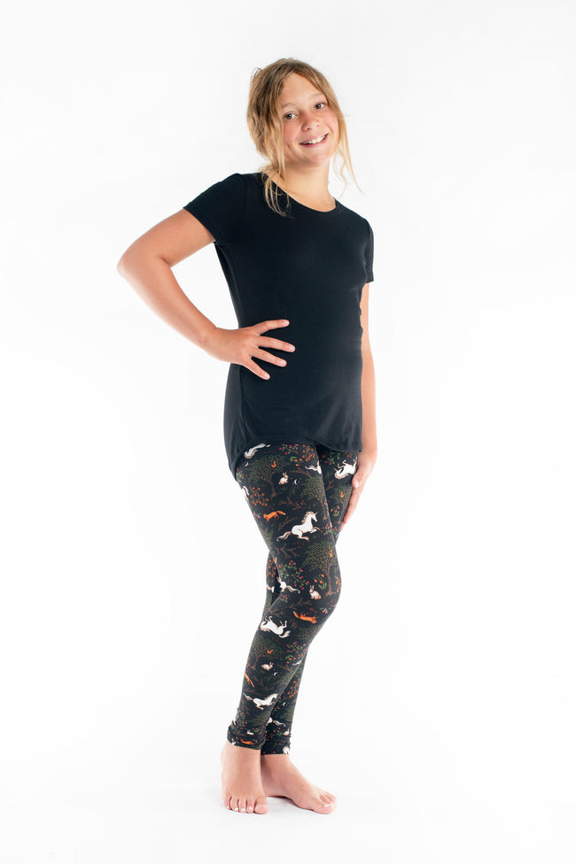White unicorns and woodland creatures frolic amongst beautiful trees, shrubs, and flowers on a deep black background that will make you feel absolutely magical.