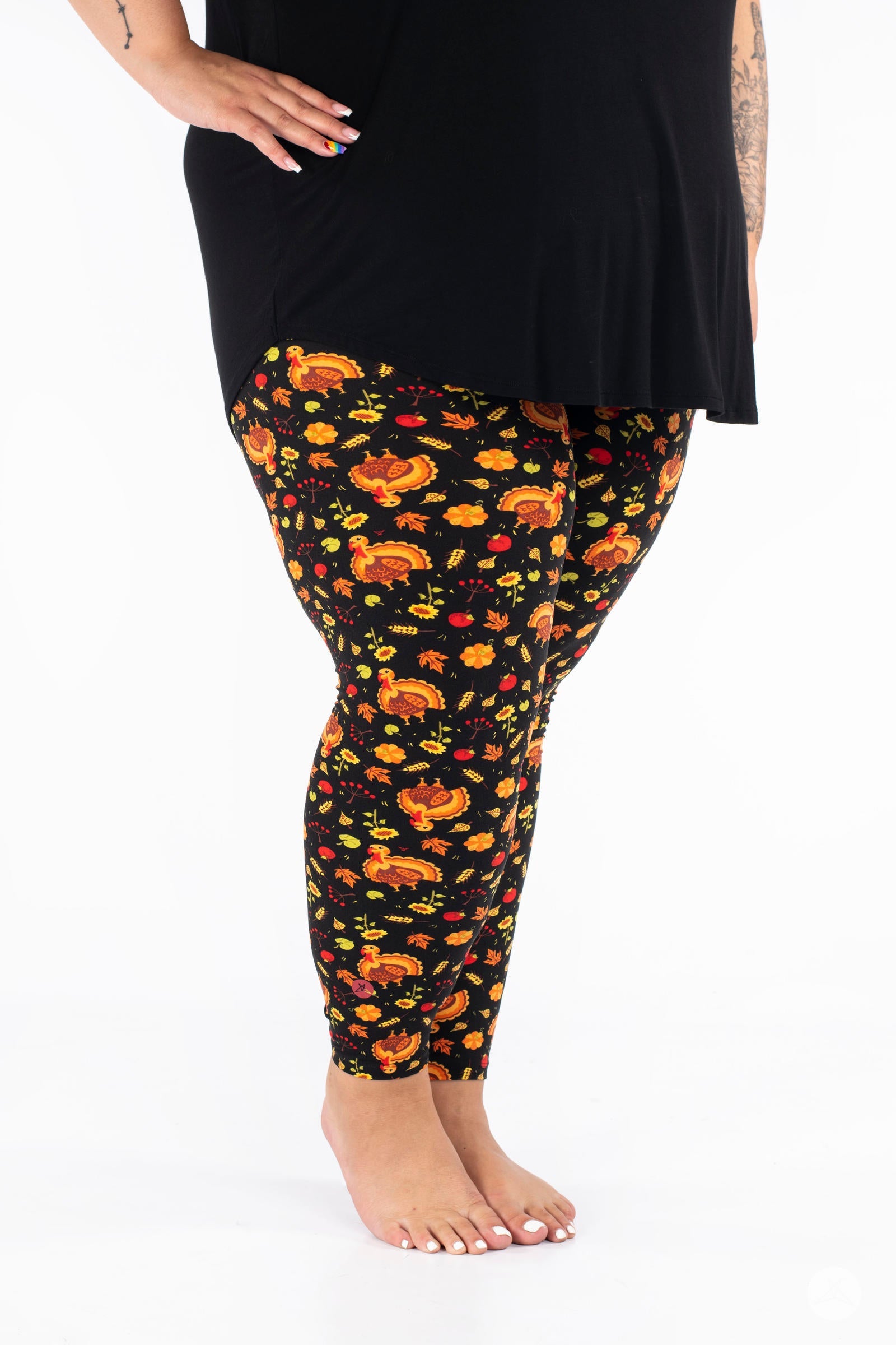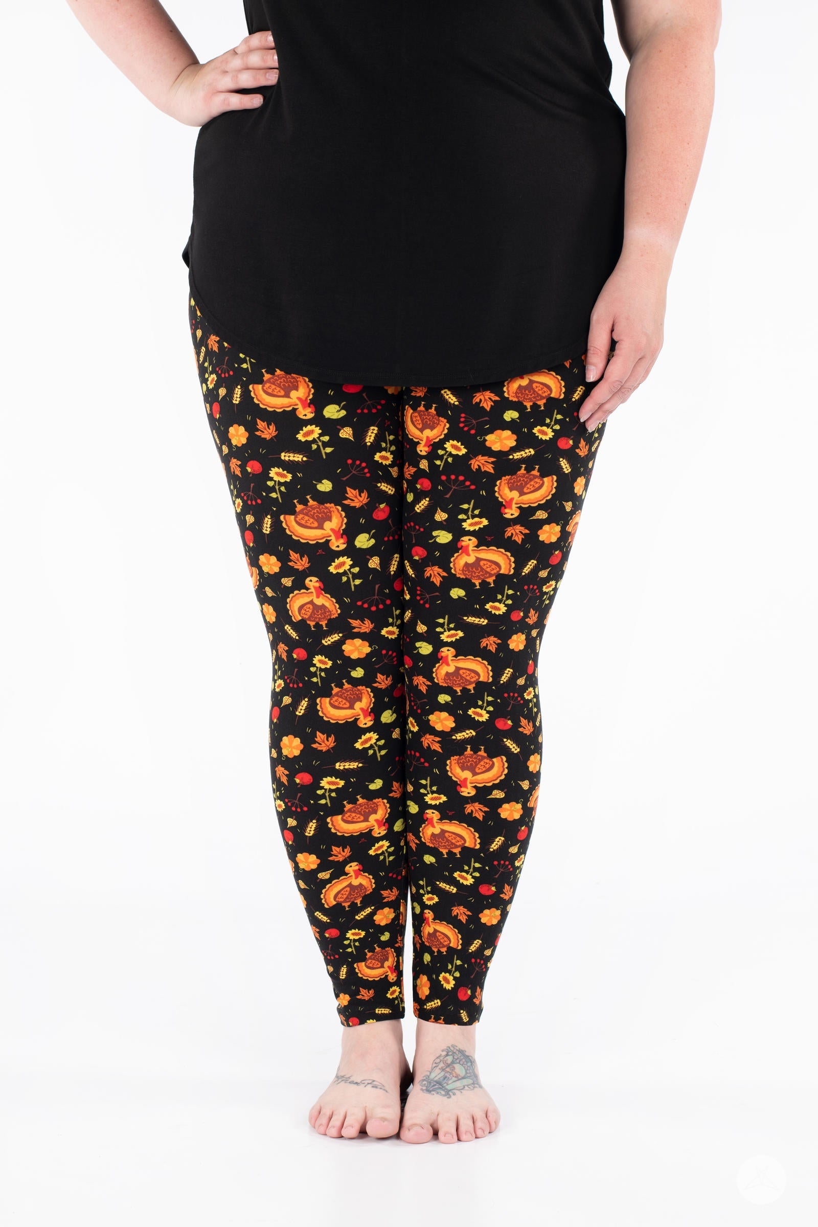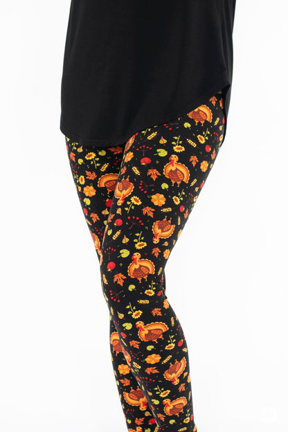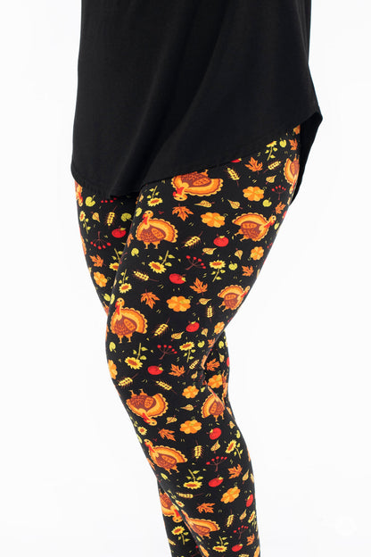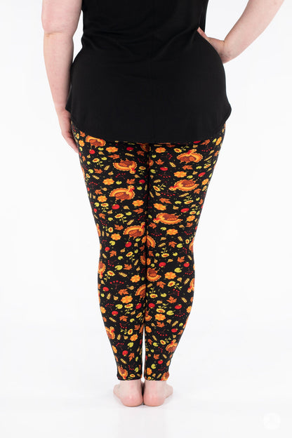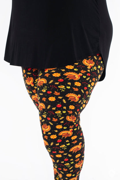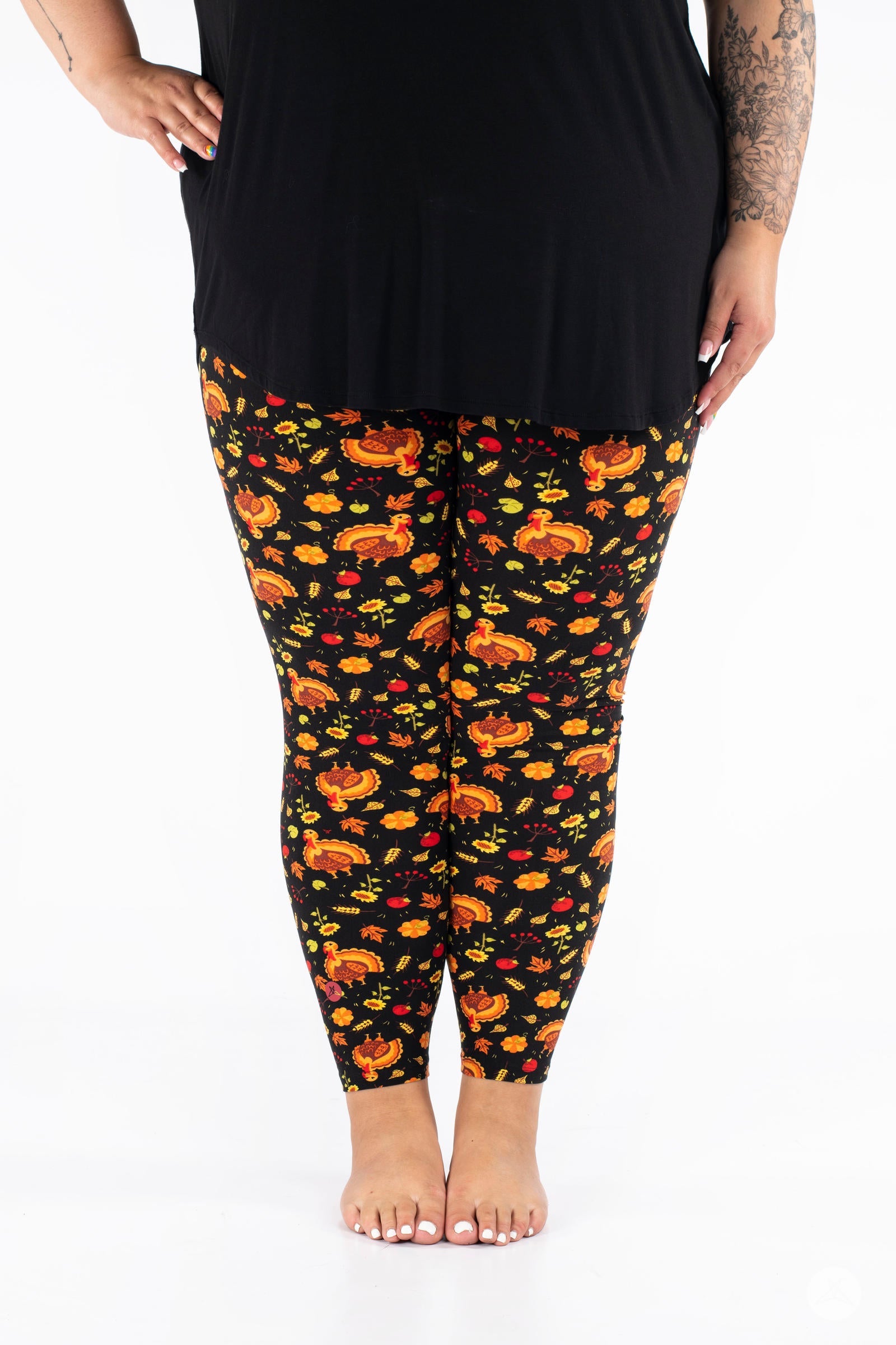 Gobble Gobble features a harvest scene on the homestead! With jolly turkeys, swaying wheat stalks, sunflowers, pumpkins, apples and more - this print is bursting with autumn joy. Gobble Gobble has red, orange, yellow, green, and brown details - all on a black background.
