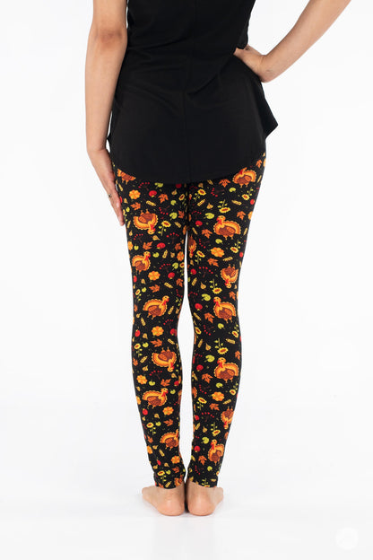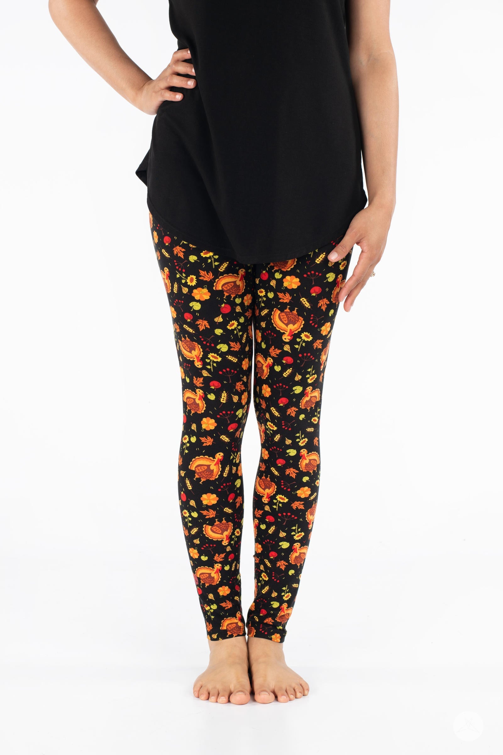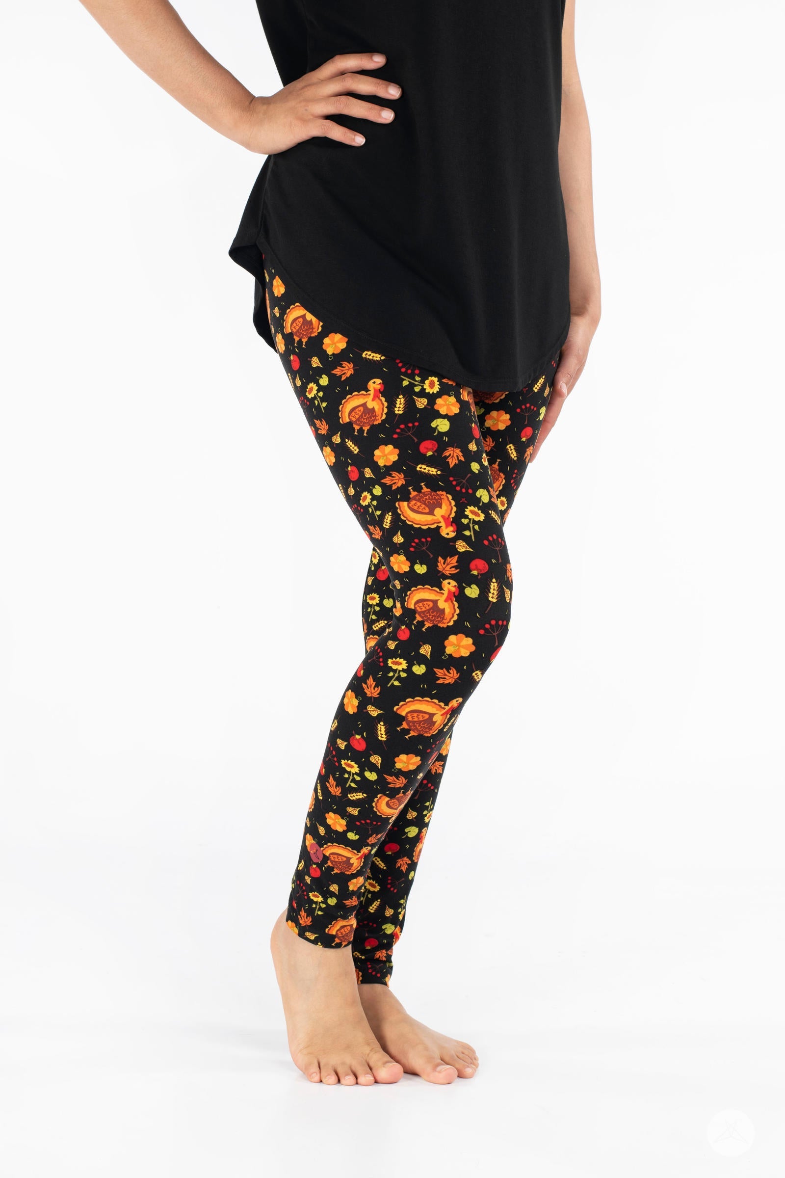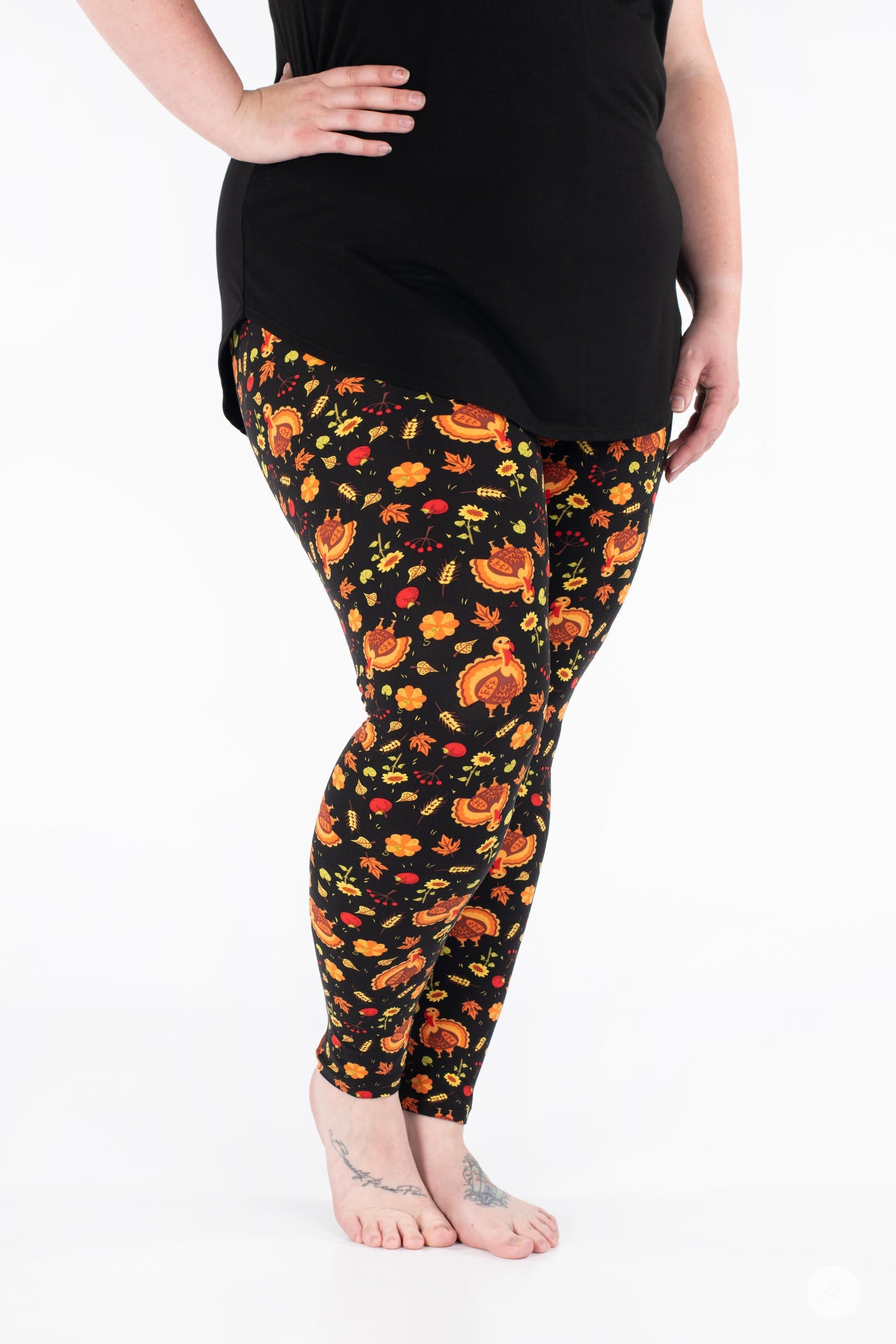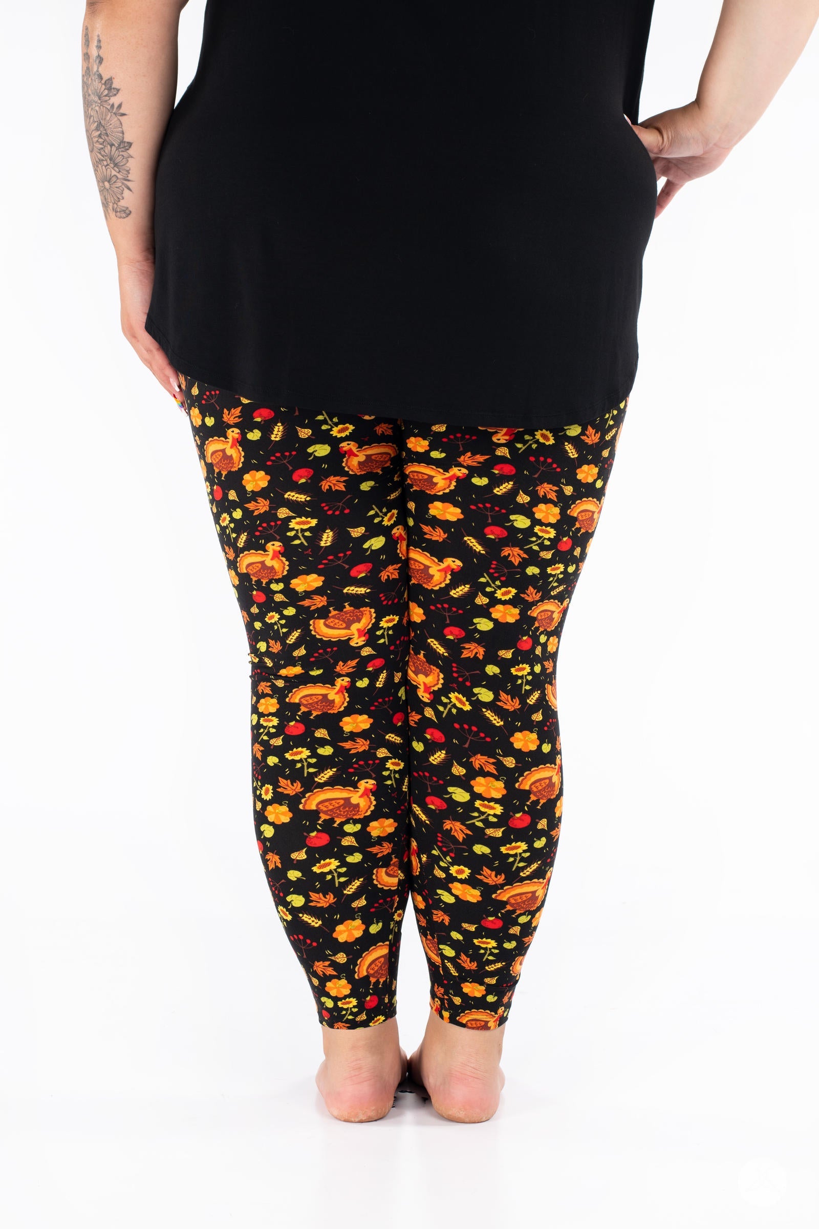 Gobble Gobble features a harvest scene on the homestead! With jolly turkeys, swaying wheat stalks, sunflowers, pumpkins, apples and more - this print is bursting with autumn joy. Gobble Gobble has red, orange, yellow, green, and brown details - all on a black background.
