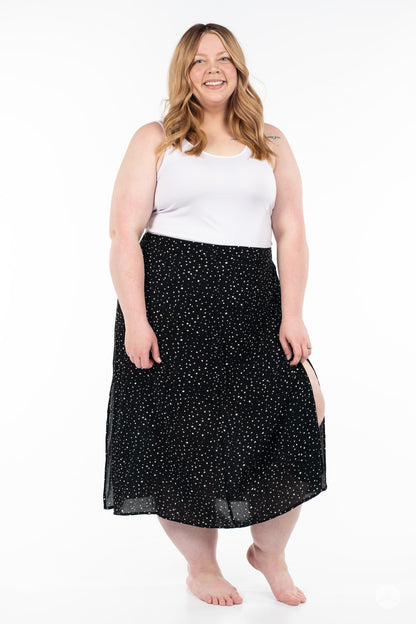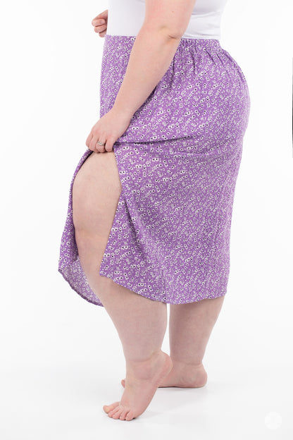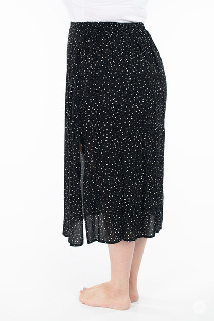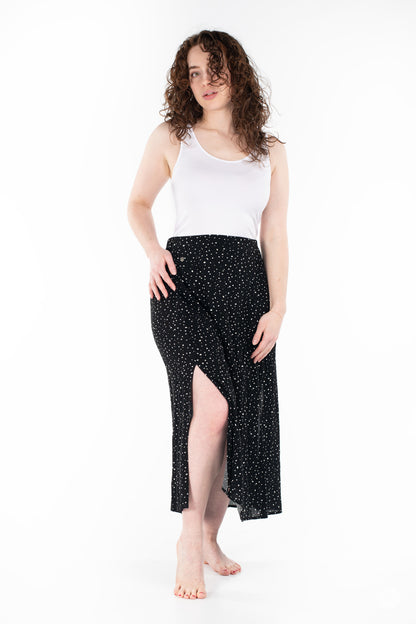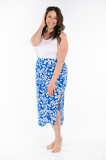 Elevate your summer style with the Breeze Midi Skirt. Featuring side slits and an elasticized waist on the back, this 100% viscose skirt offers both comfort and sophistication.