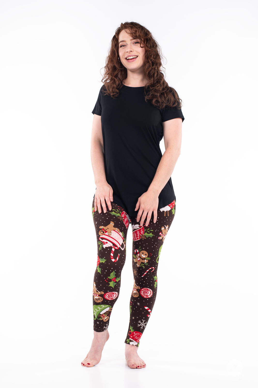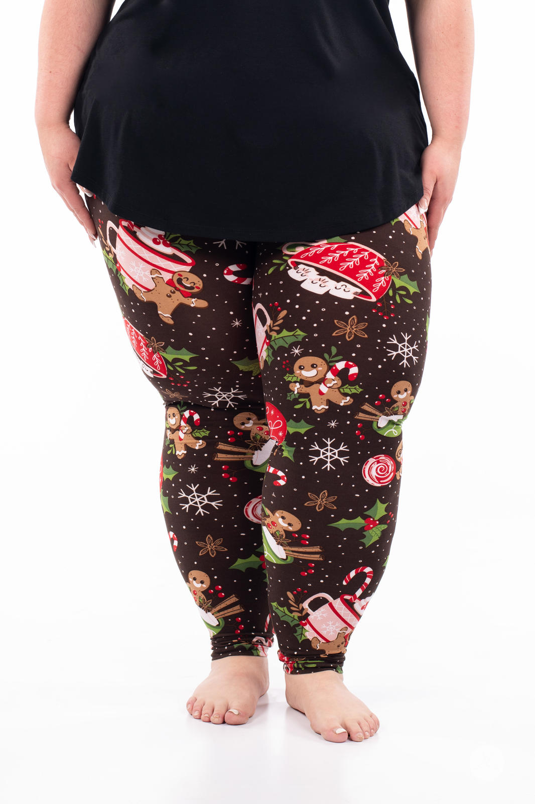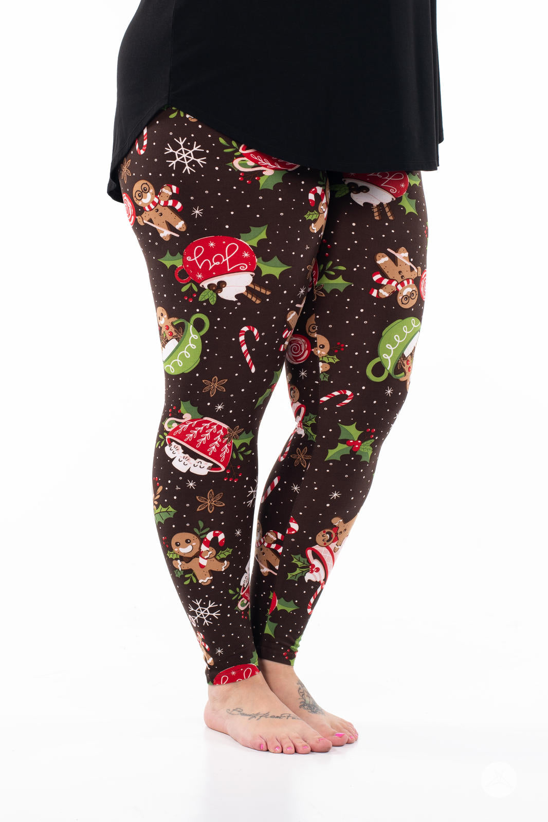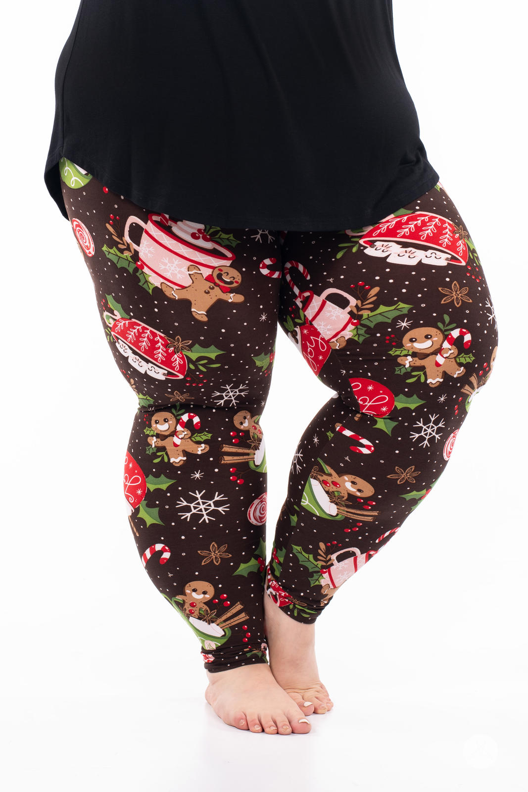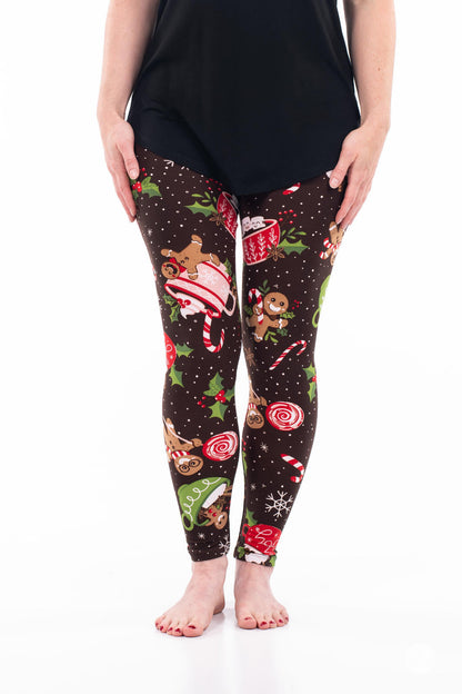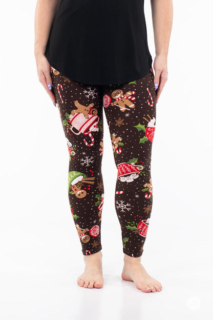 Baking Spirits Bright is the sweetest pair of leggings this season. Decorated with adorable gingerbread figures, mugs of hot cocoa, and an array of candies - all set against a brown backdrop with falling snow and snowflakes - these leggings are a recipe for festive fun.