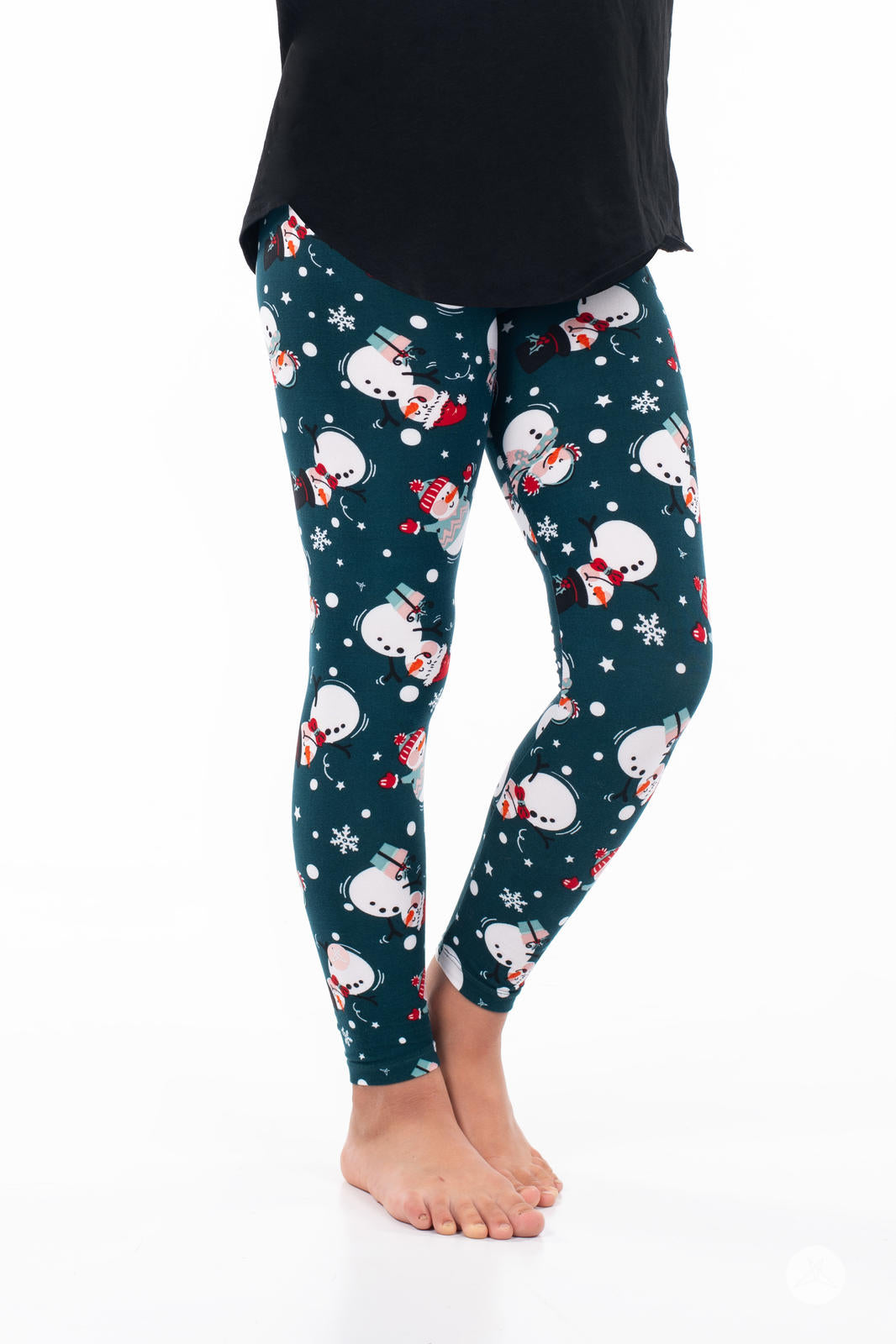 Stay Frosty are must-have leggings for the winter season! Set against an emerald green backdrop, these leggings feature a whimsical parade of snowmen adorned in cute winter attire. Make every day a snow day with Stay Frosty. Let the frosty fun begin!