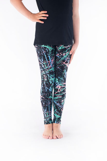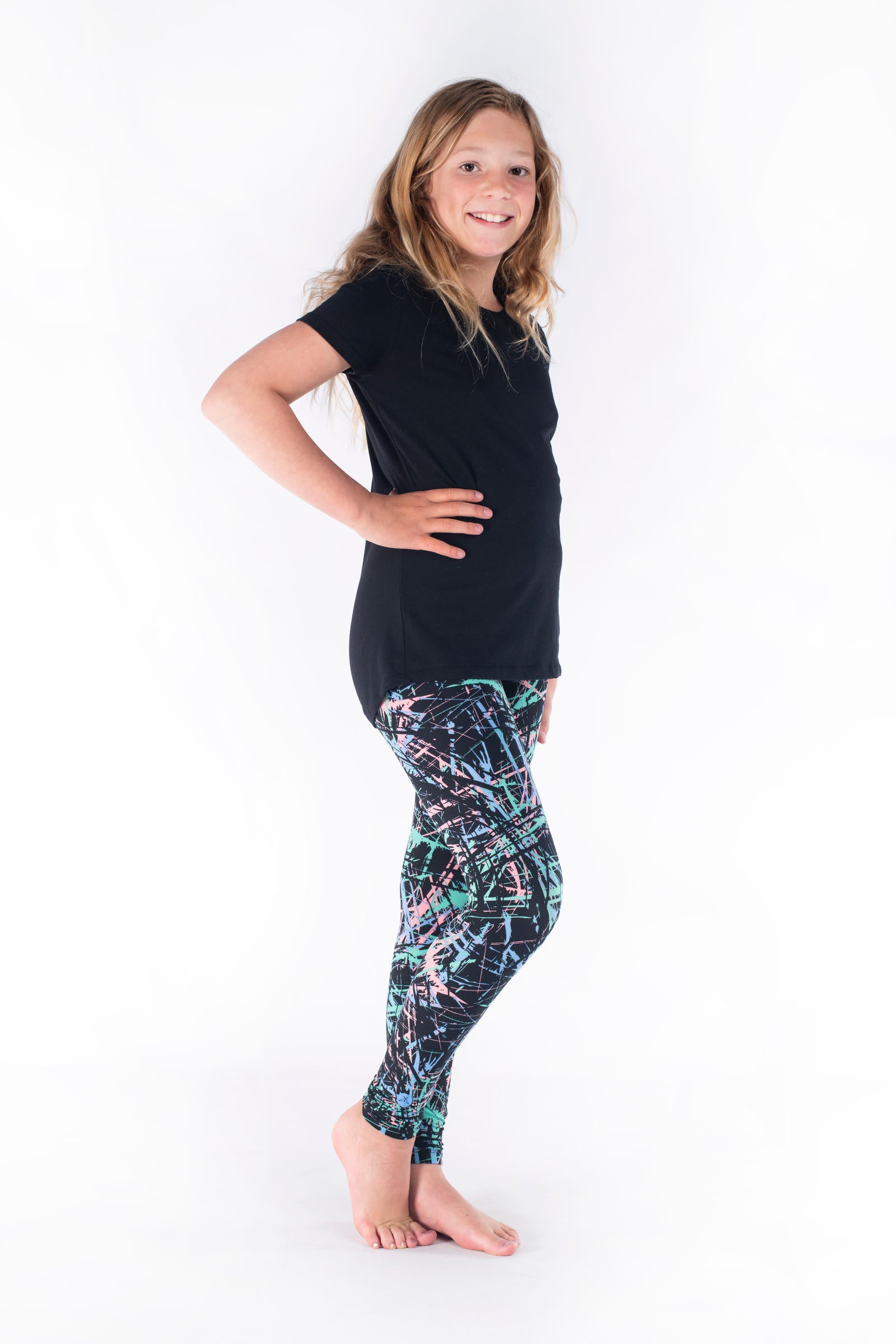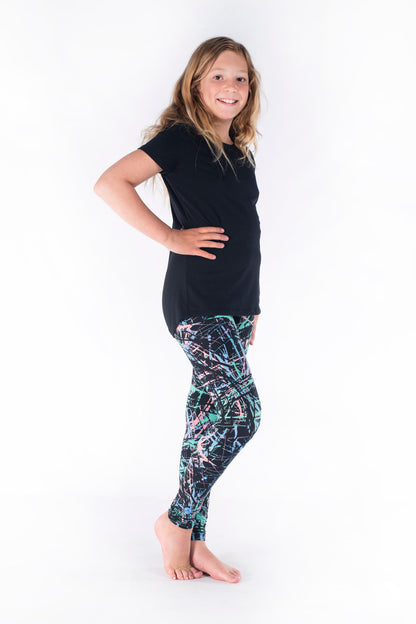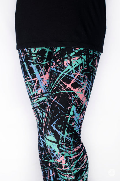 Pump up the jam all year in Expression SweetLegs featuring a graffiti-inspired print in teal, blue, and pink on a deep black background.