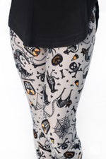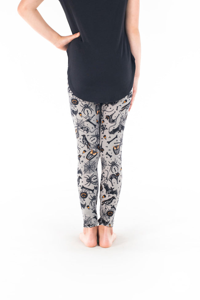 This halloween-themed print features all of your favourites from the season: Jack-o-lanters, spider webs, skulls, spooky animals, and more, all on a neutral grey background to pair perfectly with any outfit.