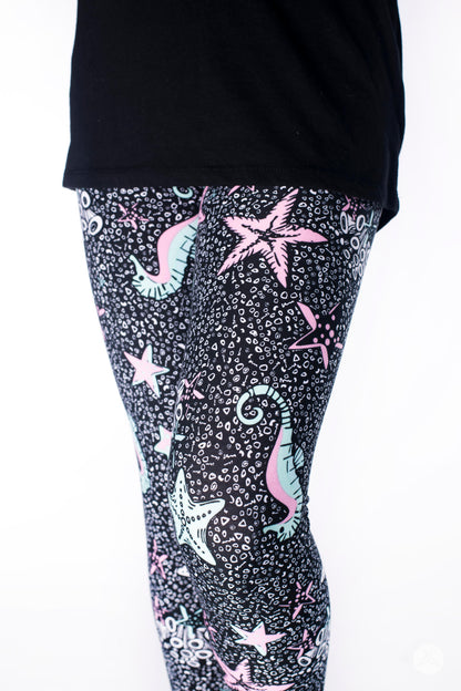 Mint, pink, and white-coloured seahorse, starfish, and coral reef are accented on a deep black background and are perfect for your next trip to the coast!