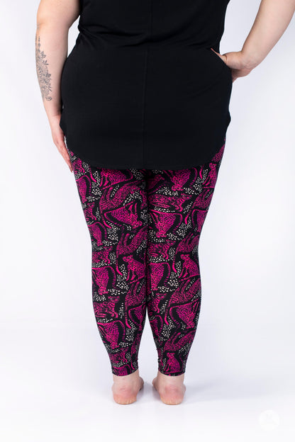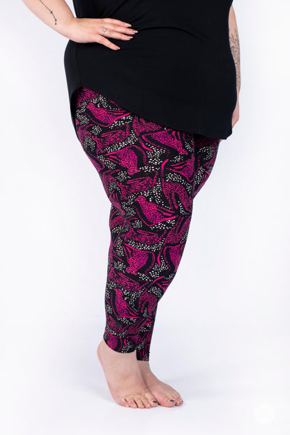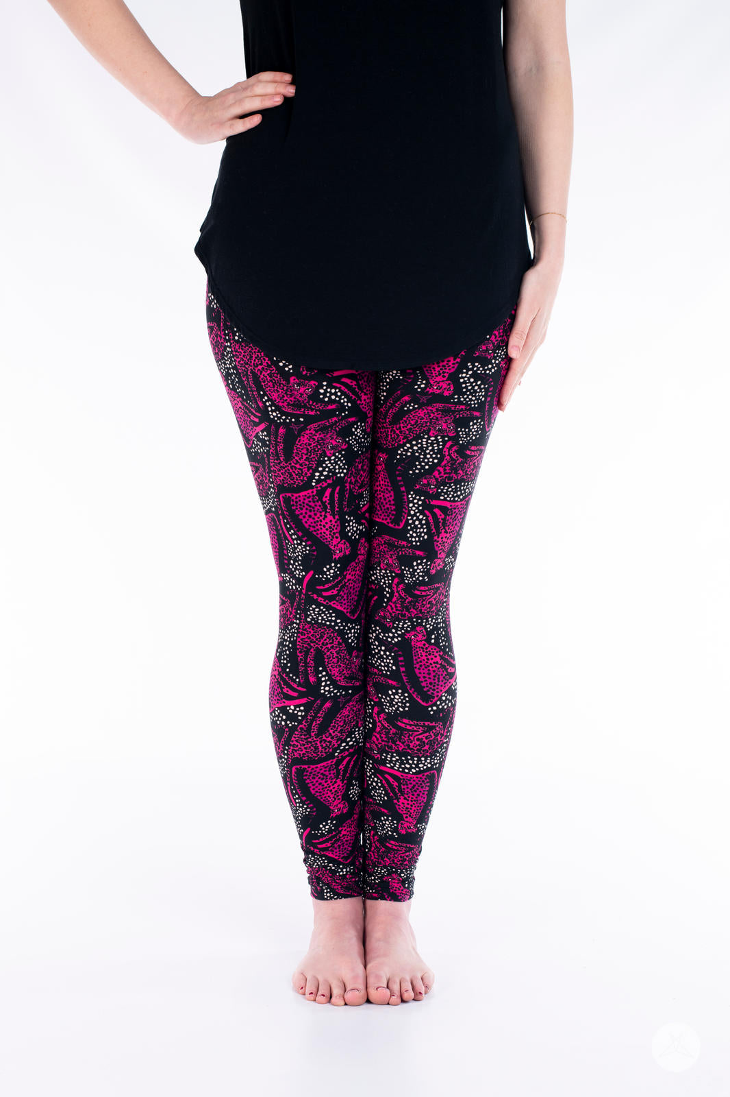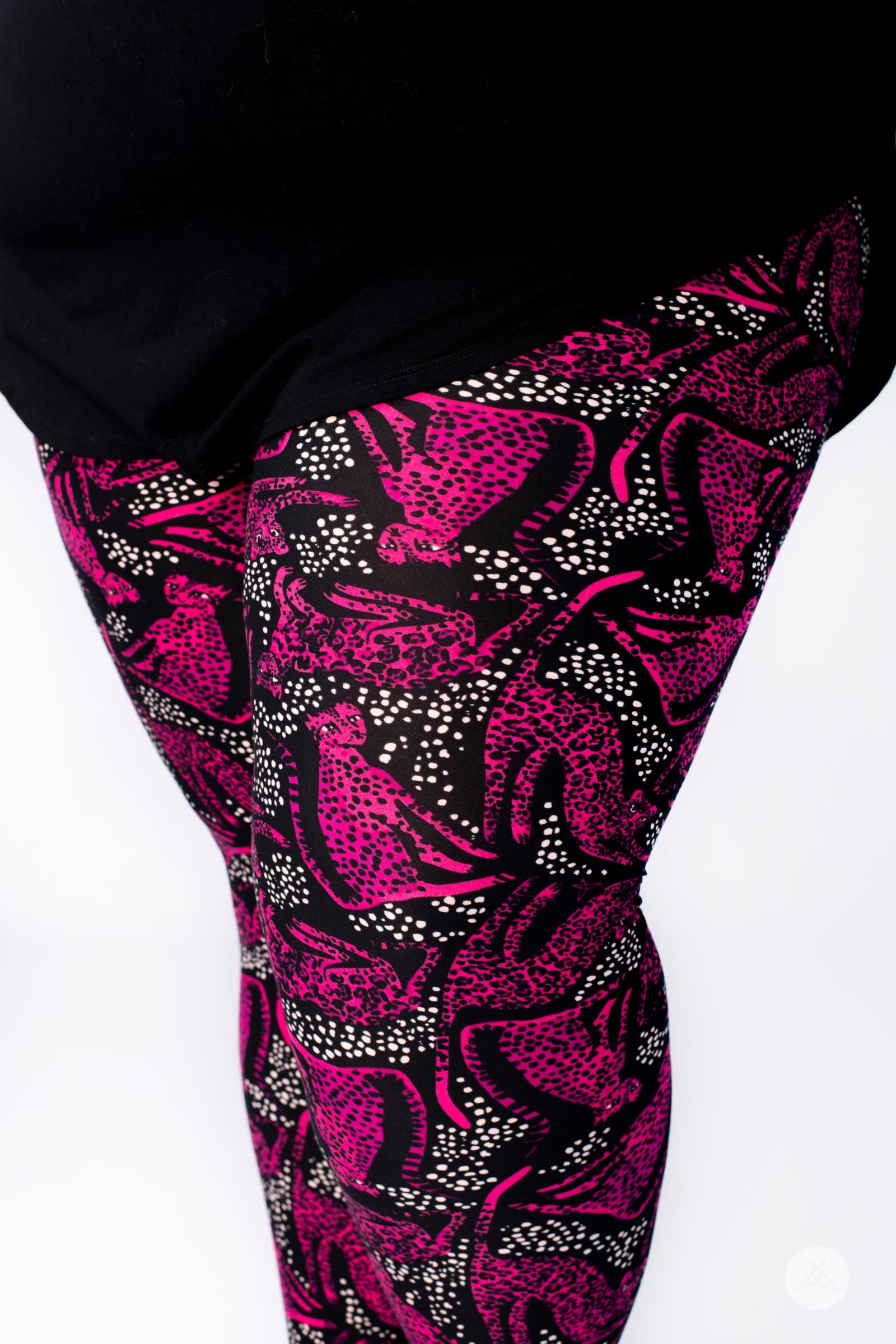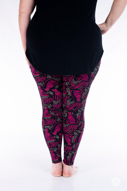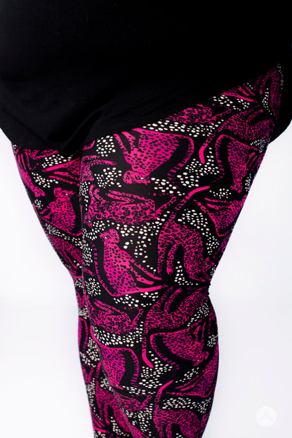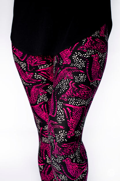 Show your spots in this fun jungle cat print featuring fuschia big cats and white accents on a deep black background.