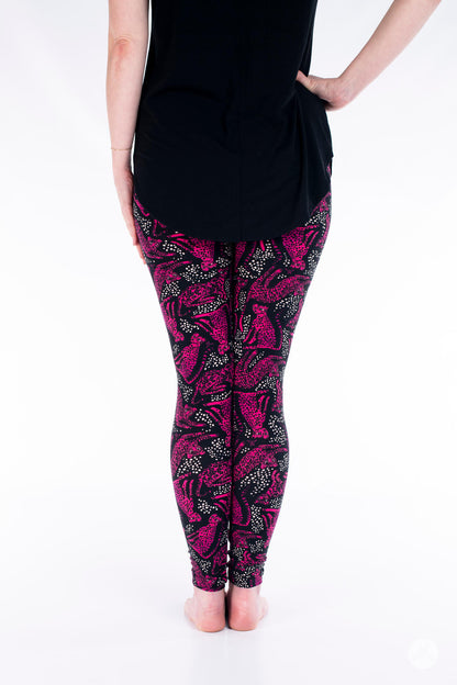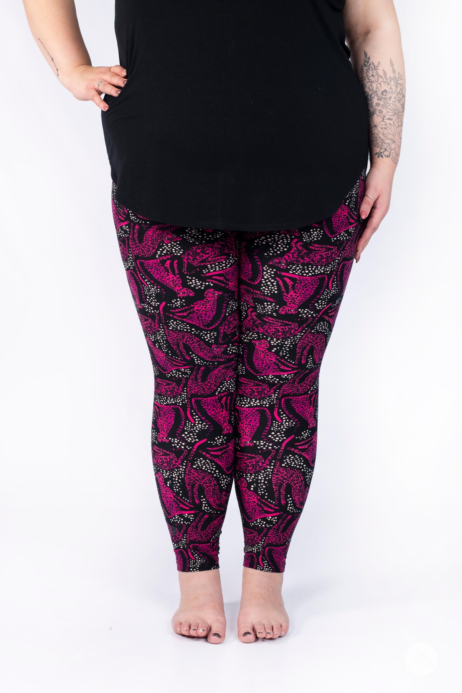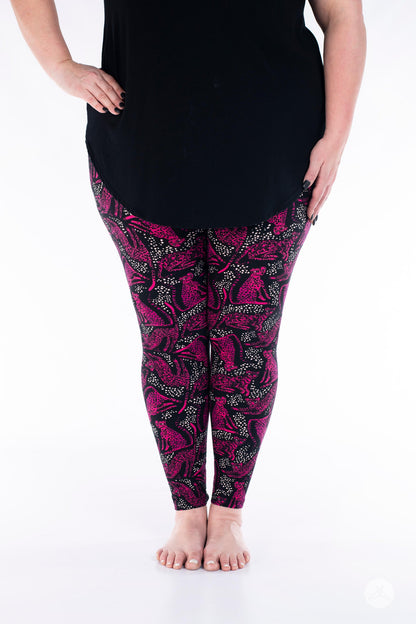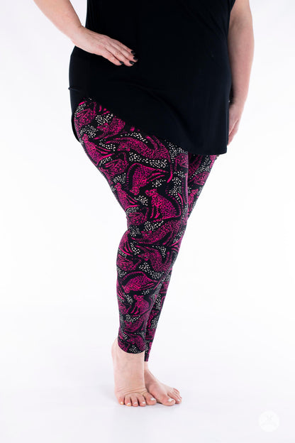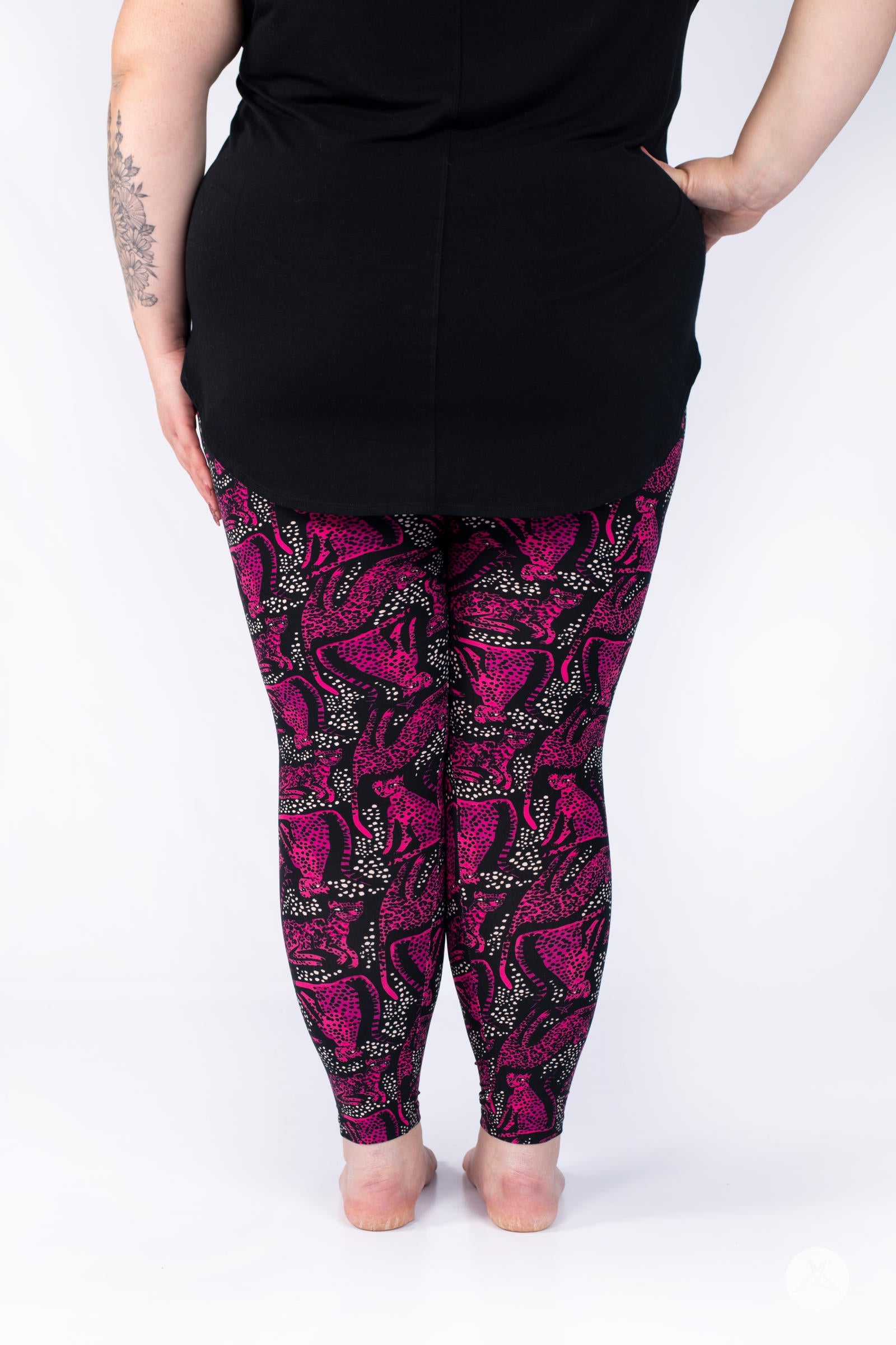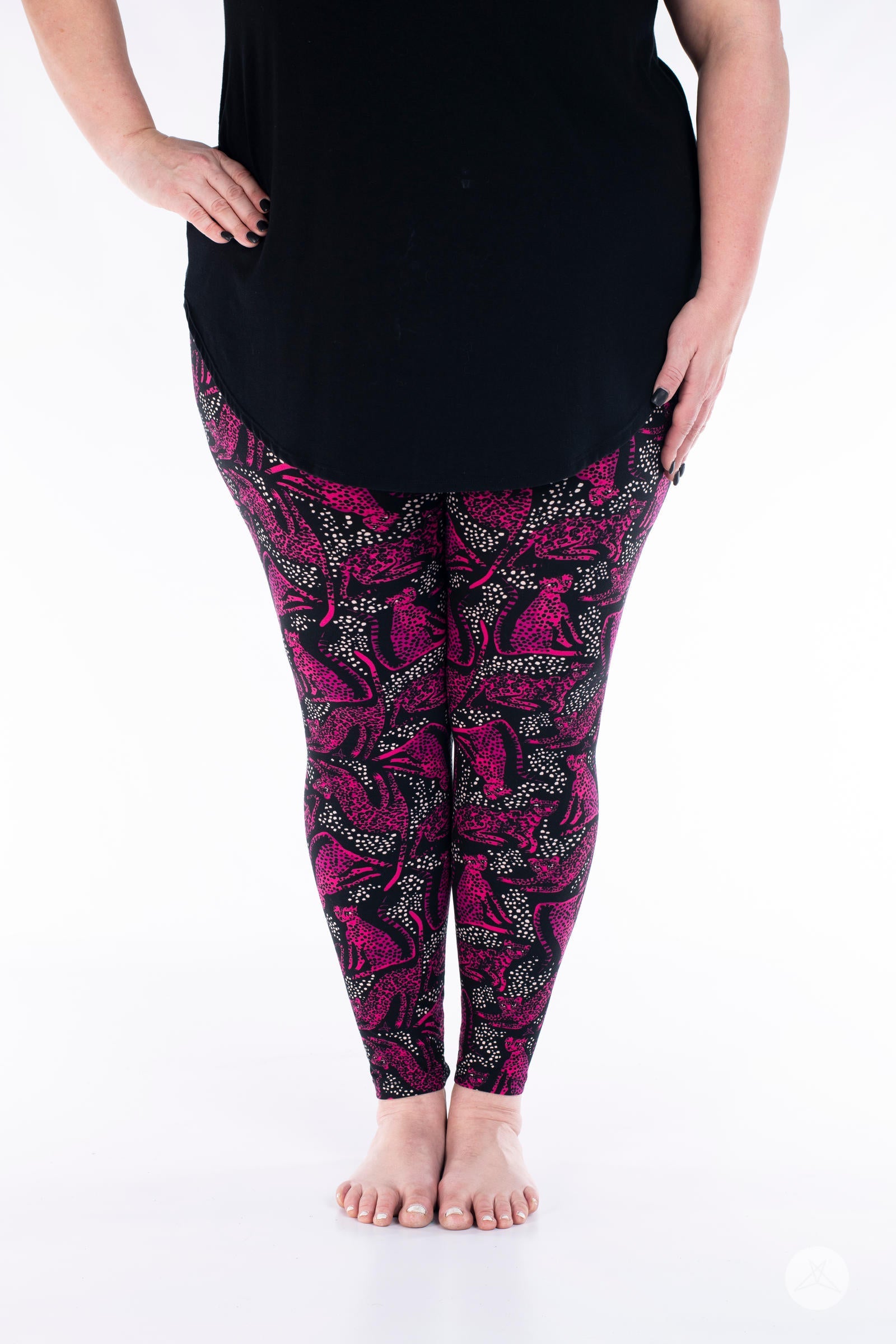 Show your spots in this fun jungle cat print featuring fuschia big cats and white accents on a deep black background.