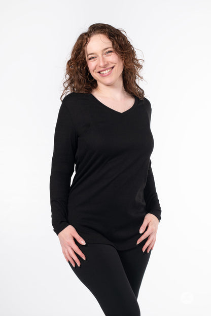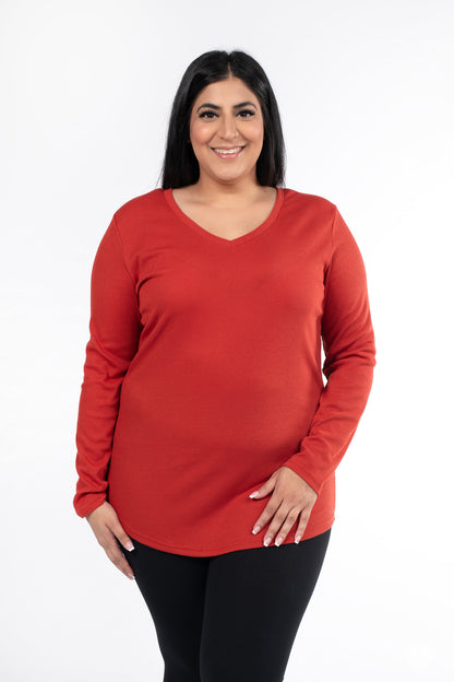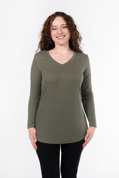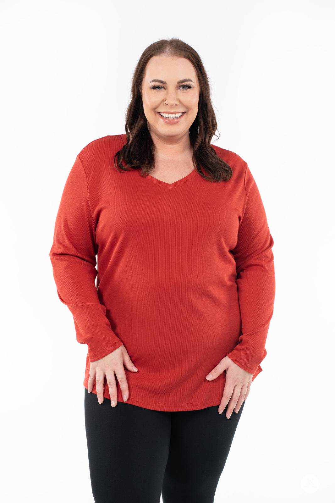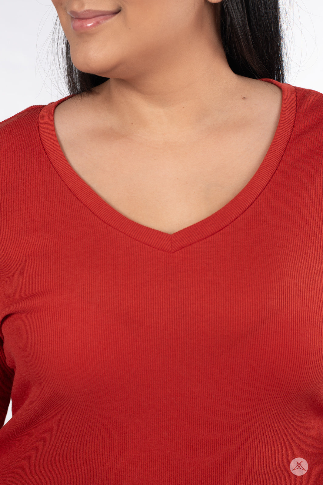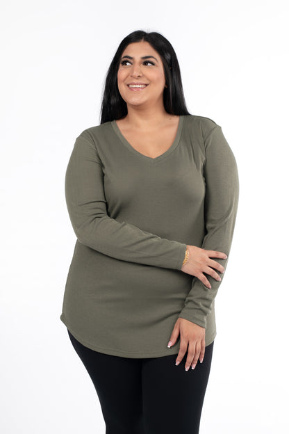 The Ribbed Long Sleeve V-Neck is a semi-fitted, relaxed top that adds just the right amount of warmth as the season begins to cool. Designed with a v-neckline for a touch of sophistication to this everyday layering piece. Pairs cozily with the Go-To Ankle Fray Jeans and the Layering Shacket Vest.