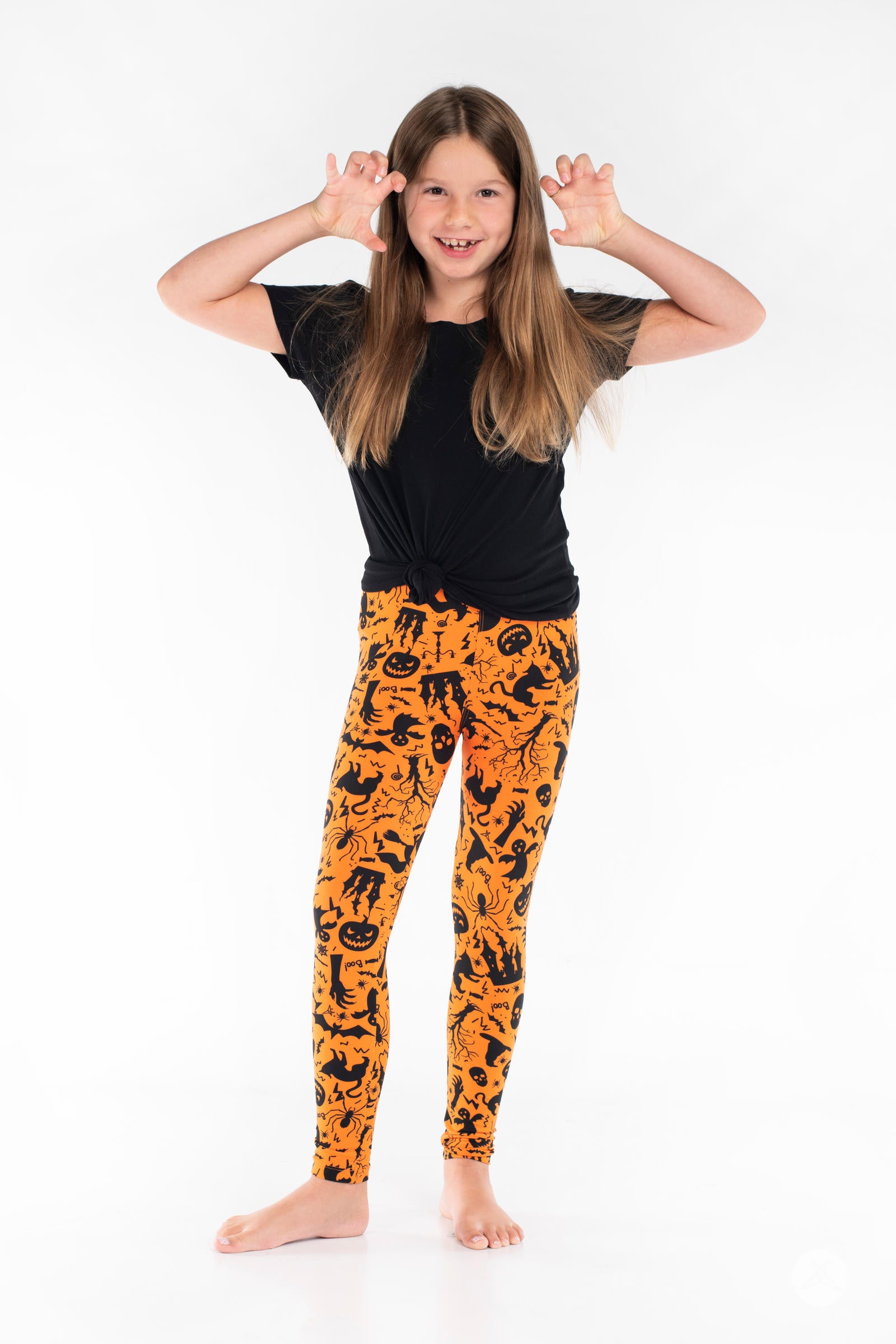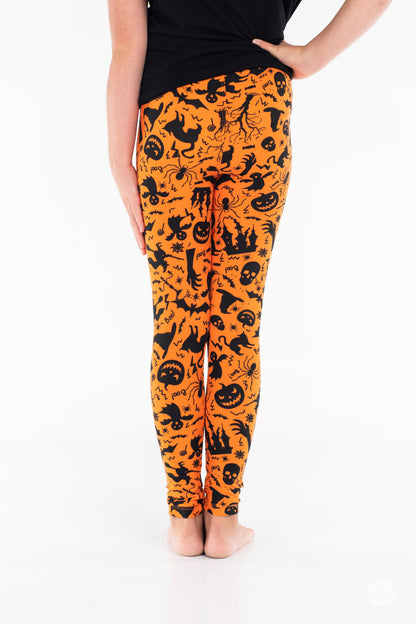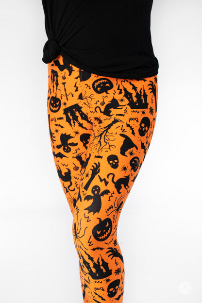 These vibrant orange leggings with skulls, pumpkins, spiders, witch's hats and more will have you standing out this Halloween.