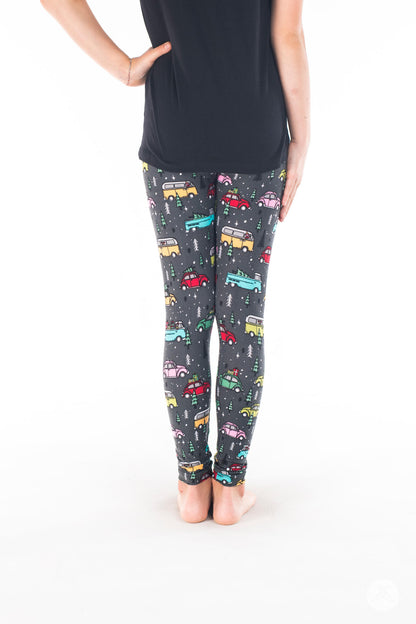 This super fun print features classic cars, trucks, and vans in a rainbow of colours transporting holiday trees and gifts accented on a charcoal background.