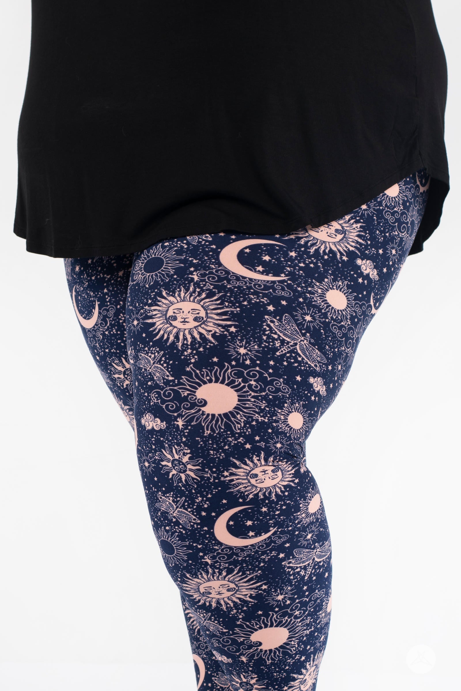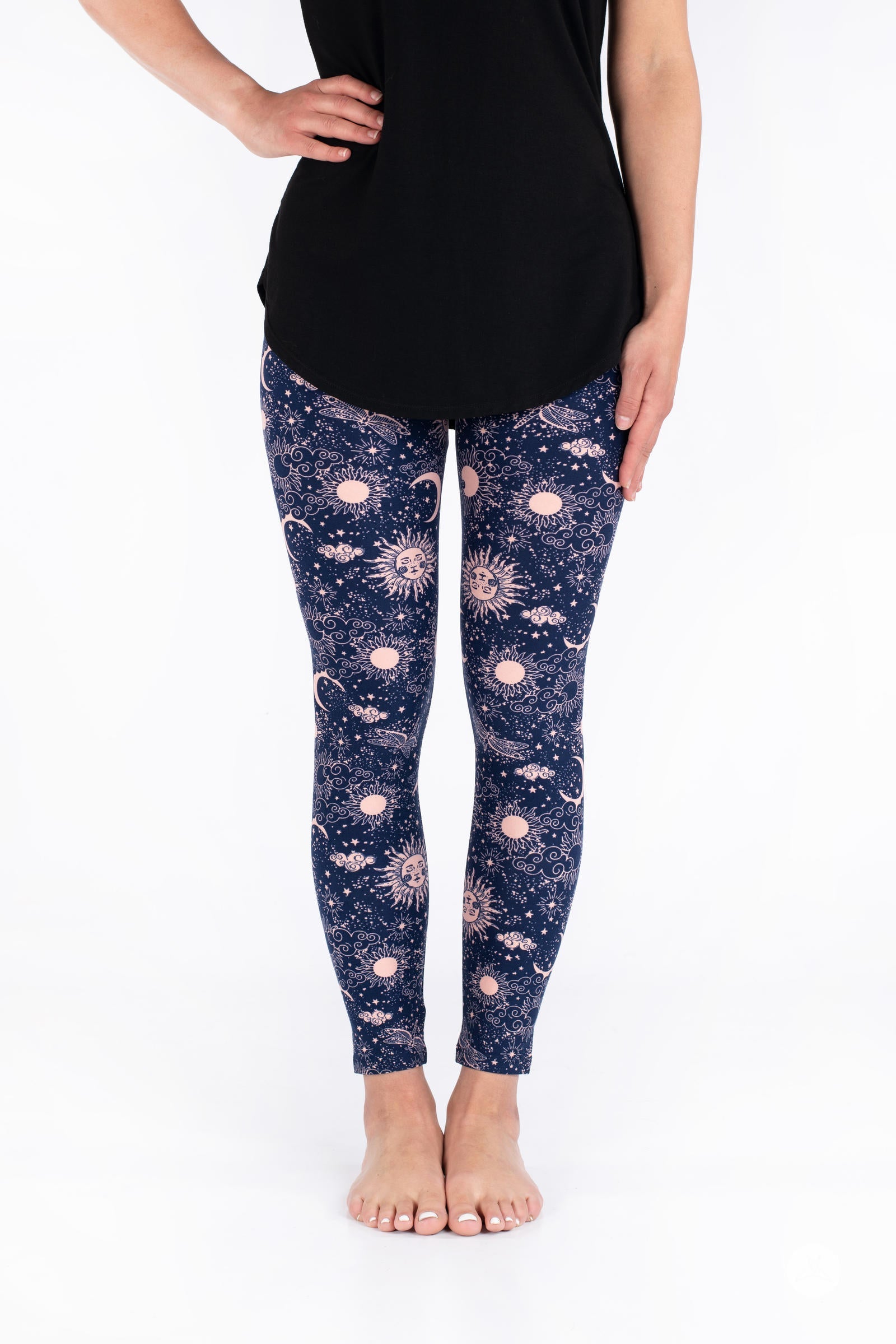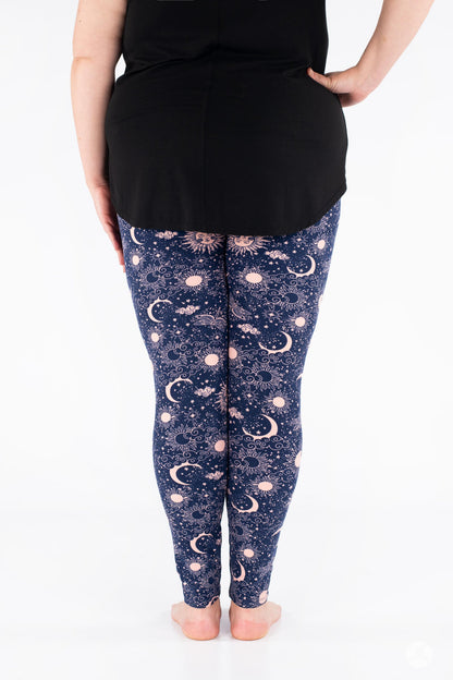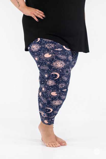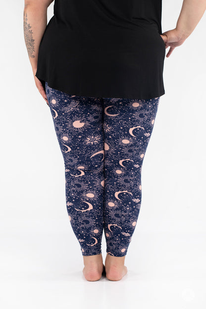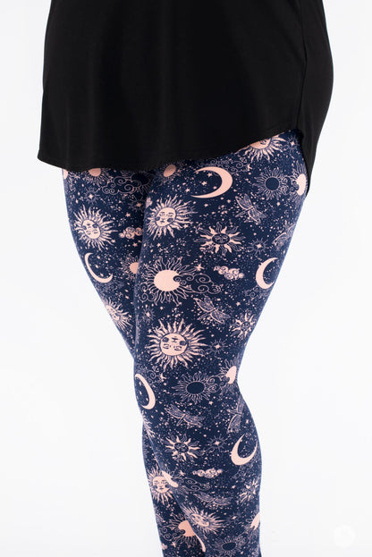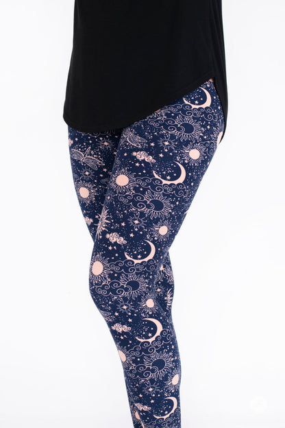Celestial Skies présente un design magique de soleils, de lunes, de libellules et d'étoiles dans un magnifique rose blush, le tout sur un fond bleu marine profond.