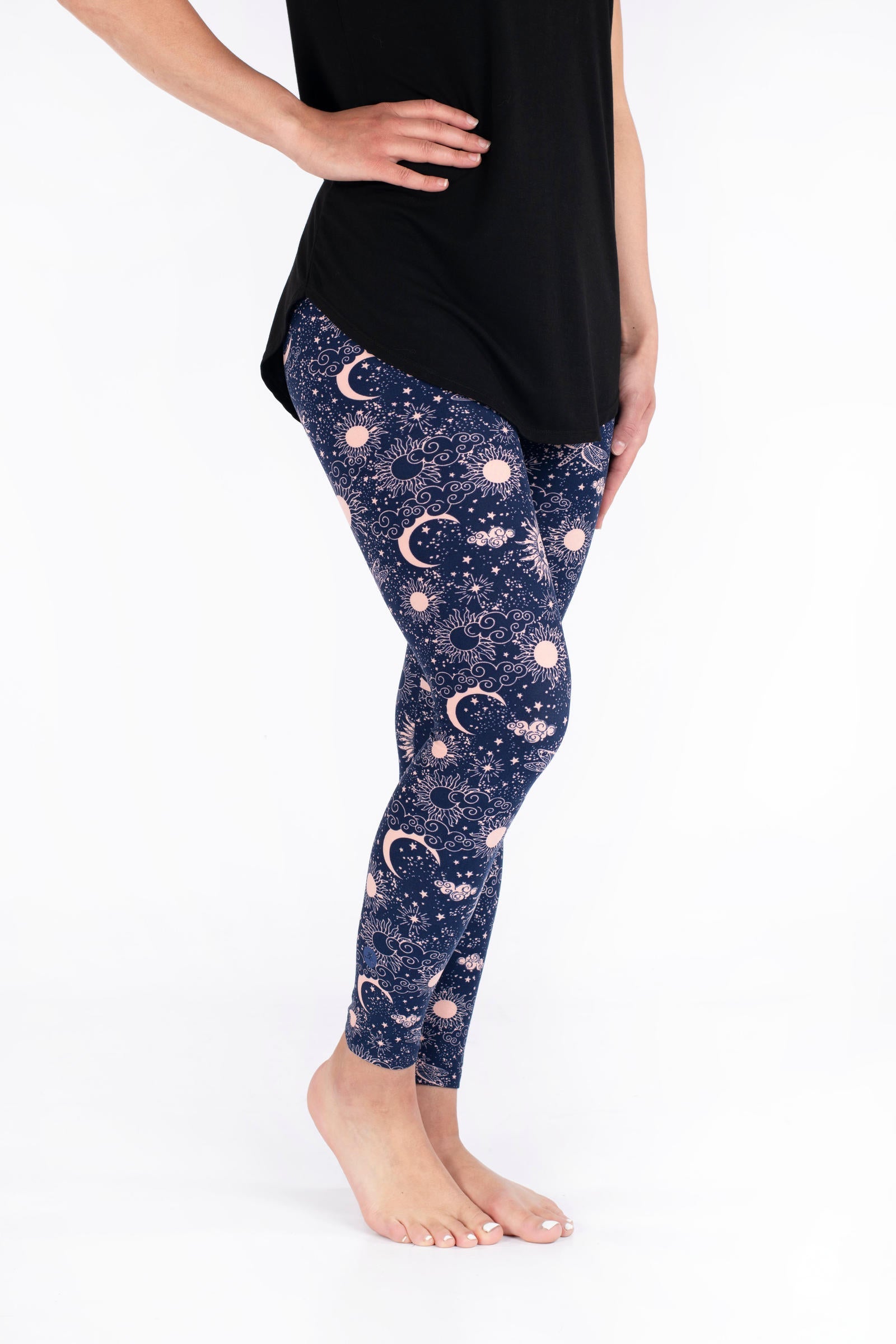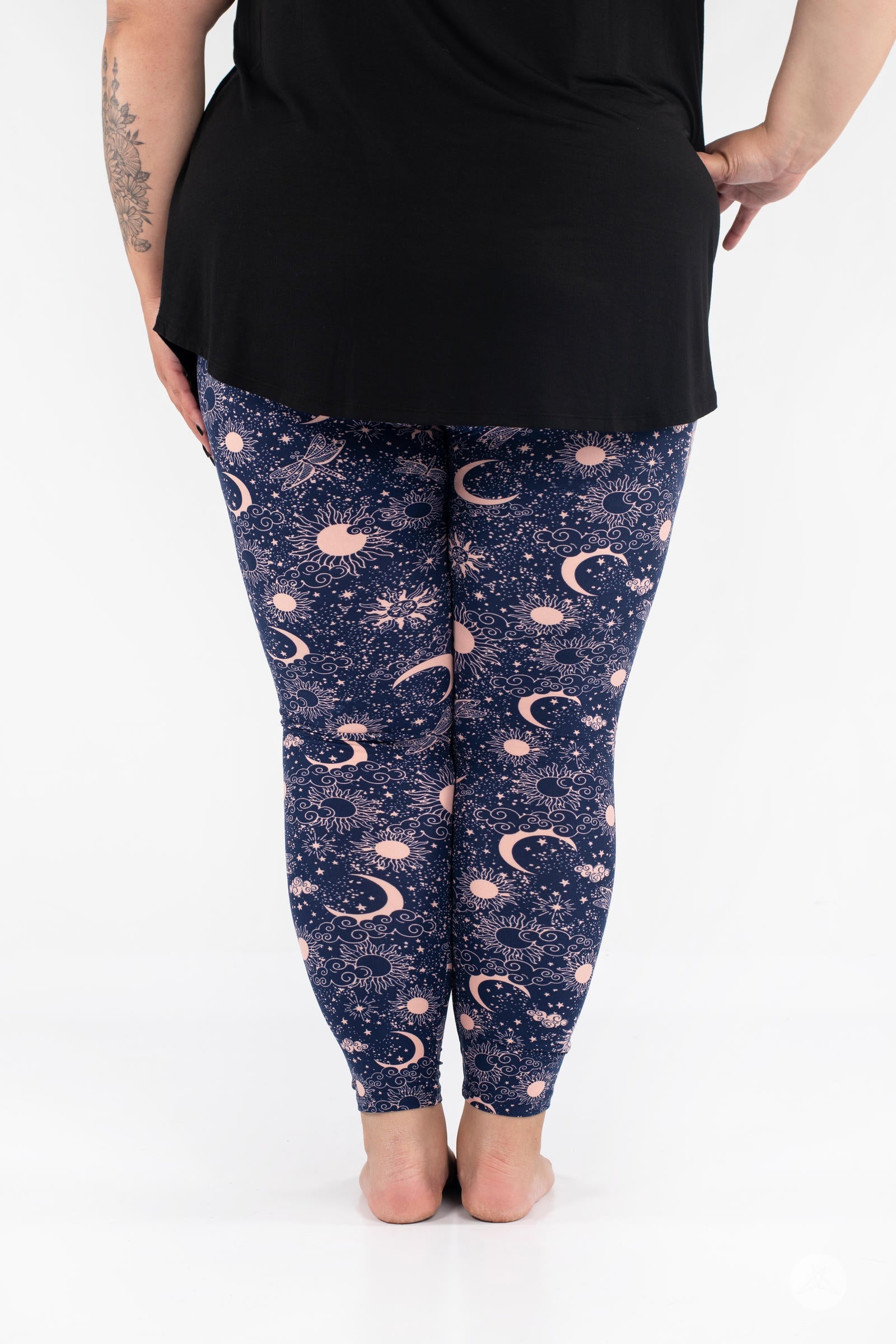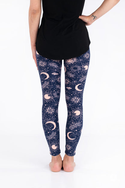 Celestial Skies présente un design magique de soleils, de lunes, de libellules et d'étoiles dans un magnifique rose blush, le tout sur un fond bleu marine profond.