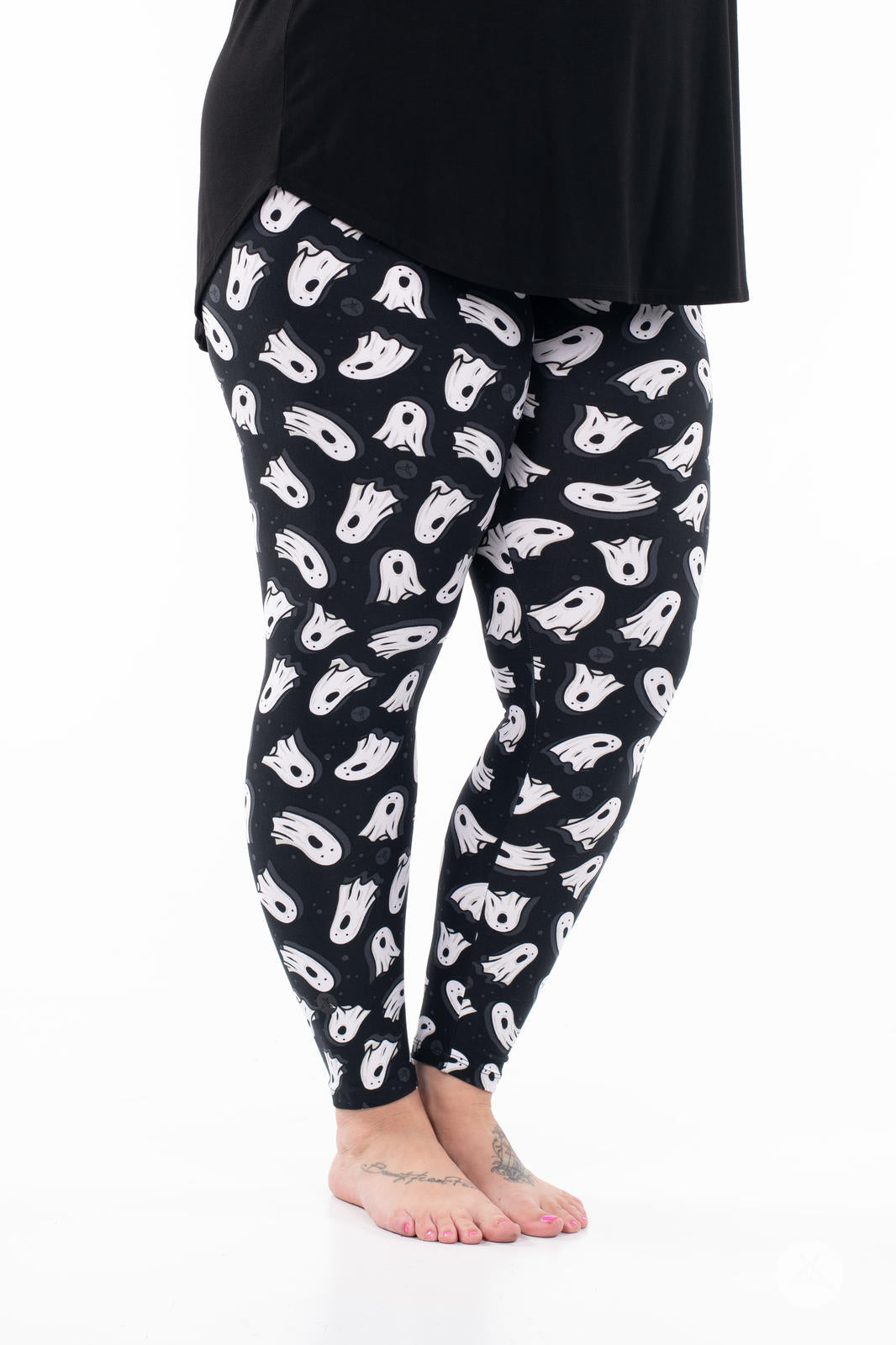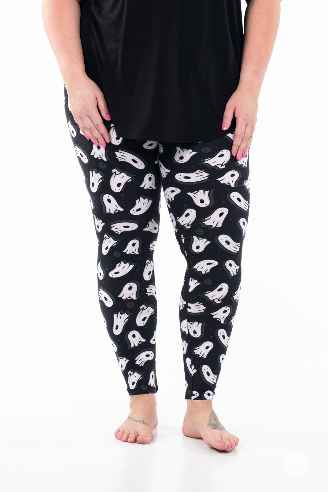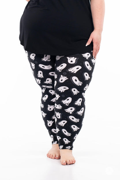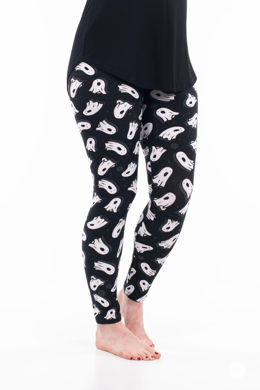 Les leggings You've Been Ghosted présentent de charmants fantômes de dessins animés sur un fond noir élégant. Parfait pour la saison d’Halloween, vous aurez l’air superbe !