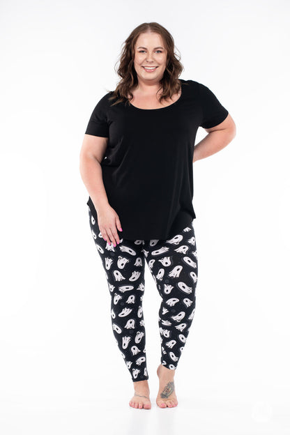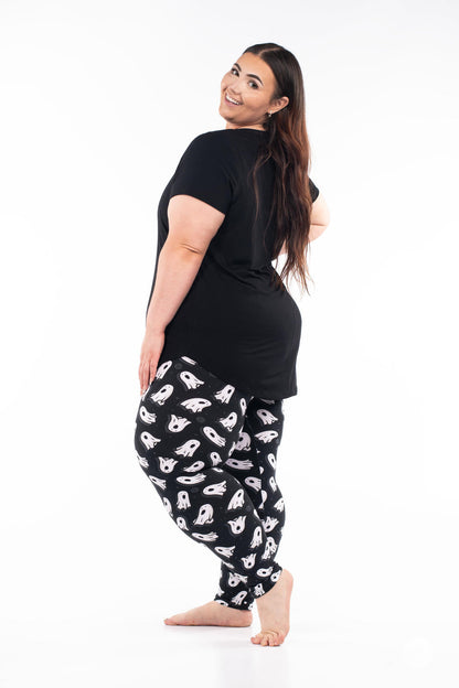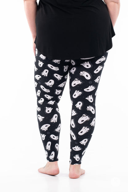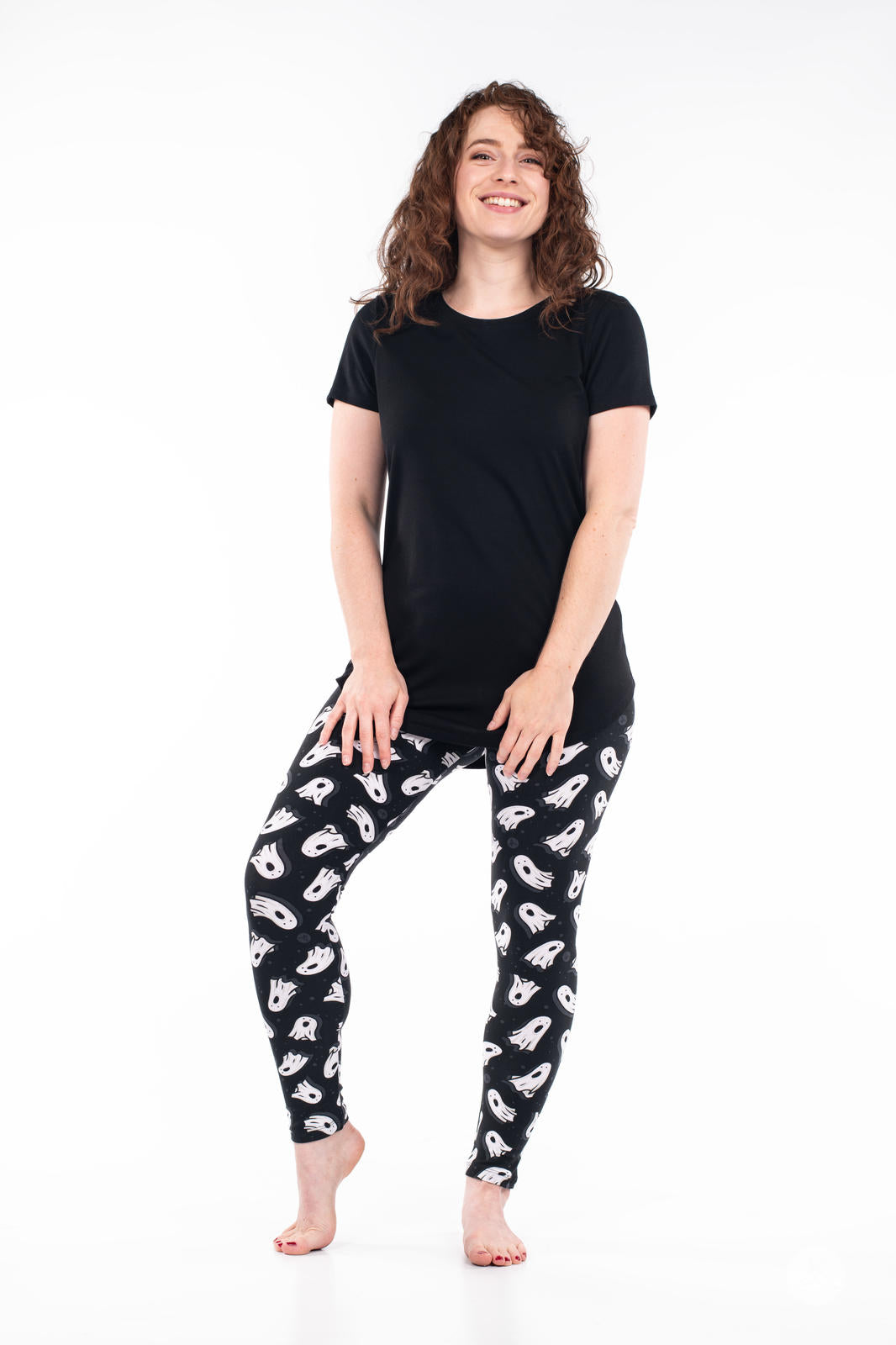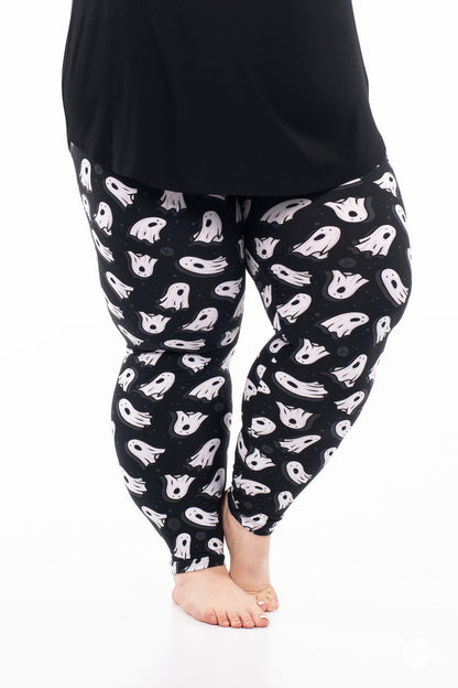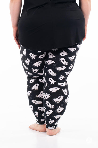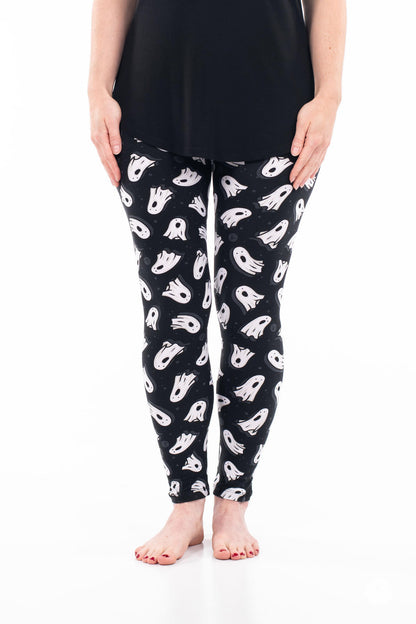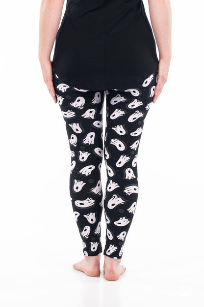 Les leggings You've Been Ghosted présentent de charmants fantômes de dessins animés sur un fond noir élégant. Parfait pour la saison d’Halloween, vous aurez l’air superbe !