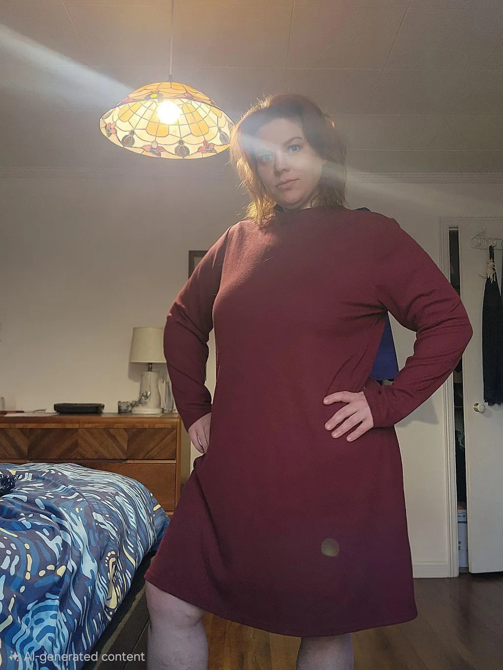 Beautiful dress and color. However, not a huge fan of the material against my skin. Also, the neck opening is a little too snug and the sleeves too tight.