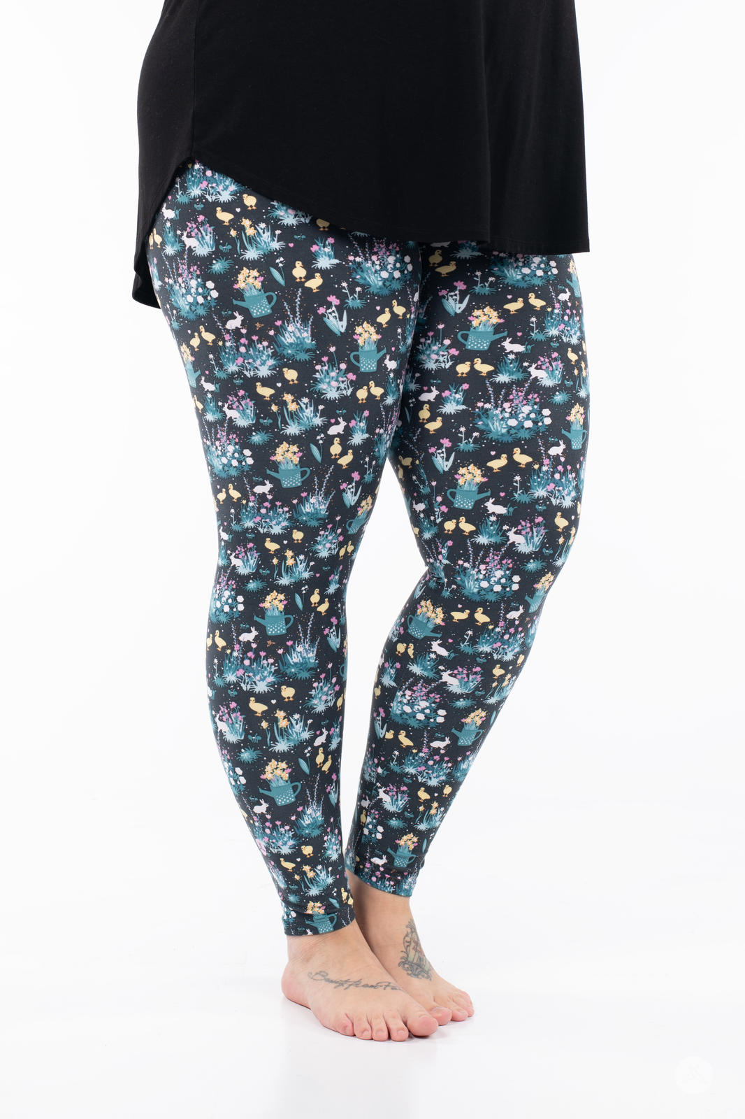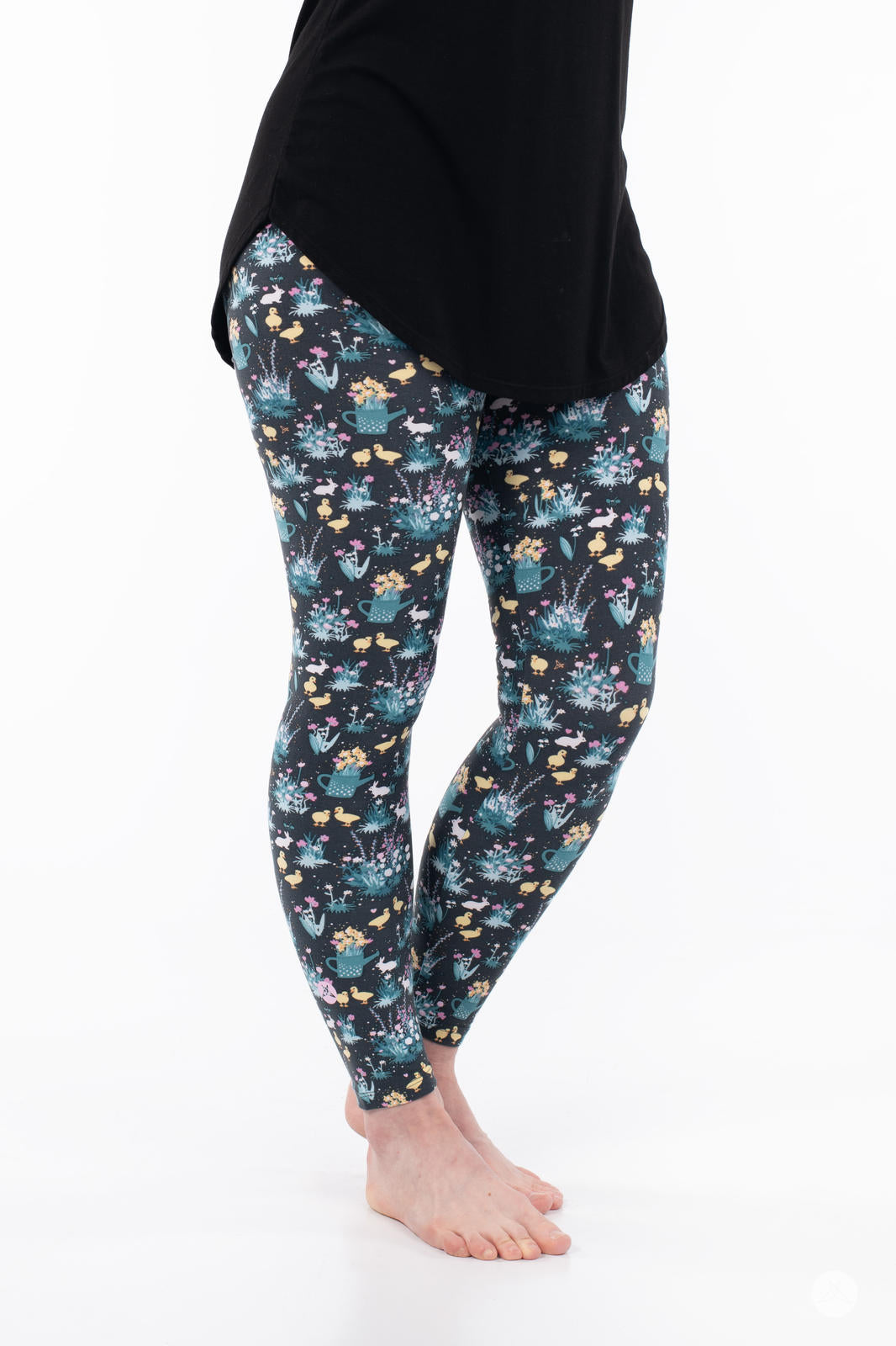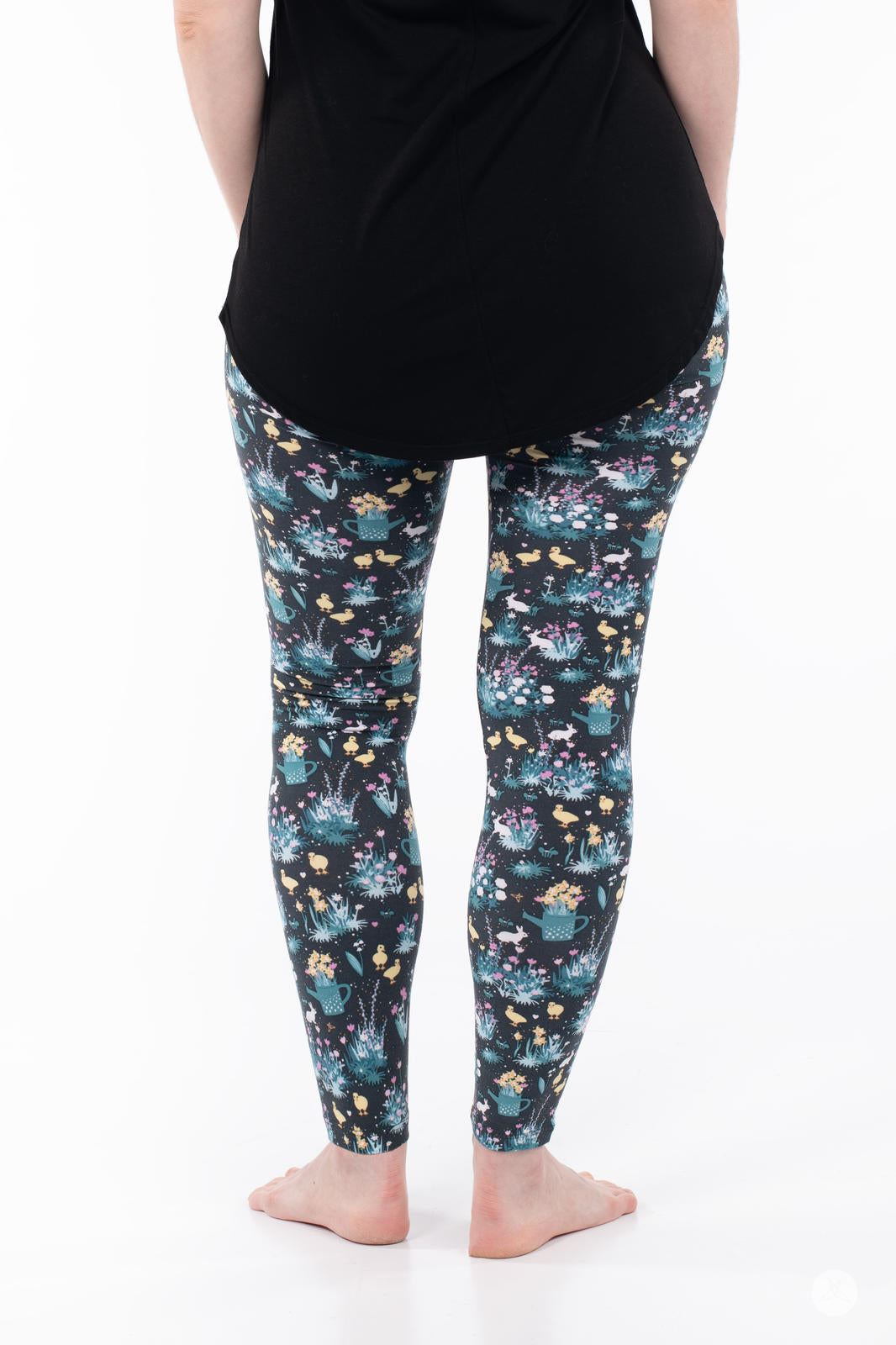 Profitez du confort avec ces leggings ludiques ! Spring Meadow présente la flore et la faune luxuriantes de la saison : des canards pimpants aux charmants lapins blancs et buissons fleuris.