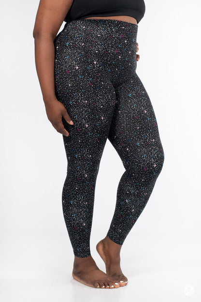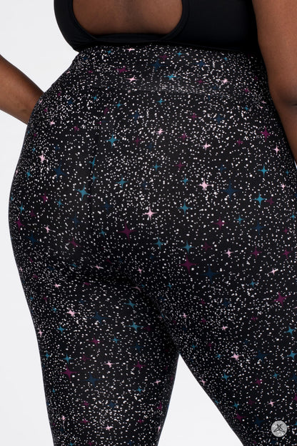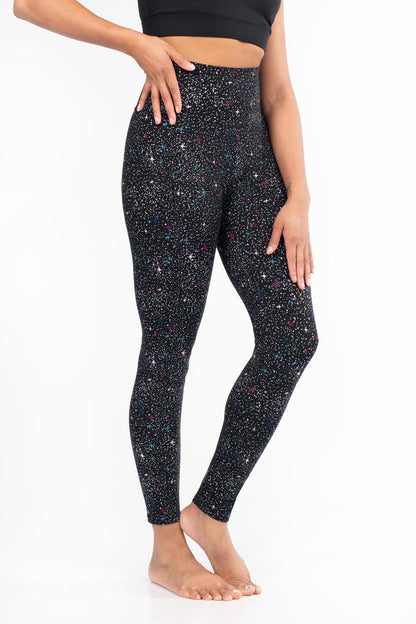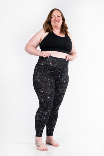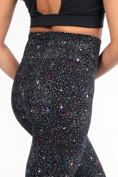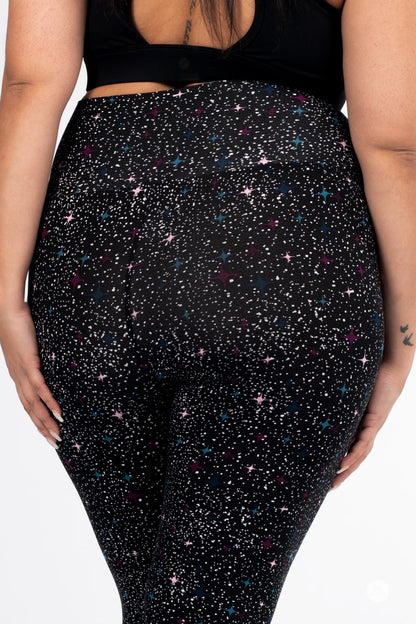 Imagine spotting the Milky Way galaxy on a clear night - these dazzling leggings bring that vision to life! Featuring a mesmerizing black backdrop scattered with twinkling stars in shades of purple, blue, and white, they’re perfect for anyone who loves a cosmic vibe. These high-waisted leggings feature a non-elasticized yoga style waistband for a sleek silhouette and secure fit.