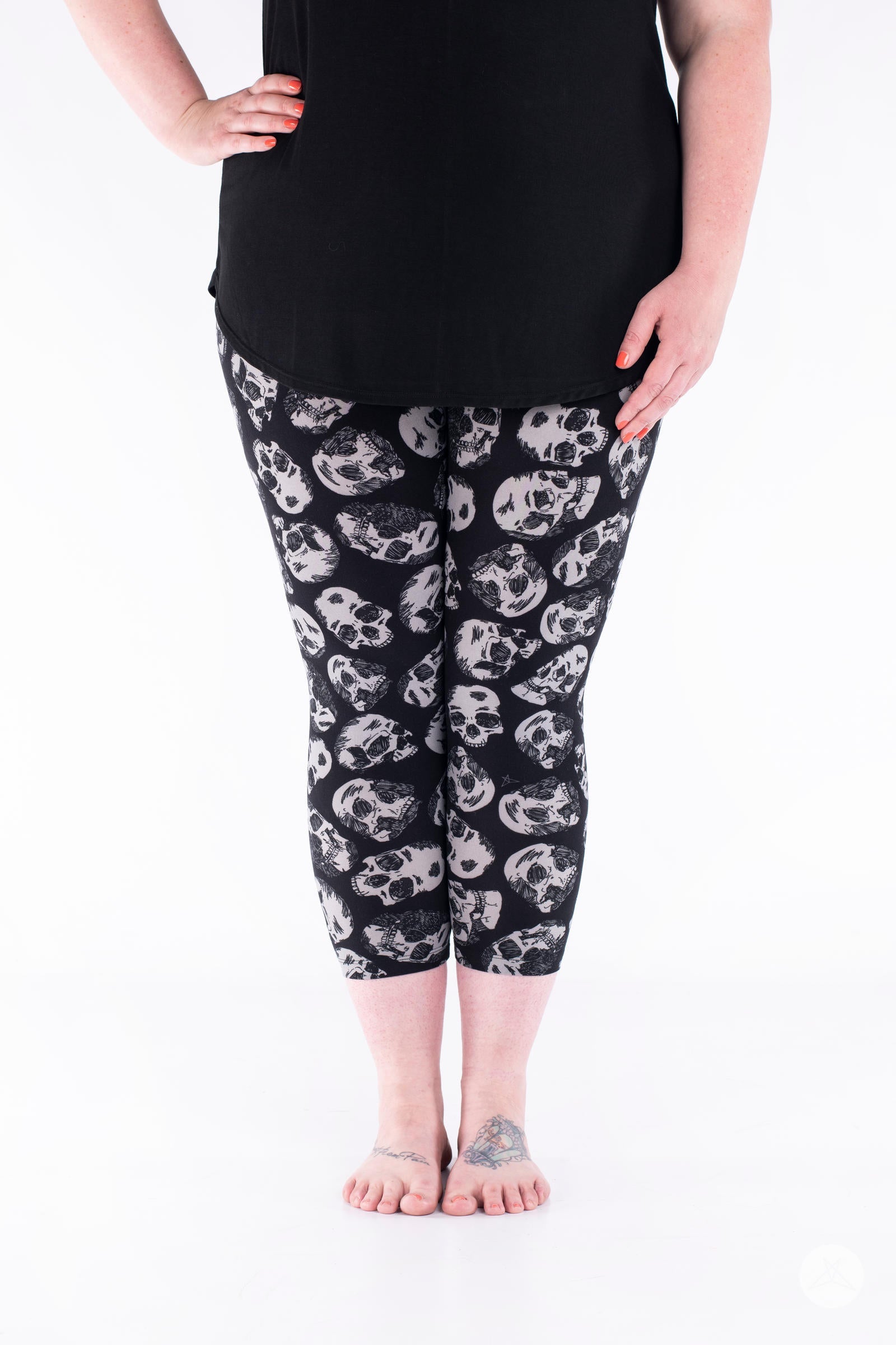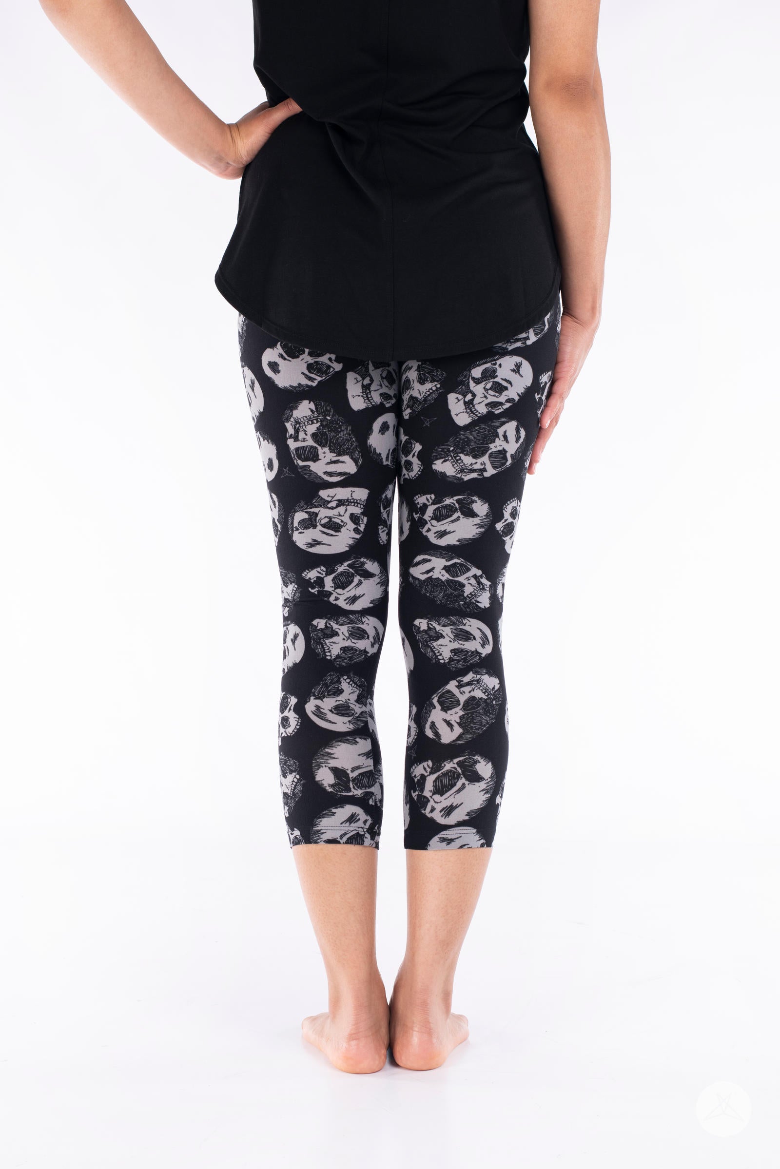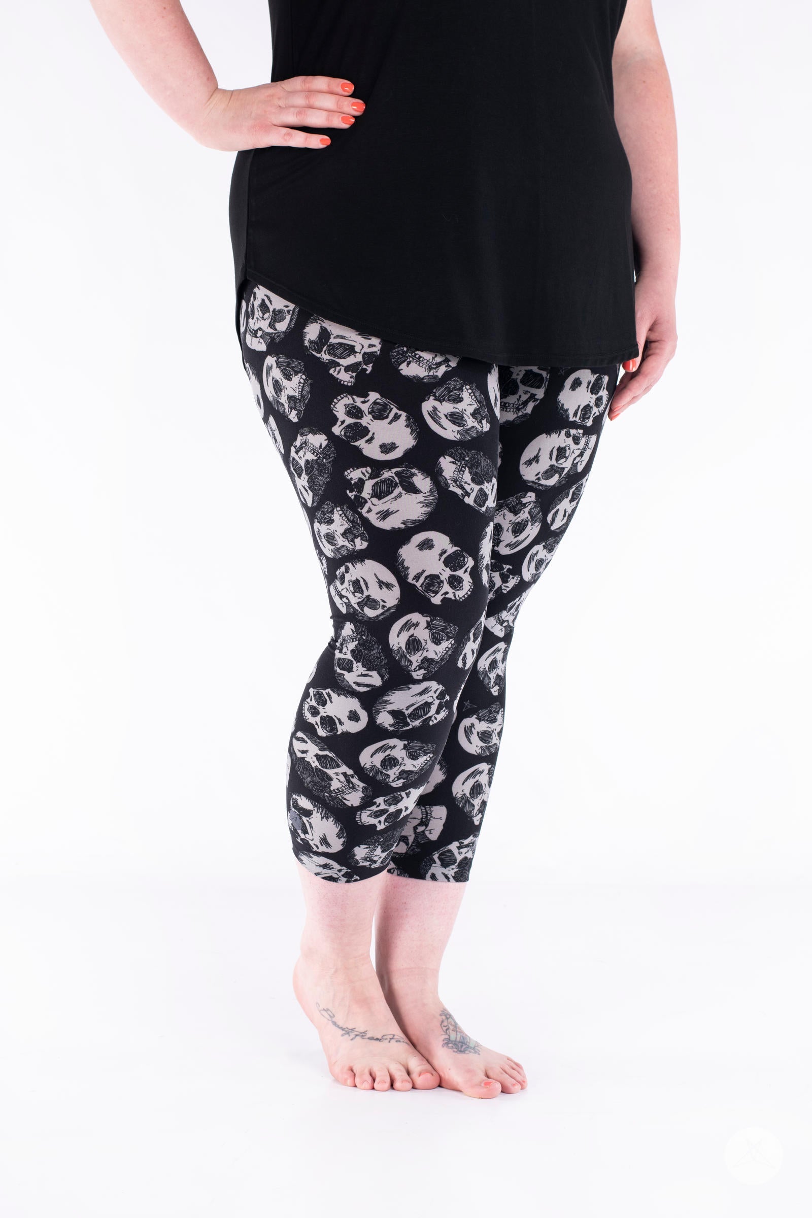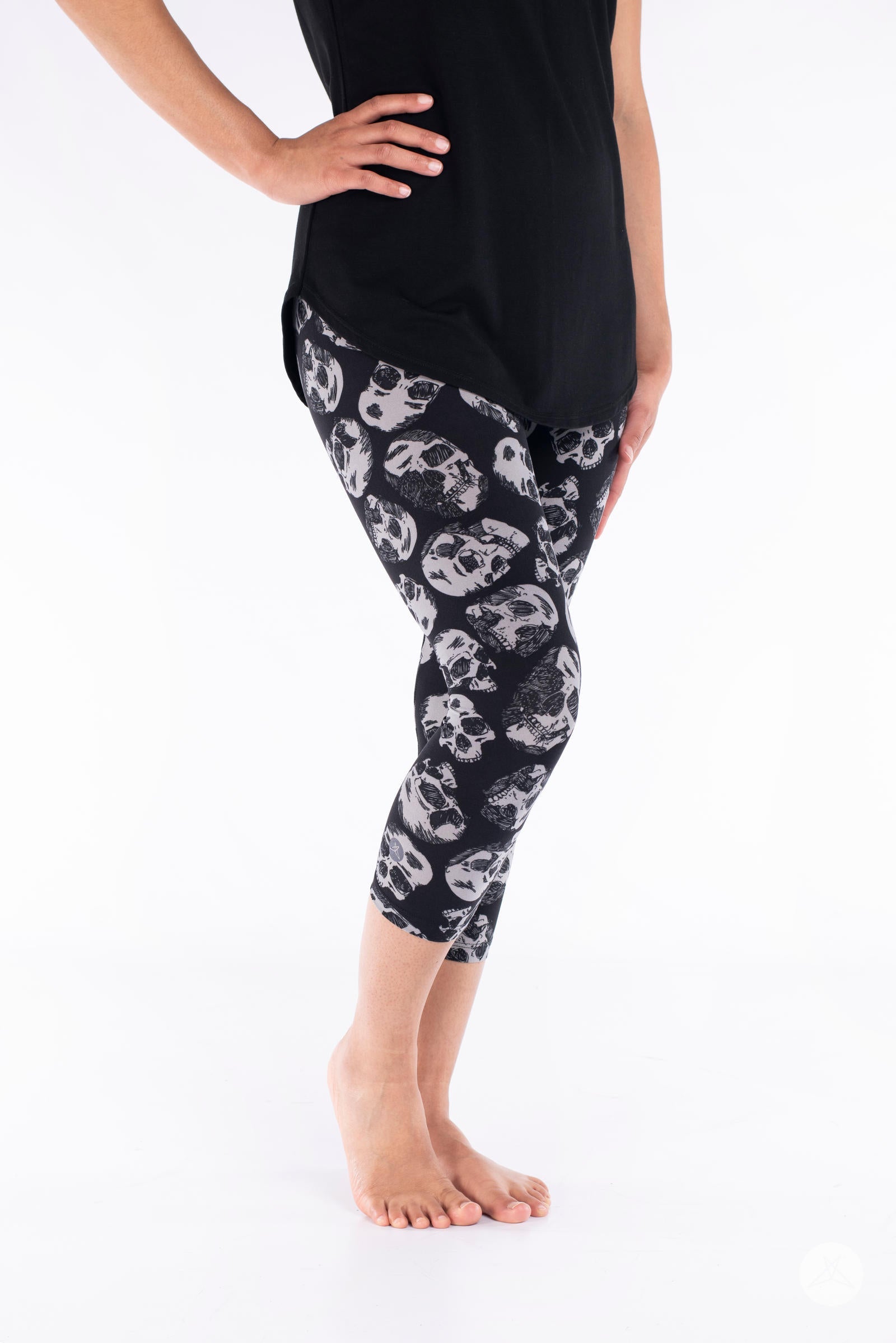 Nous adorons nous balancer dans ces leggings courts noirs à imprimé tête de mort et les associer à un SweetTops.T-shirt classiqueen blanc.