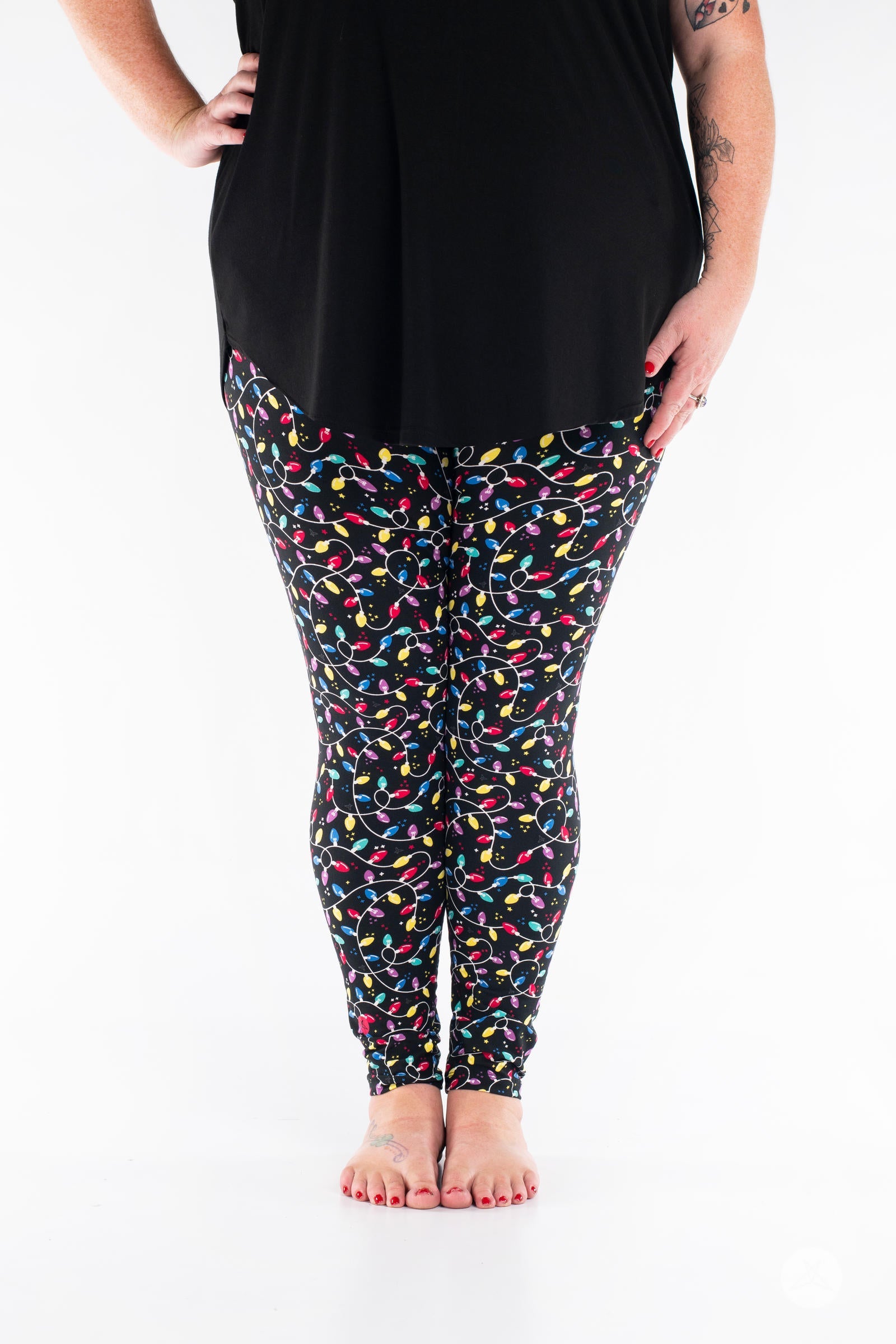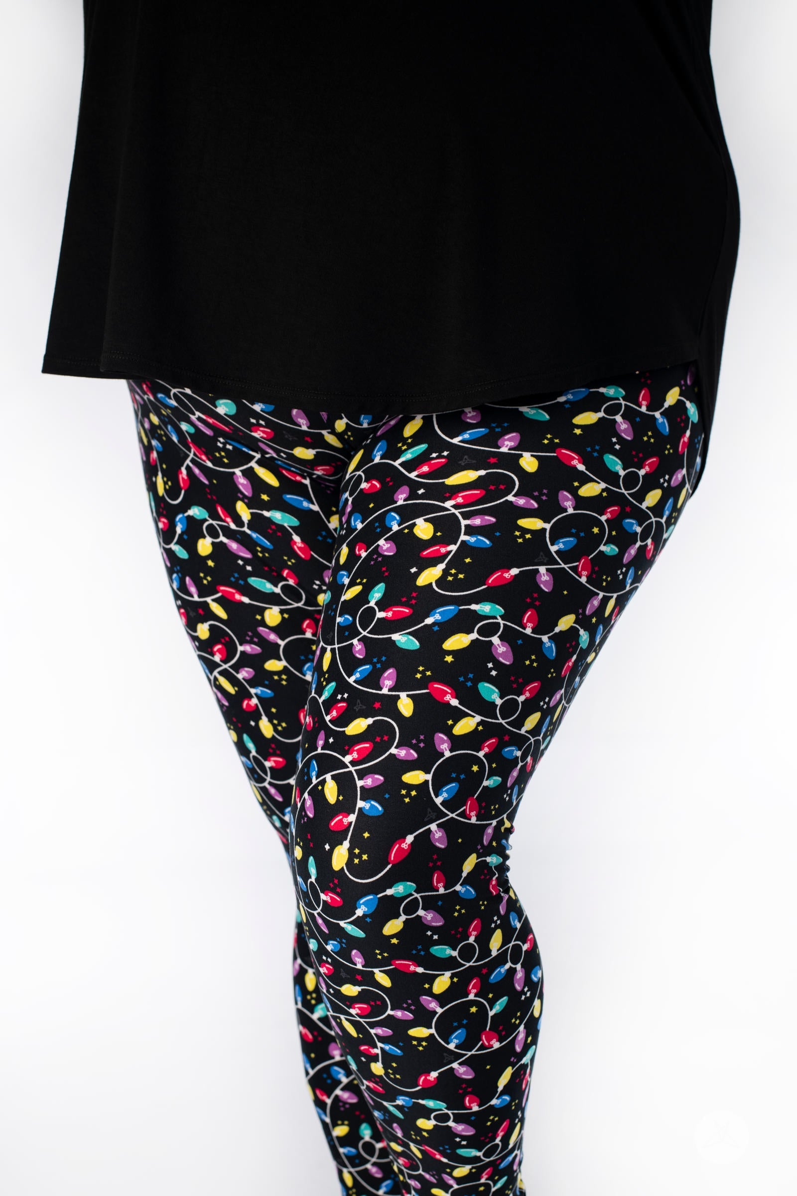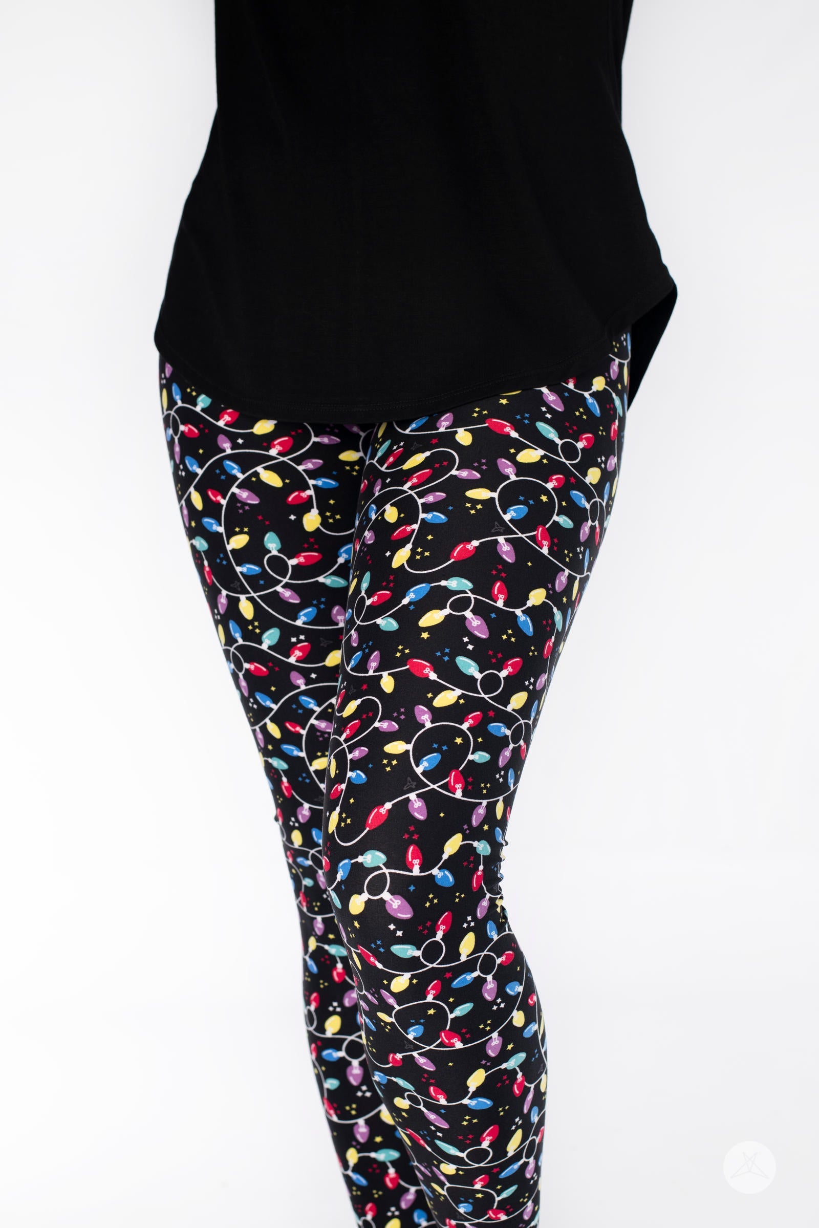 Light up your life in De-Lightful SweetLegs, a bright addition to our limited edition 2021 holiday leggings collection! This extra fun print features sparkly purple, yellow, red, teal, and blue tree lights on a jet black background and will turn heads this holiday season wherever you go!