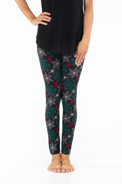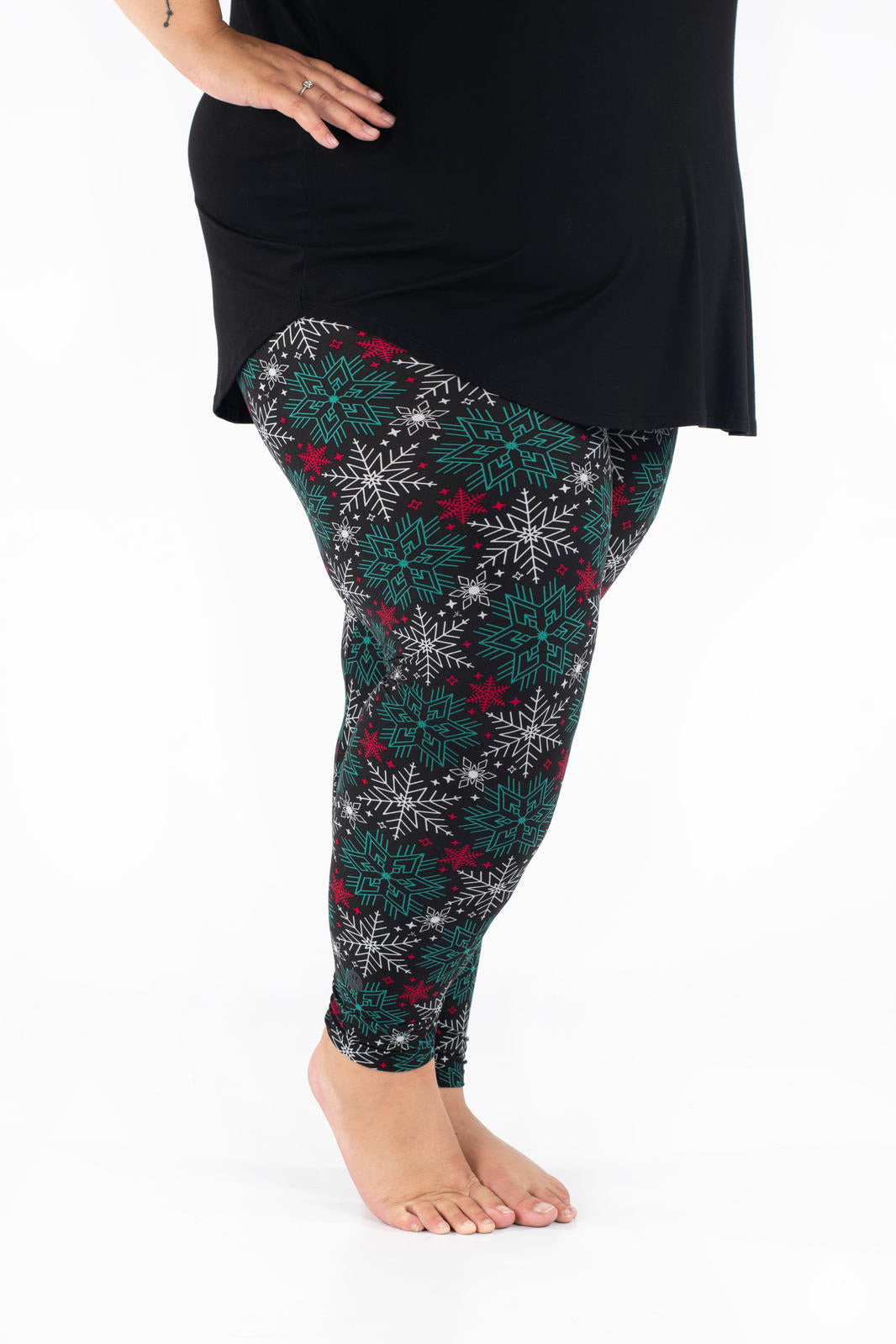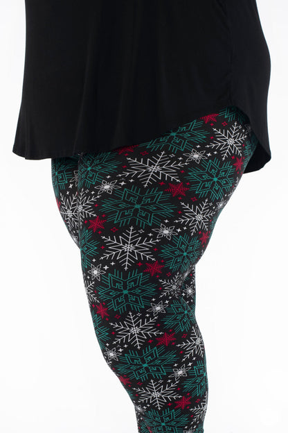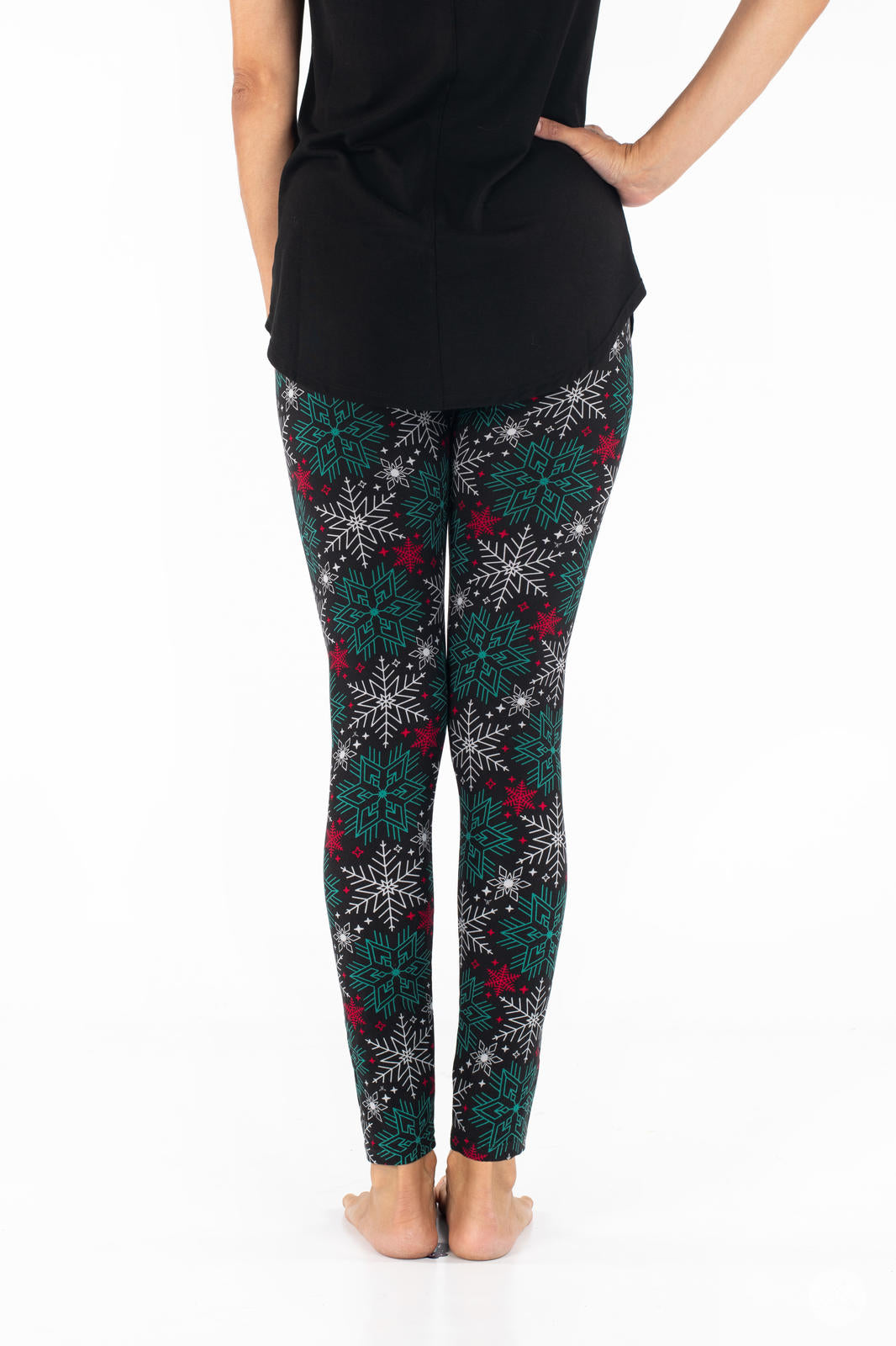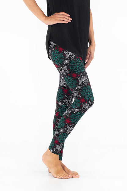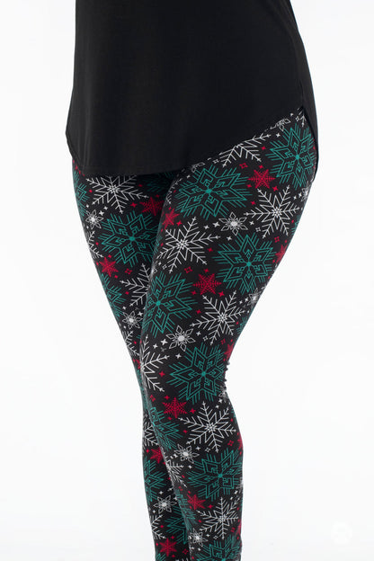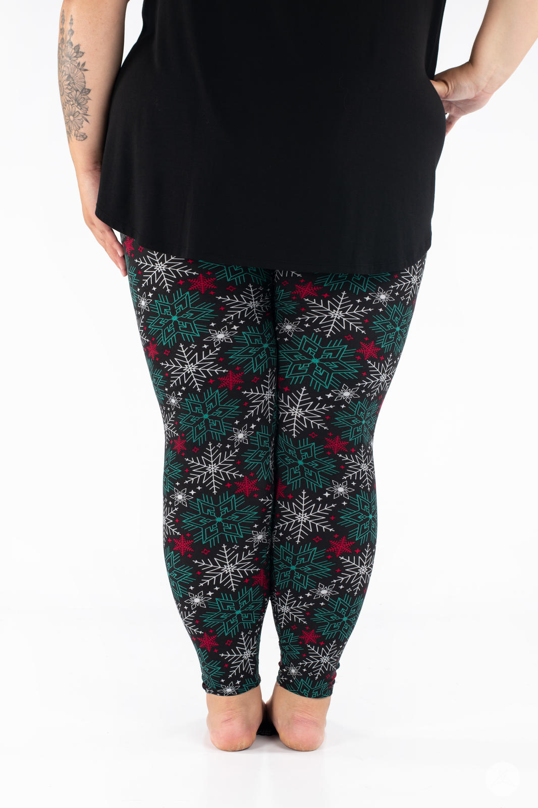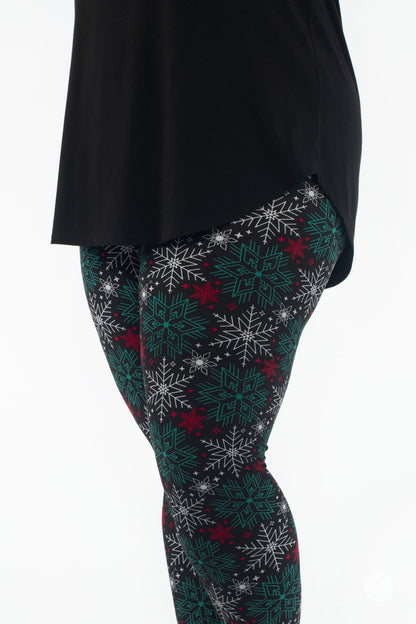 Snow It All est à la fois géométrique et fantaisiste, avec des flocons de neige graphiques en diagonale de différentes tailles en rouge houx, vert et blanc, le tout sur un fond noir.