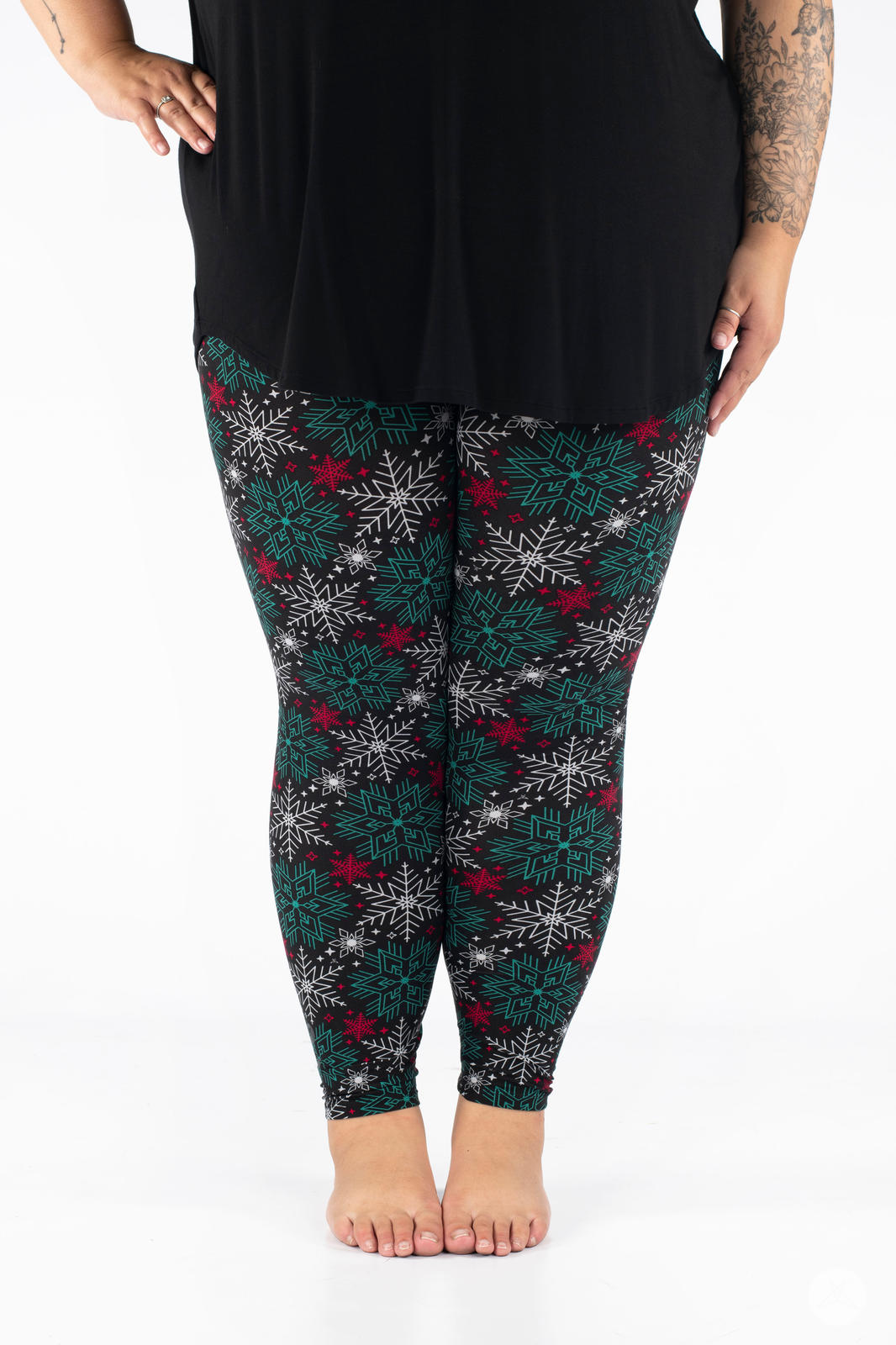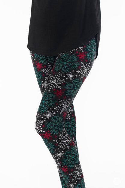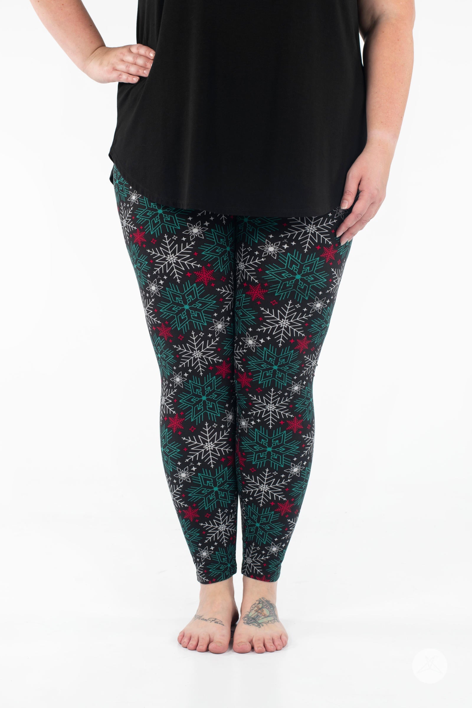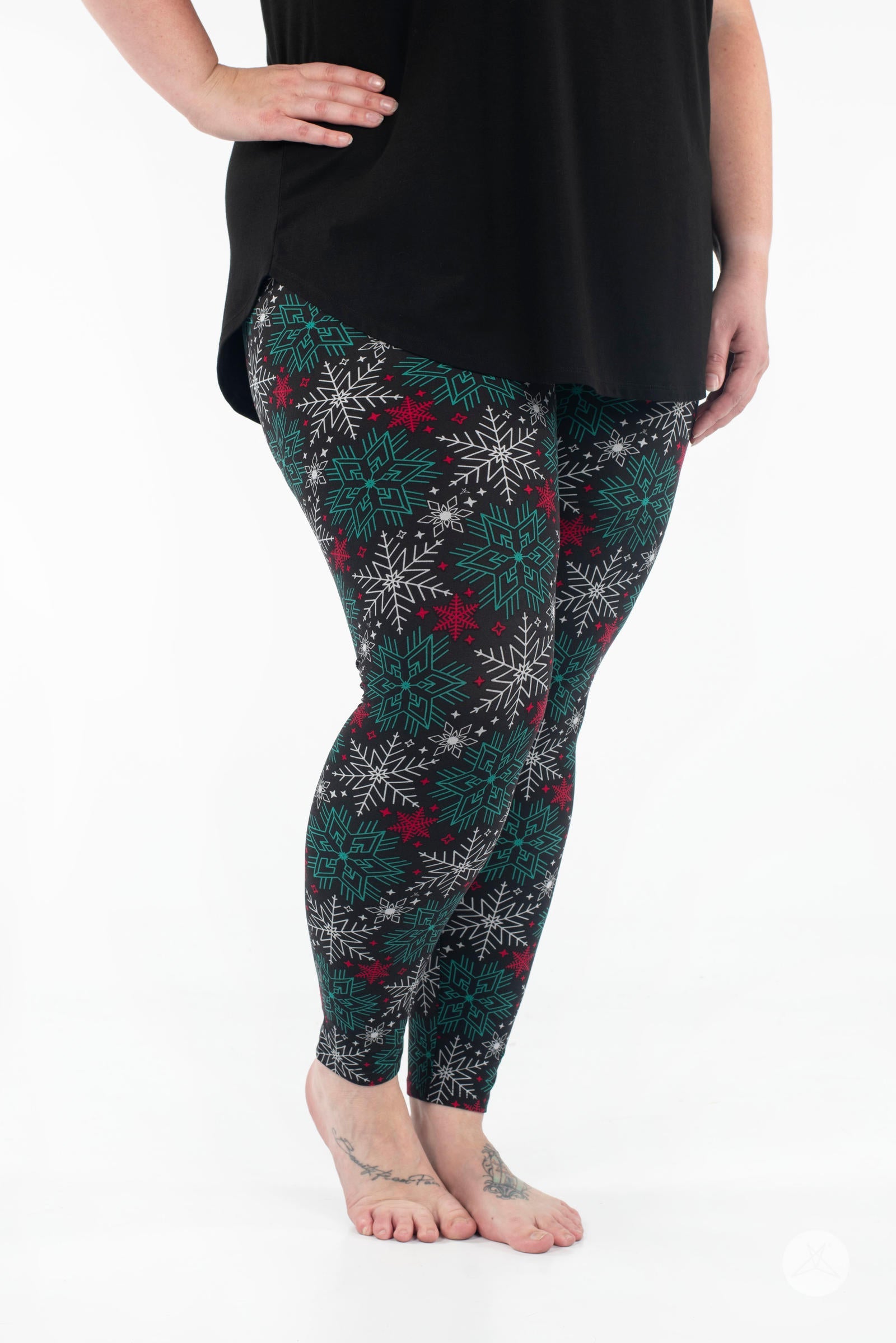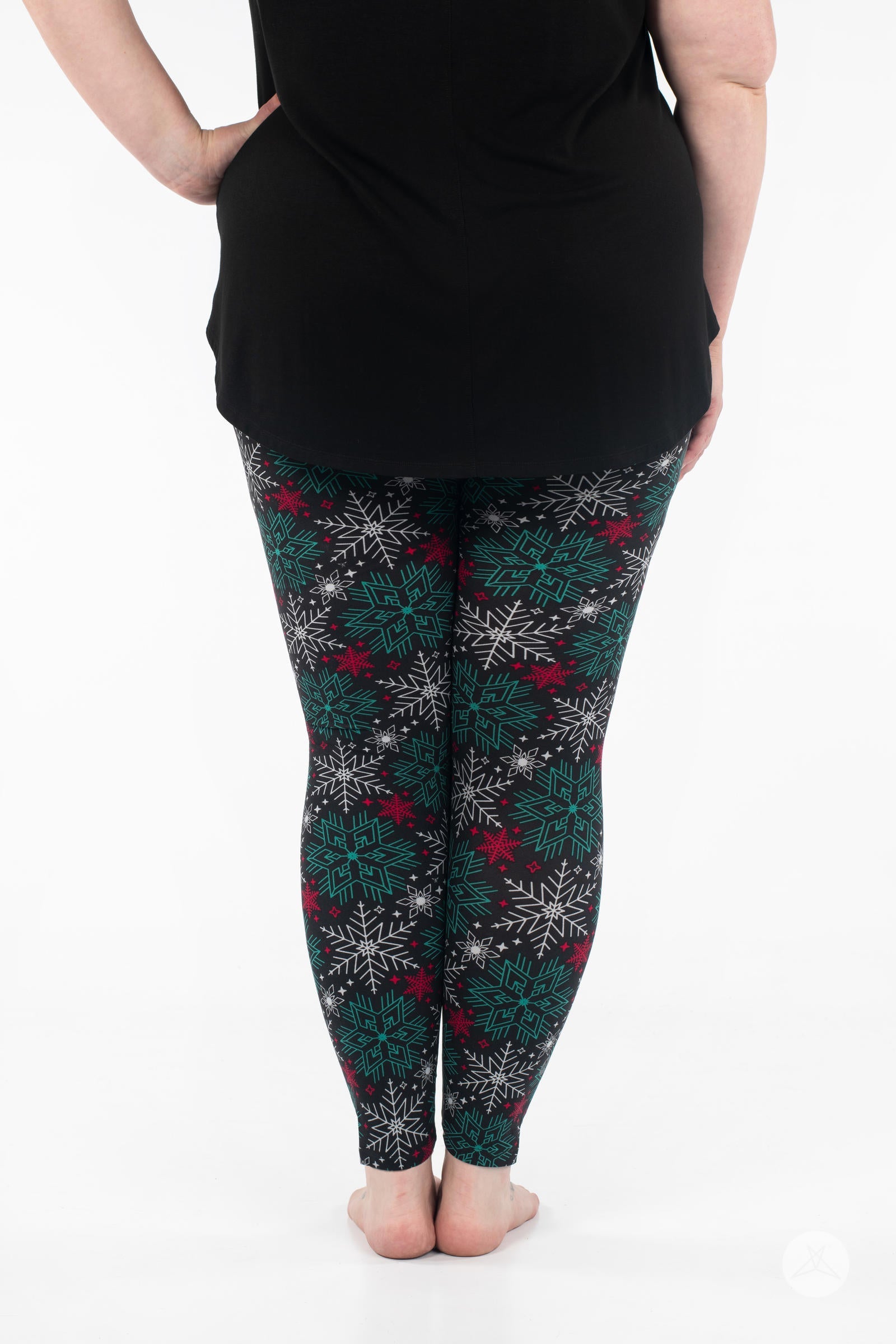 Snow It All est à la fois géométrique et fantaisiste, avec des flocons de neige graphiques en diagonale de différentes tailles en rouge houx, vert et blanc, le tout sur un fond noir.