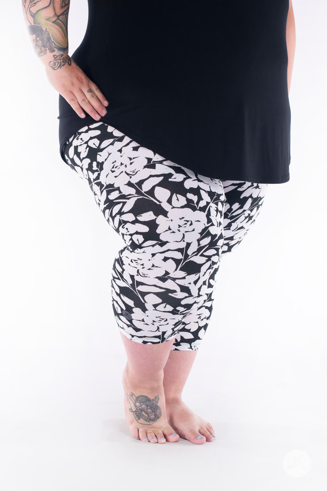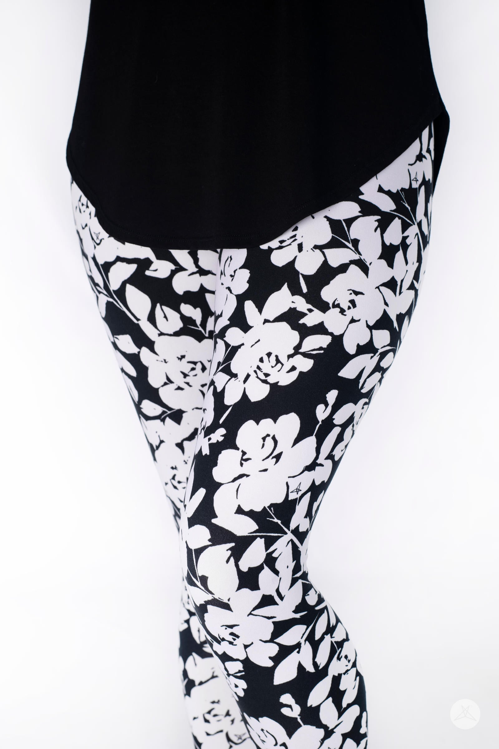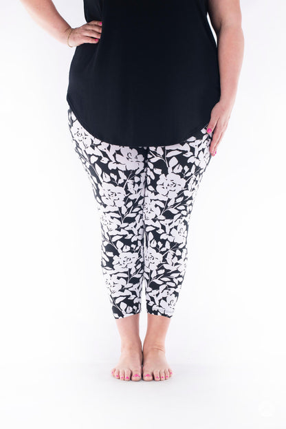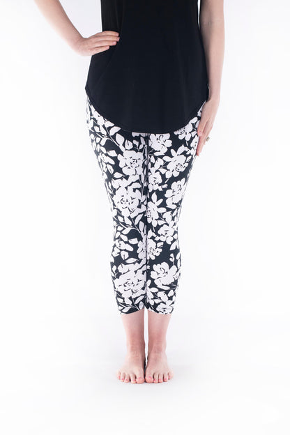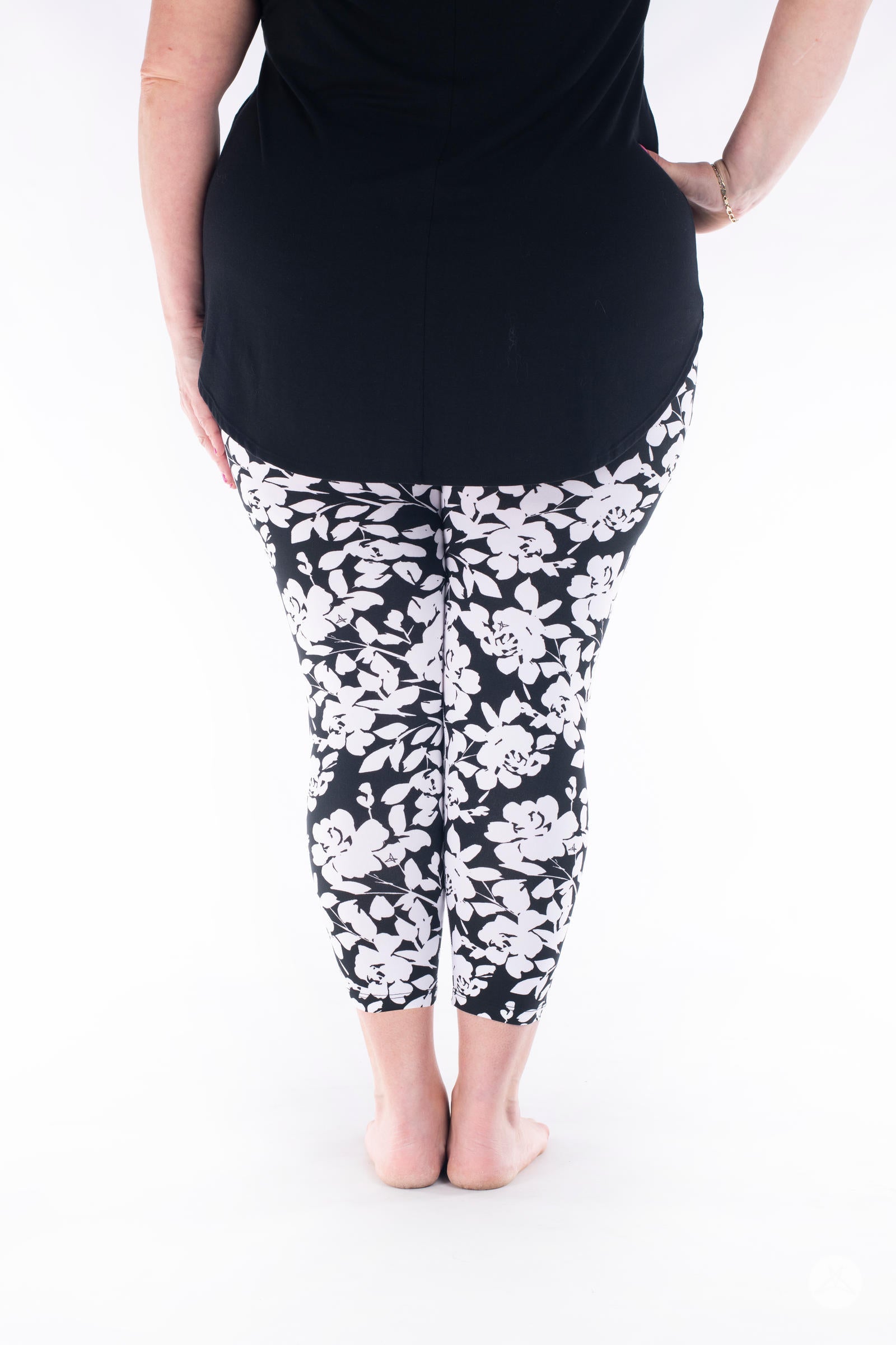 Elevate your everyday look with our Blossom Bash Crops. Featuring a bold black-and-white floral print, these soft, stretchy leggings offer timeless style and all-day comfort—perfect for lounging, errands, or a casual night out.