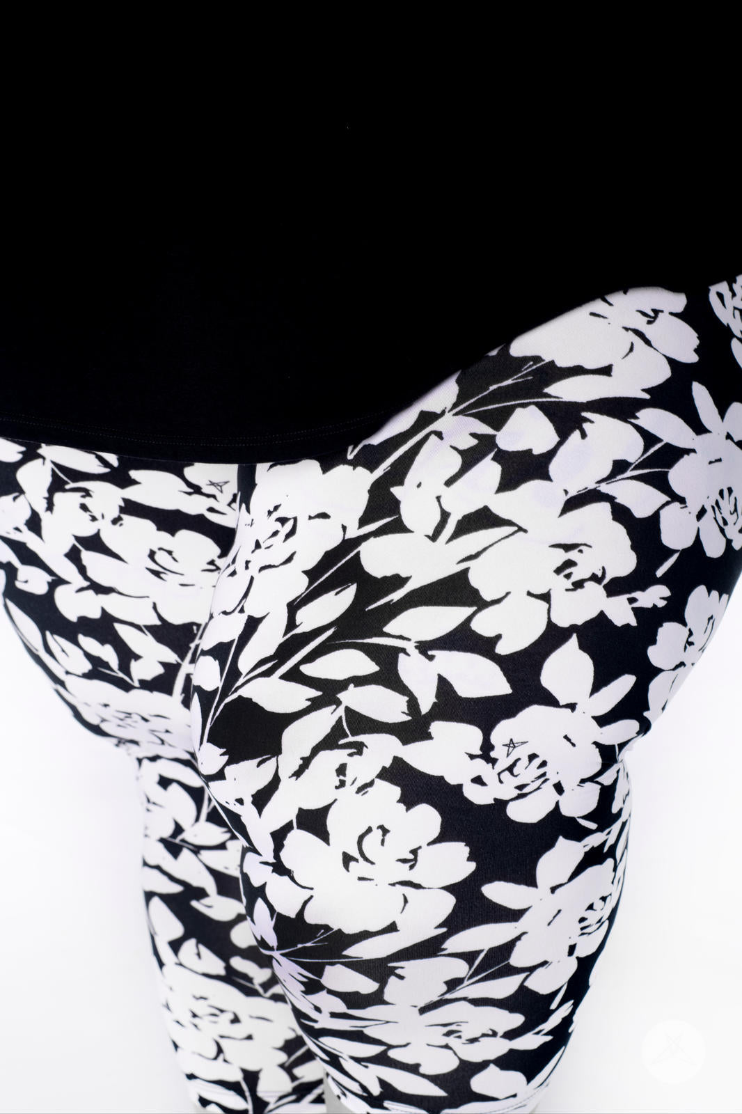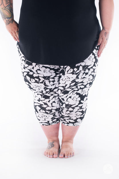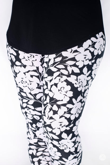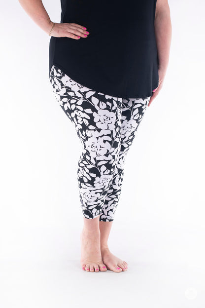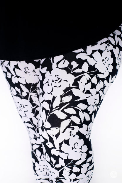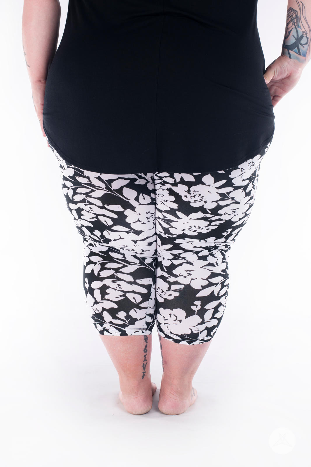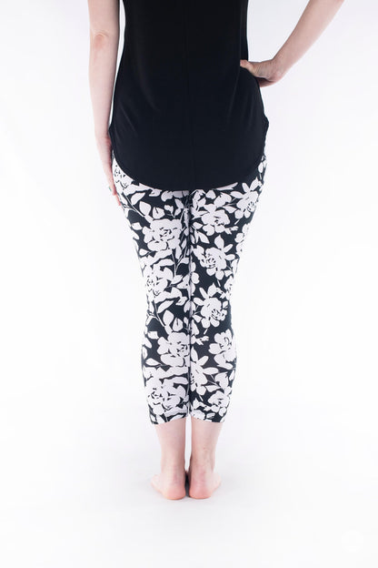 Elevate your everyday look with our Blossom Bash Crops. Featuring a bold black-and-white floral print, these soft, stretchy leggings offer timeless style and all-day comfort—perfect for lounging, errands, or a casual night out.