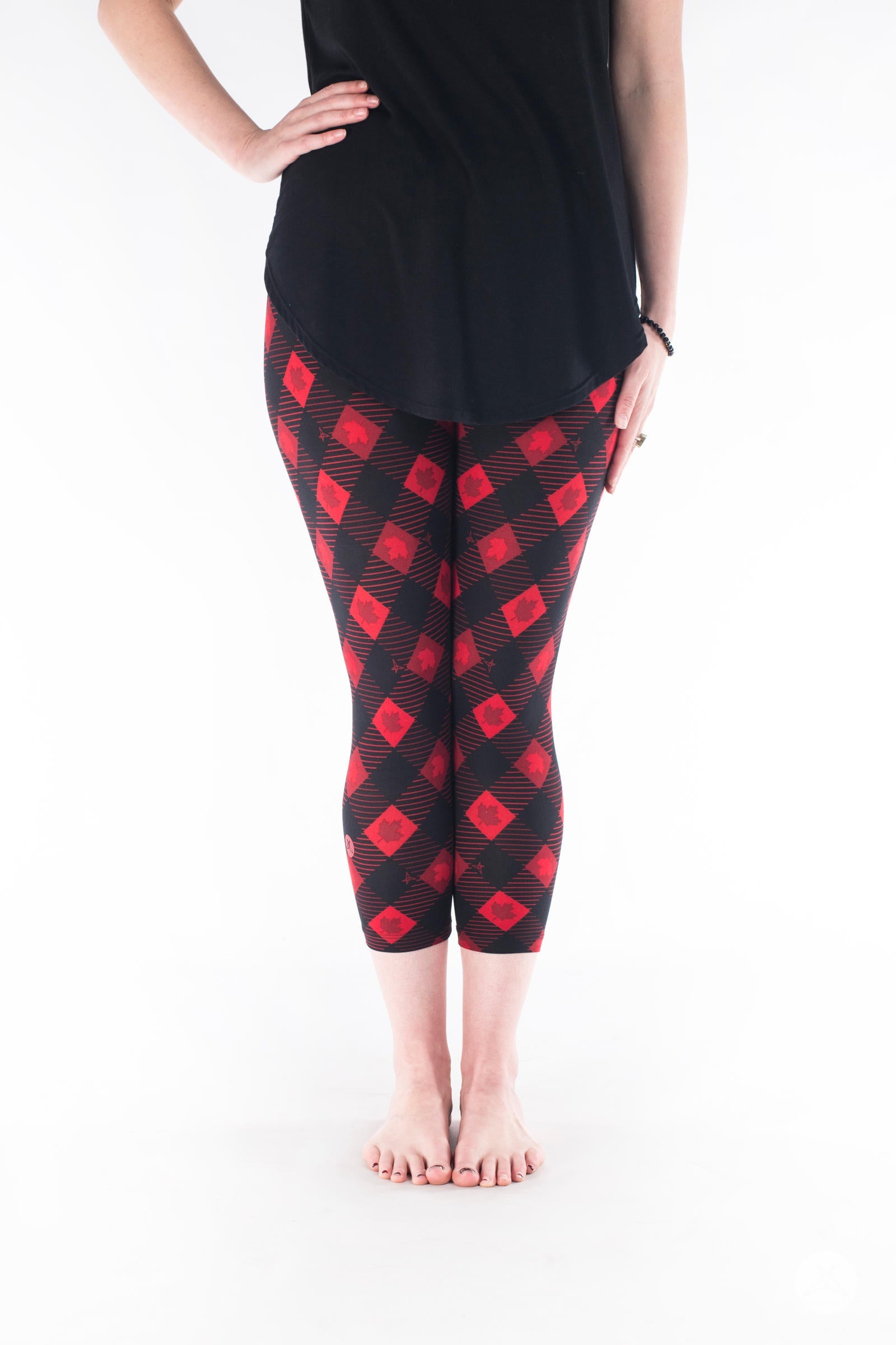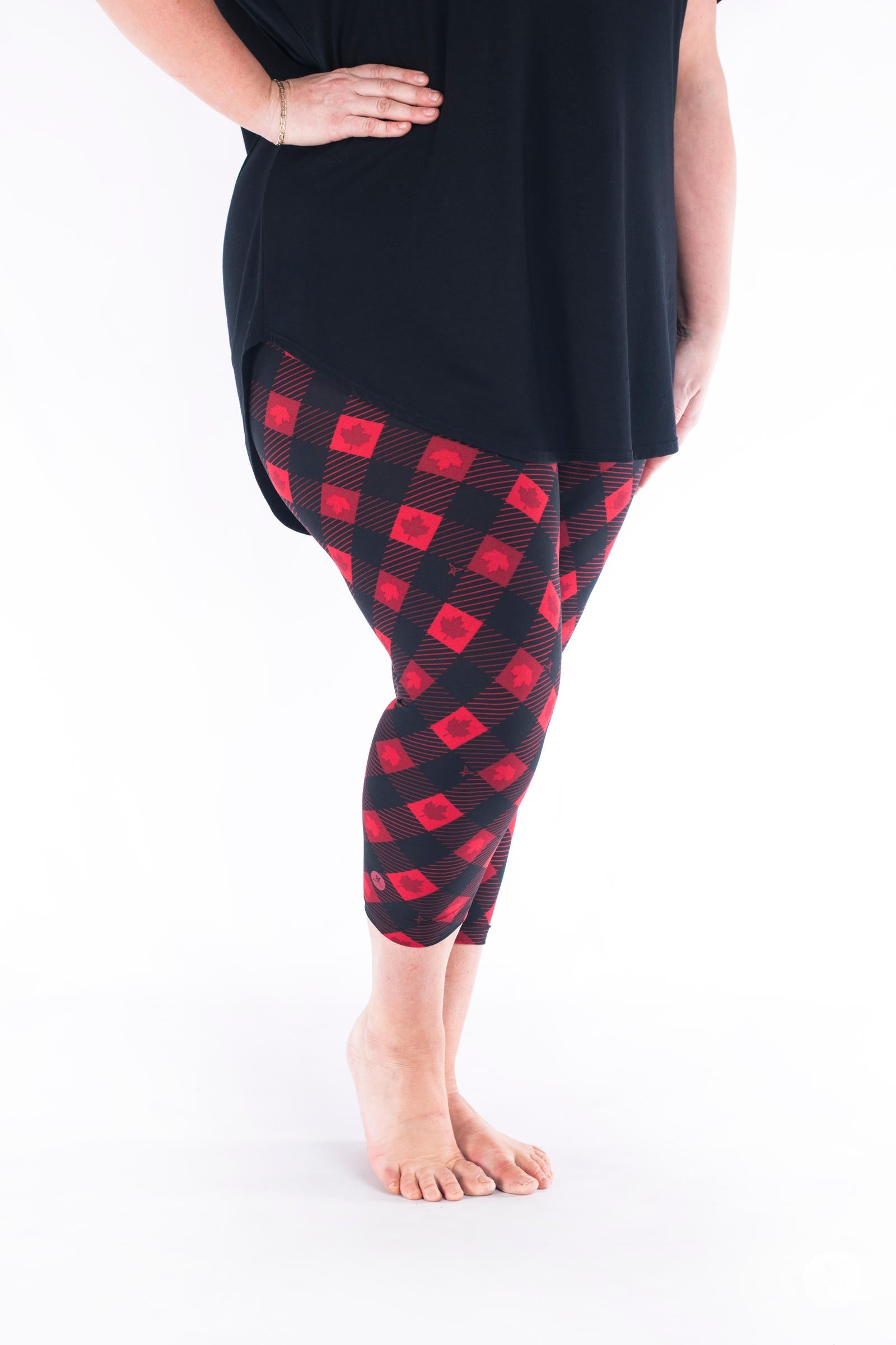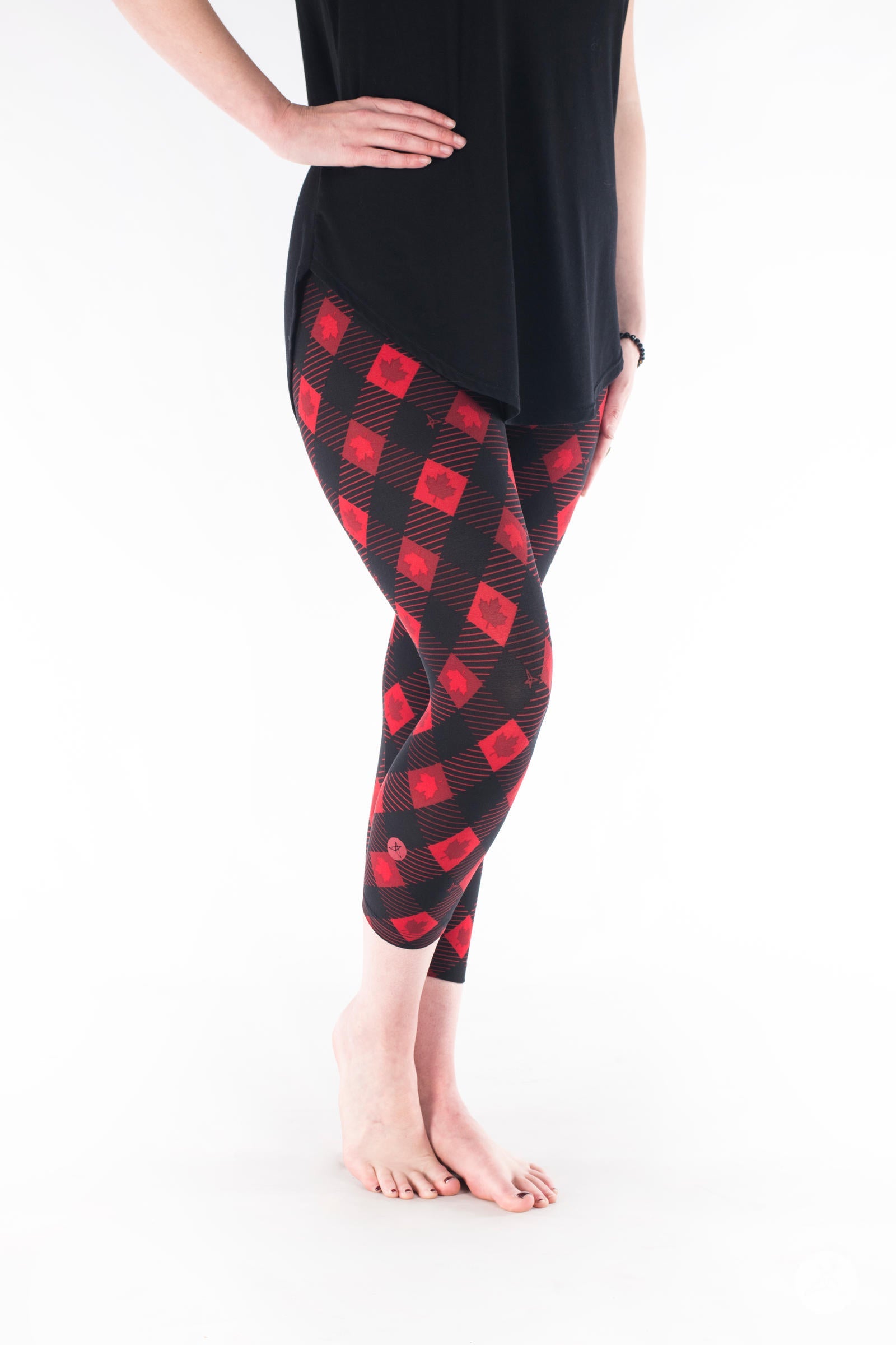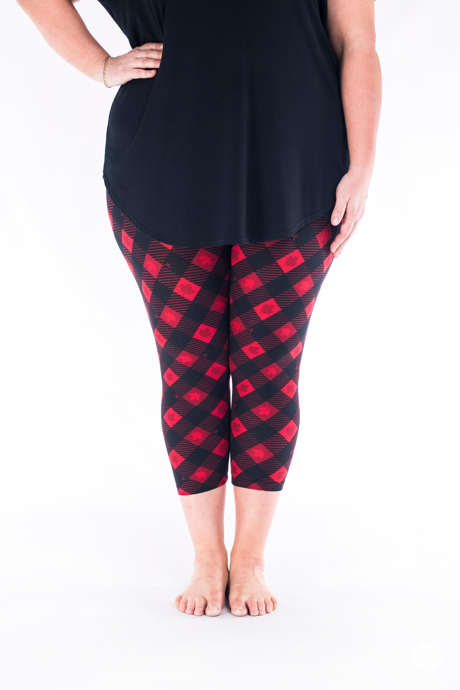 Canada Strong Crops feature a black and red maple leaf plaid print that pairs perfectly with a SweetTops Classic Tee in White, a cropped windbreaker, your favourite slides, and a matching Canada Strong Scrunchie!