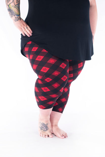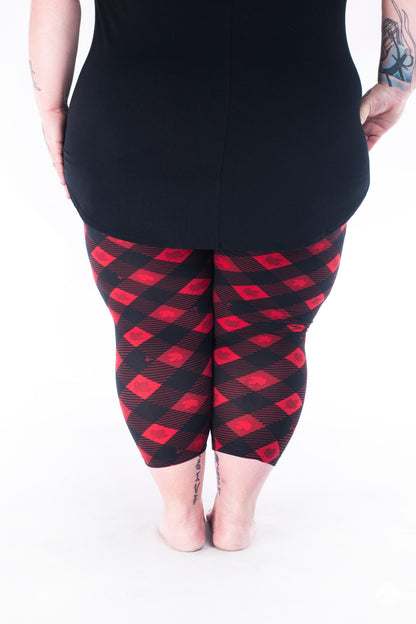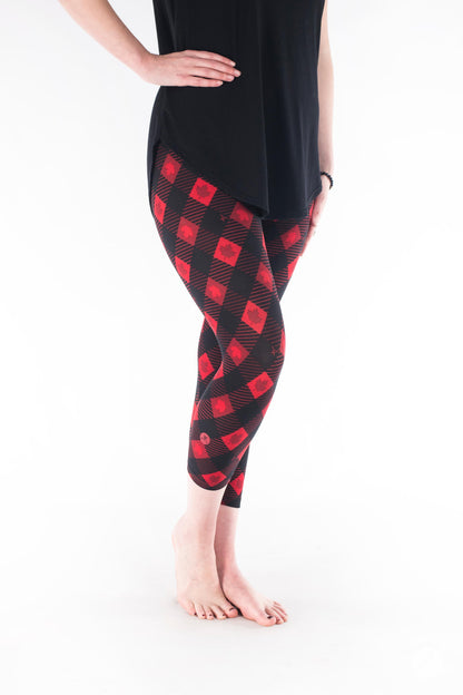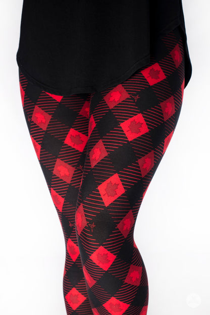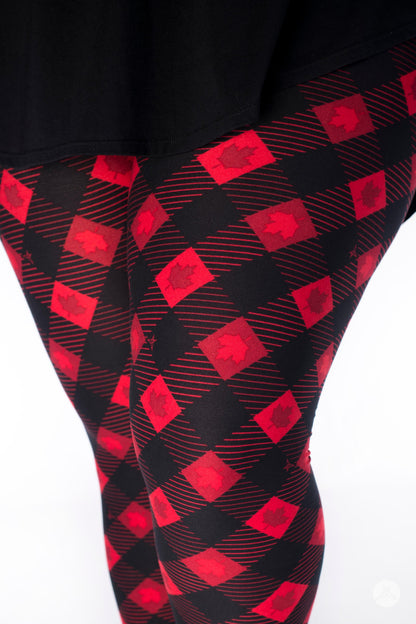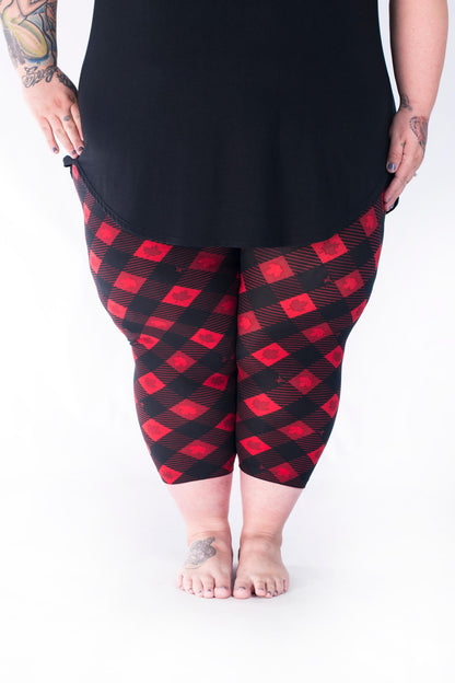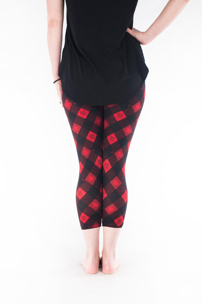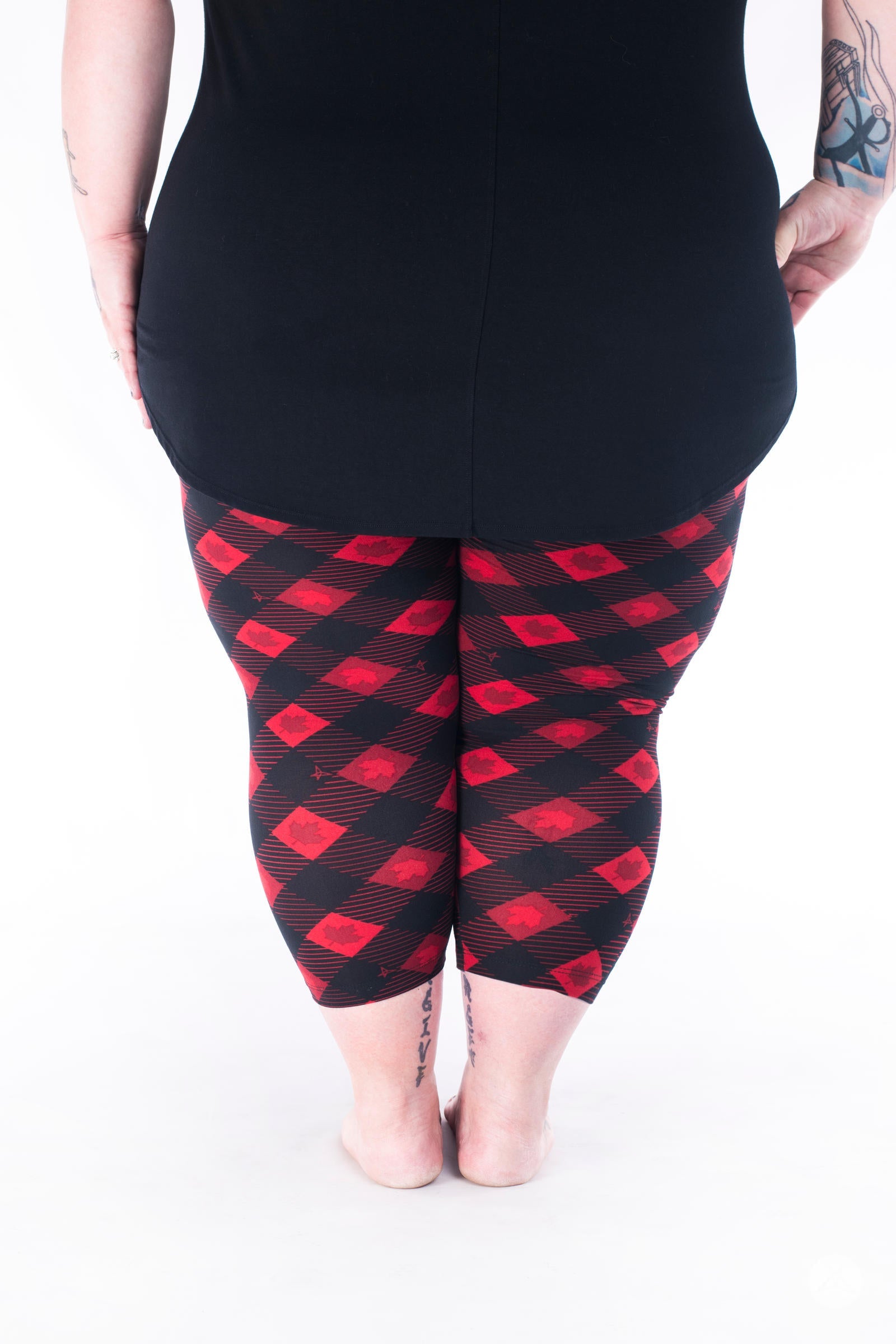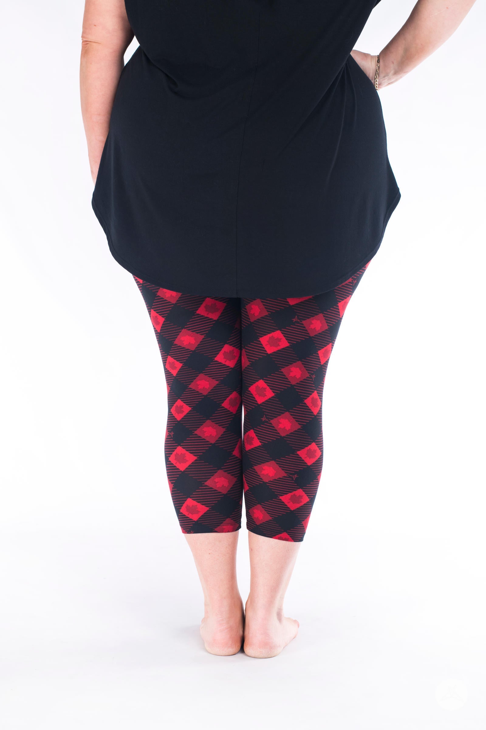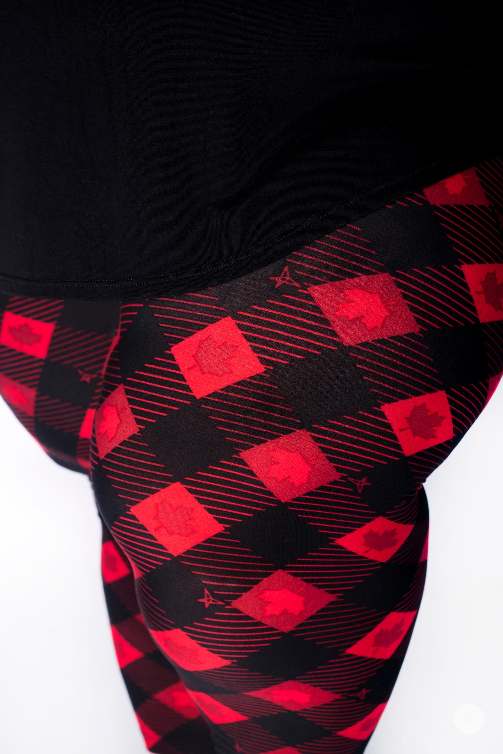 Canada Strong Crops feature a black and red maple leaf plaid print that pairs perfectly with a SweetTops Classic Tee in White, a cropped windbreaker, your favourite slides, and a matching Canada Strong Scrunchie!