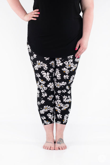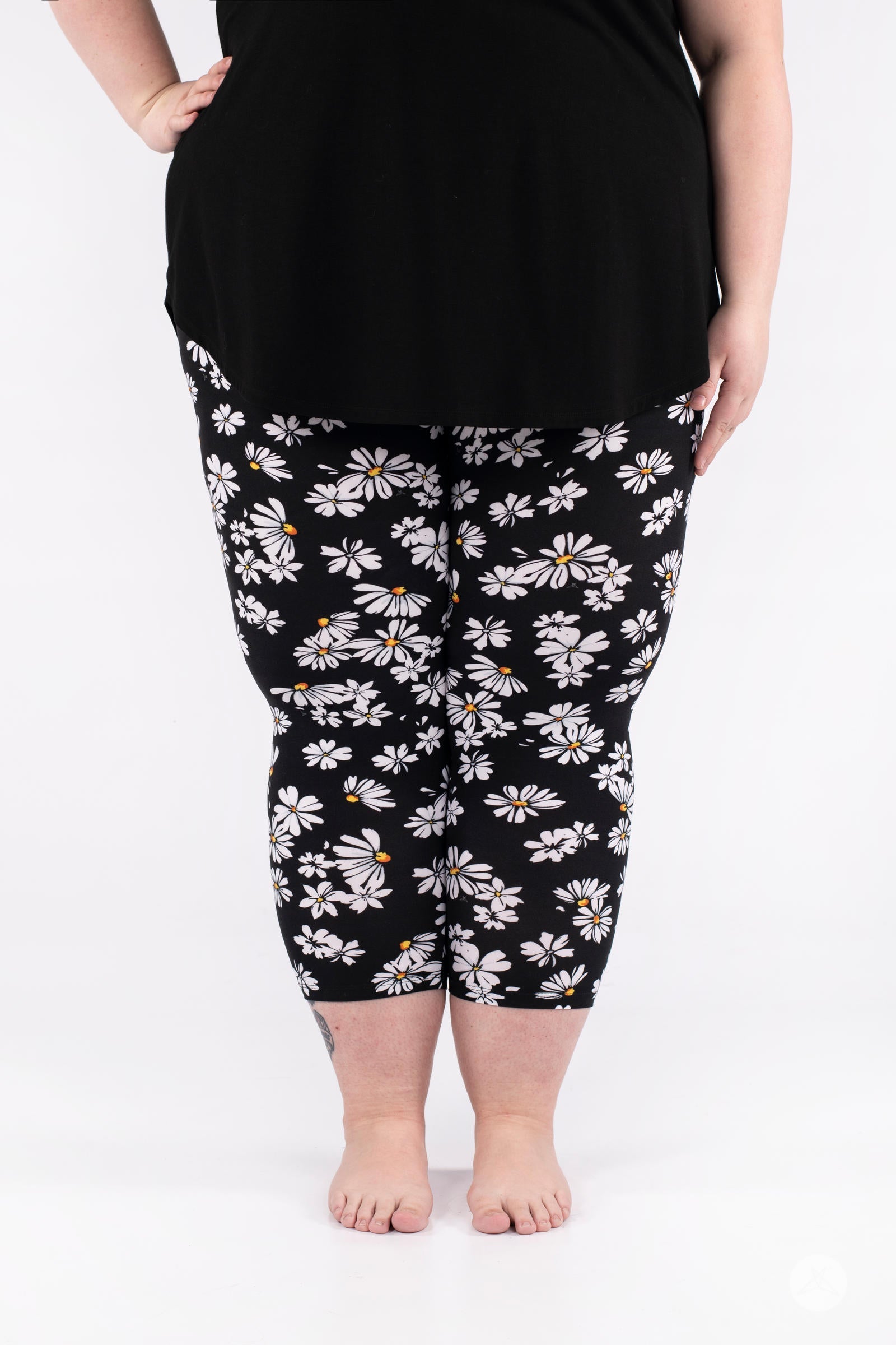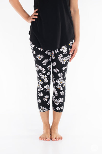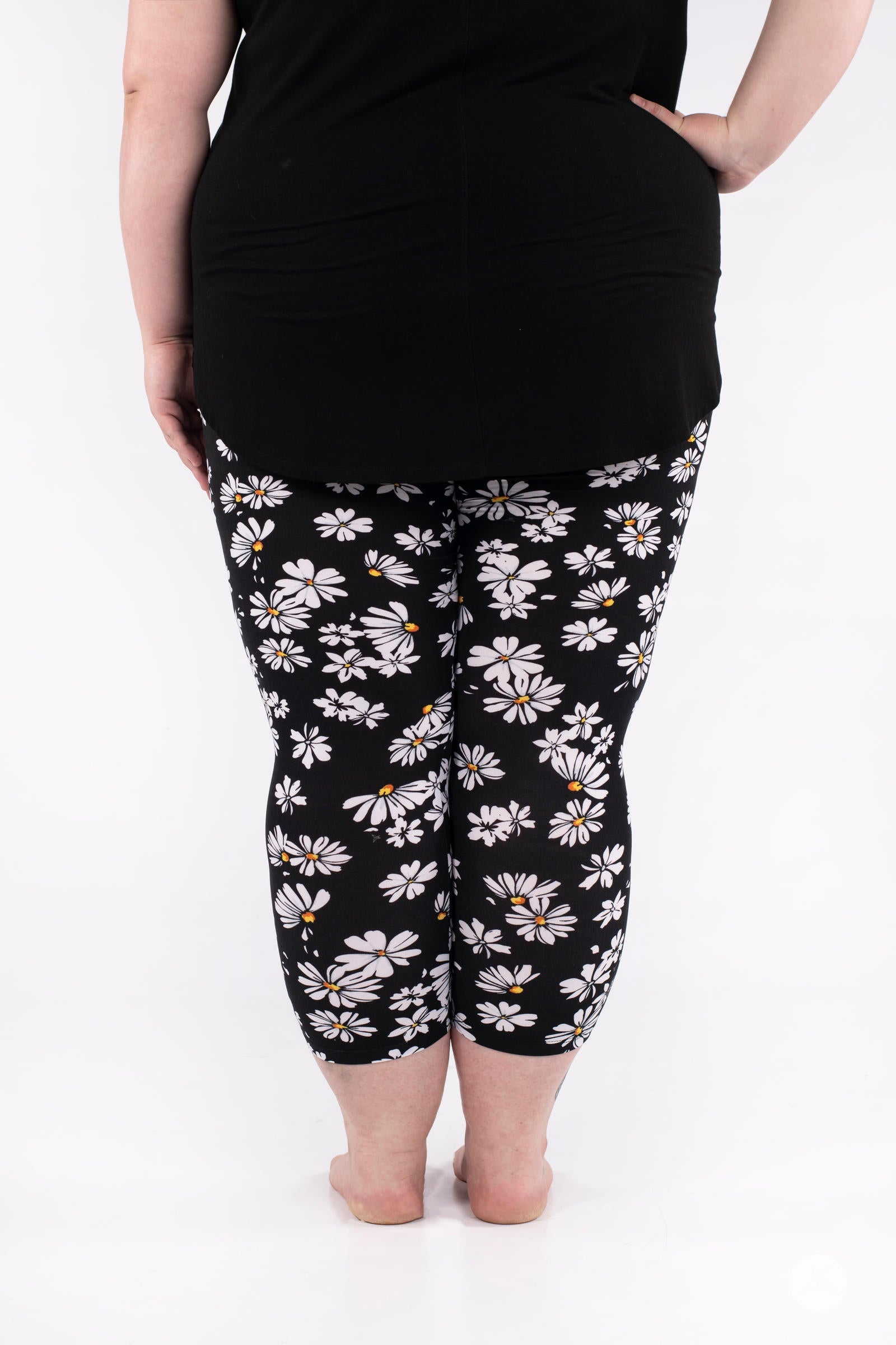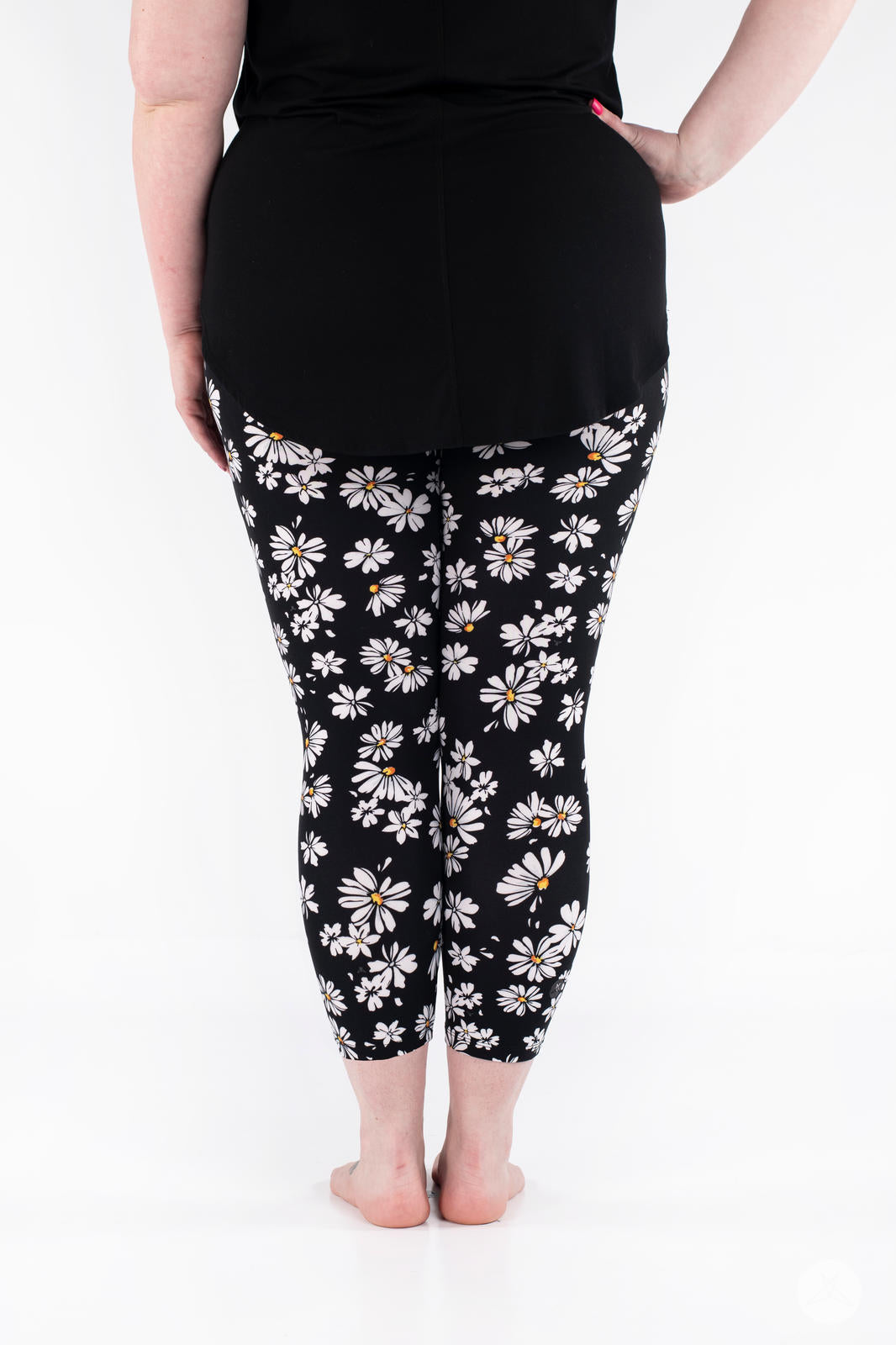 Meet your new must-have SweetLegs - Daisy Me Rollin’! A darling new addition to our 2022 cropped leggings collection! Daisy Me Rollin’ offers a collection of hand drawn daisies, set on a deep black background.