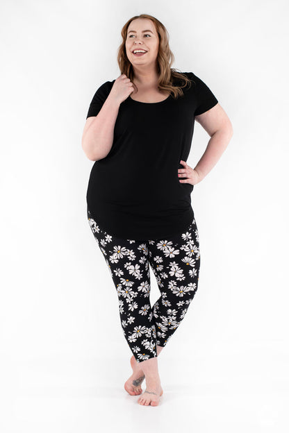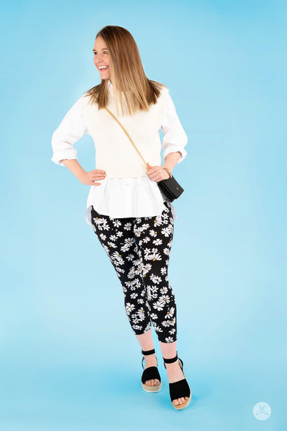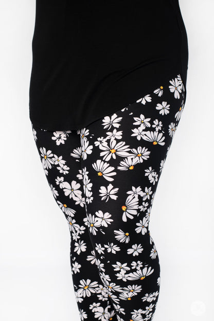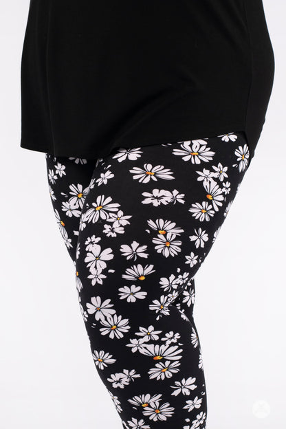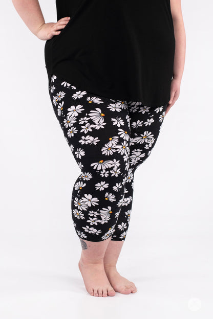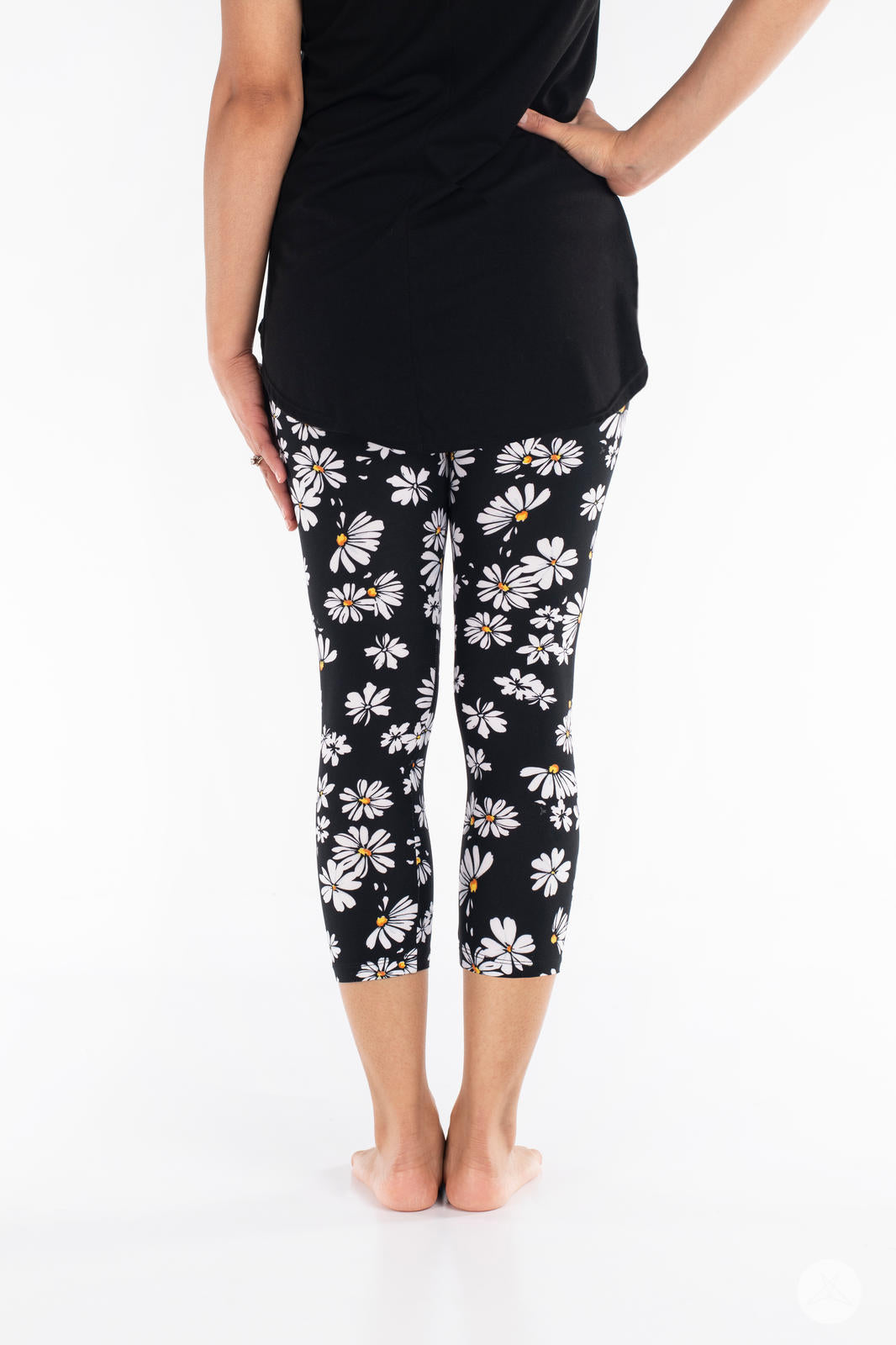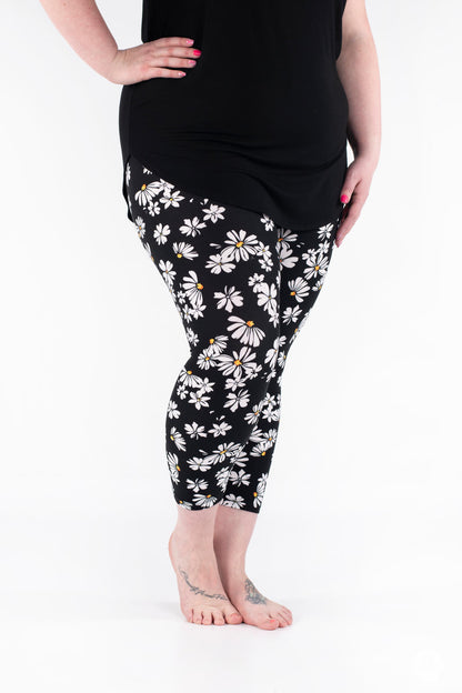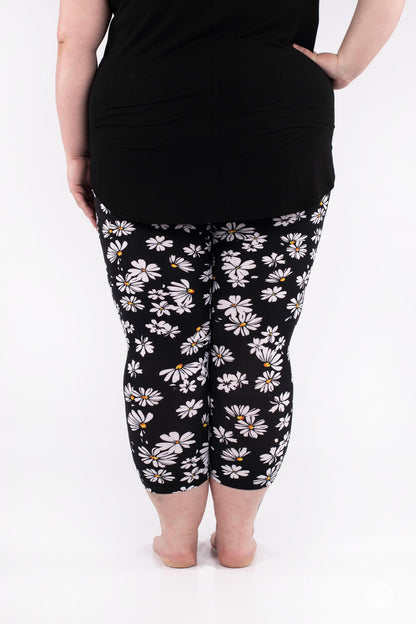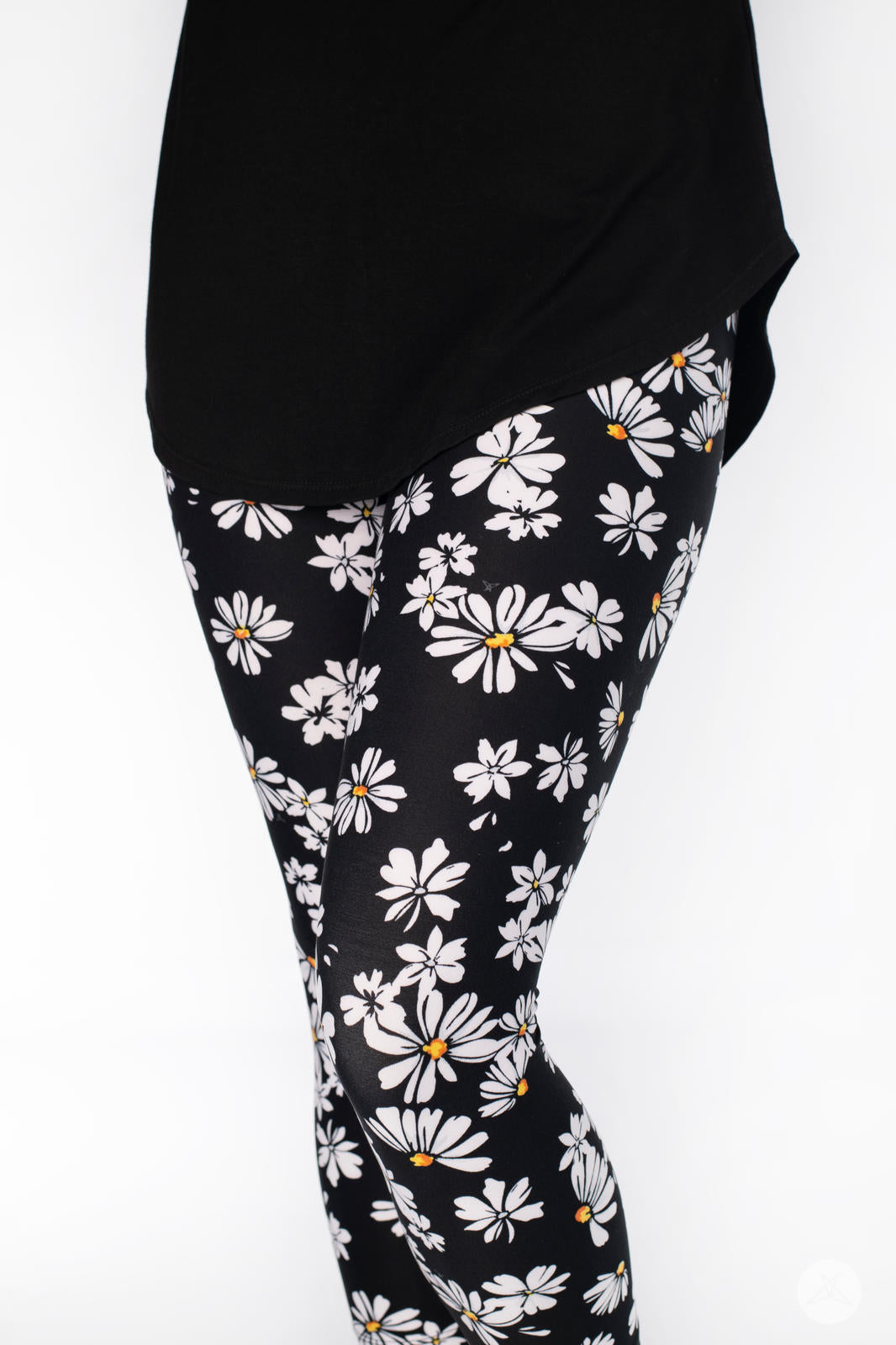 Meet your new must-have SweetLegs - Daisy Me Rollin’! A darling new addition to our 2022 cropped leggings collection! Daisy Me Rollin’ offers a collection of hand drawn daisies, set on a deep black background.