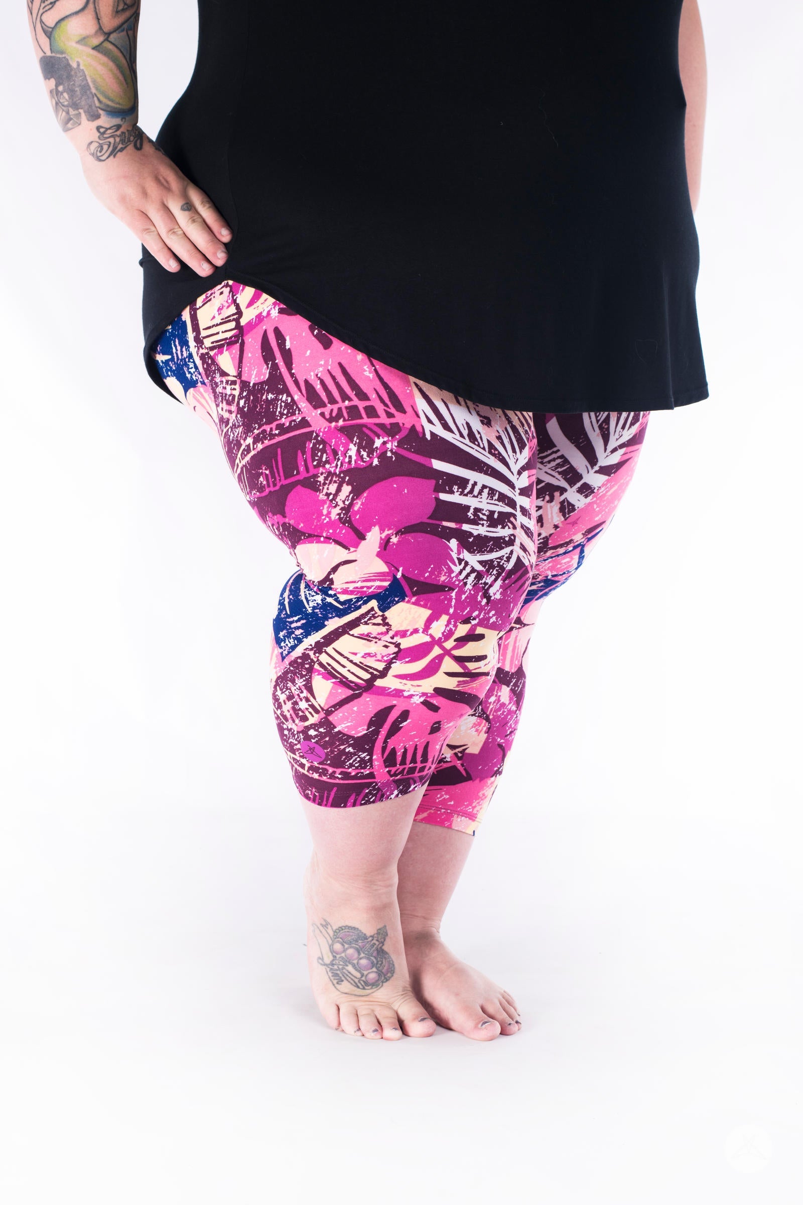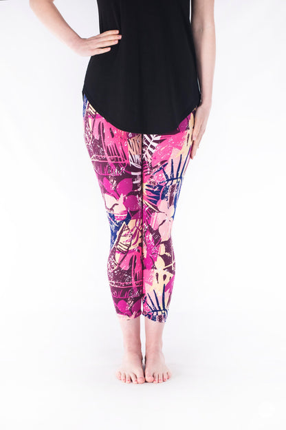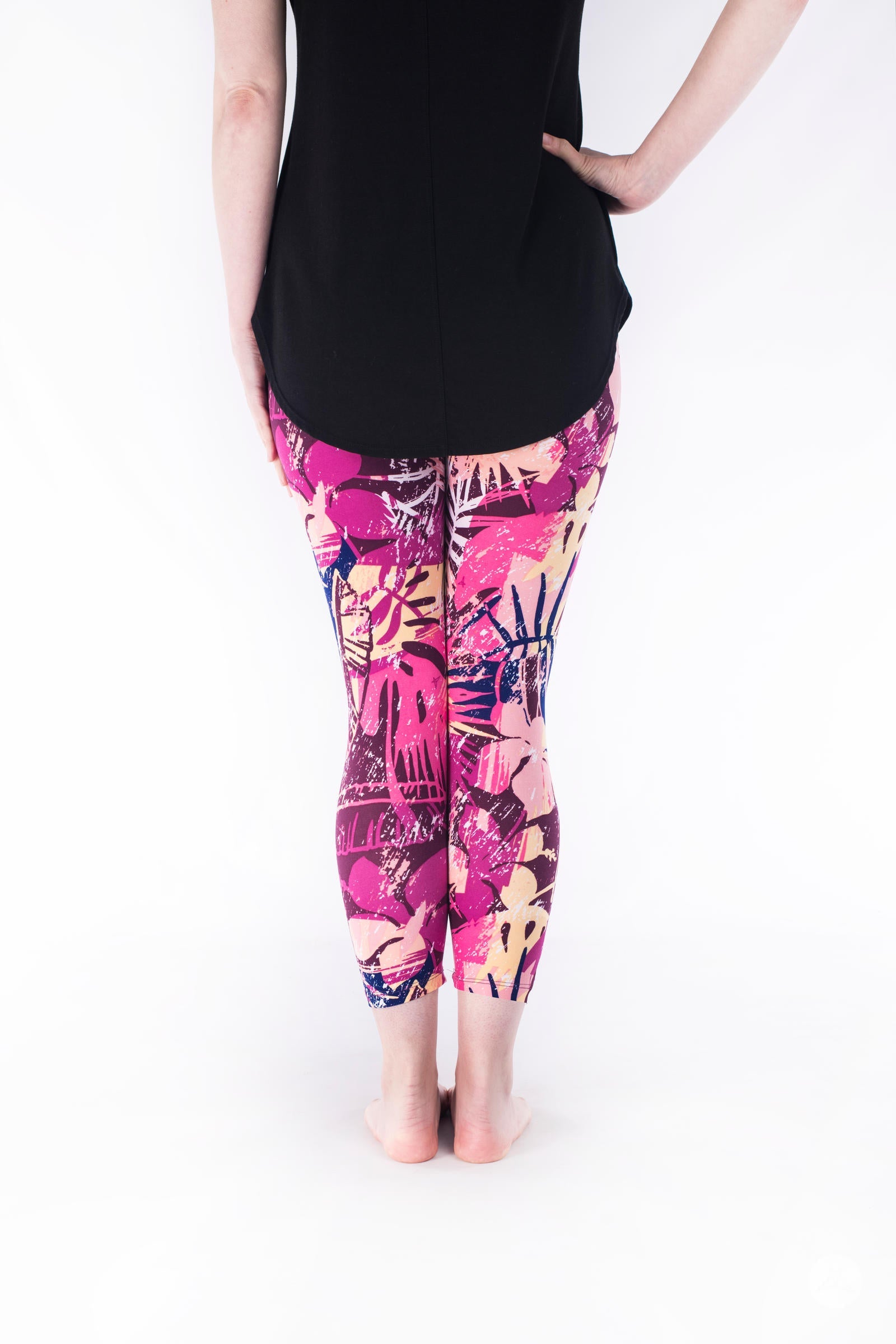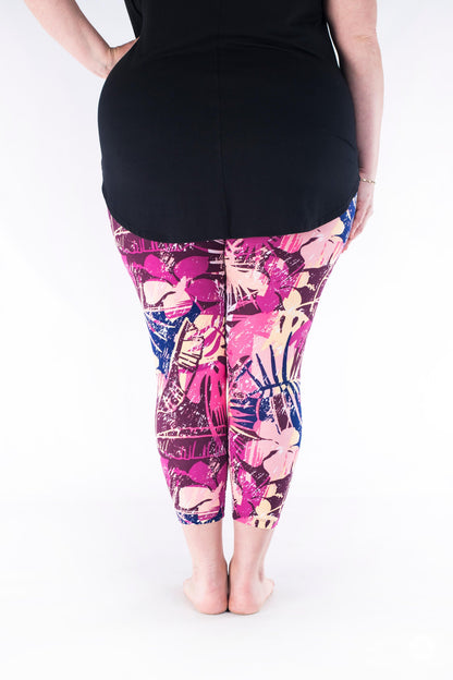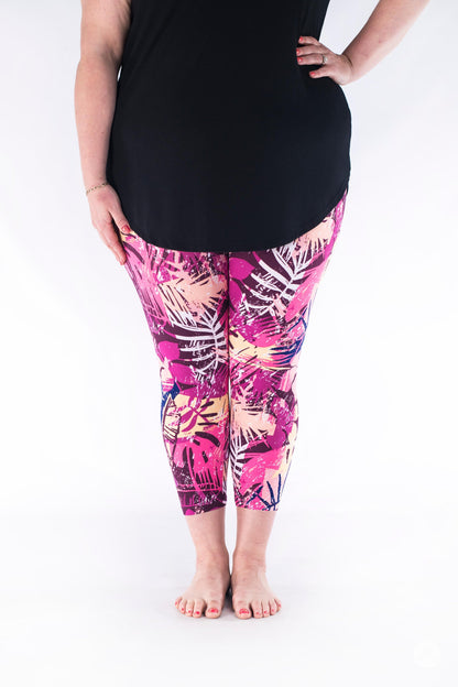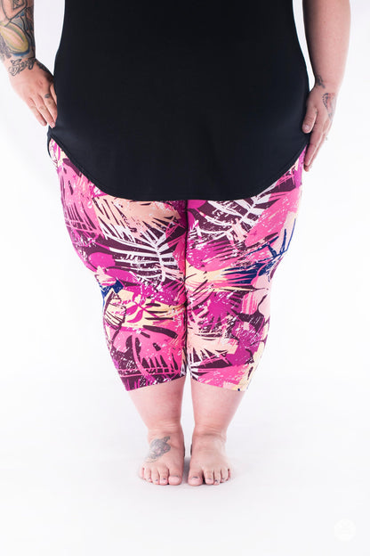 Easily Adored Crops feature a gorgeous palm leaf and plumeria pattern with a faux distressed overlay.