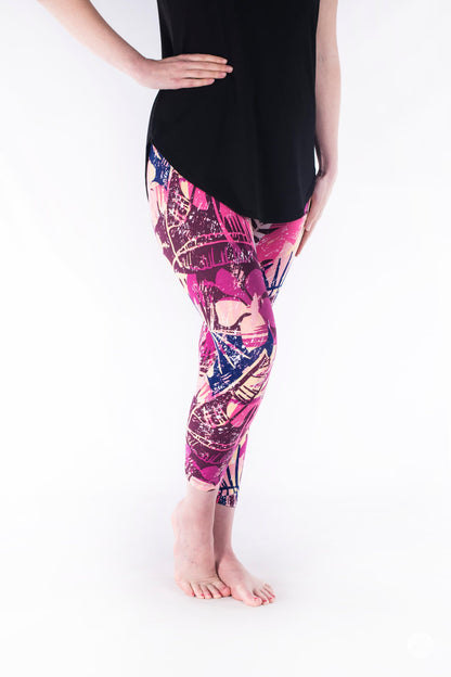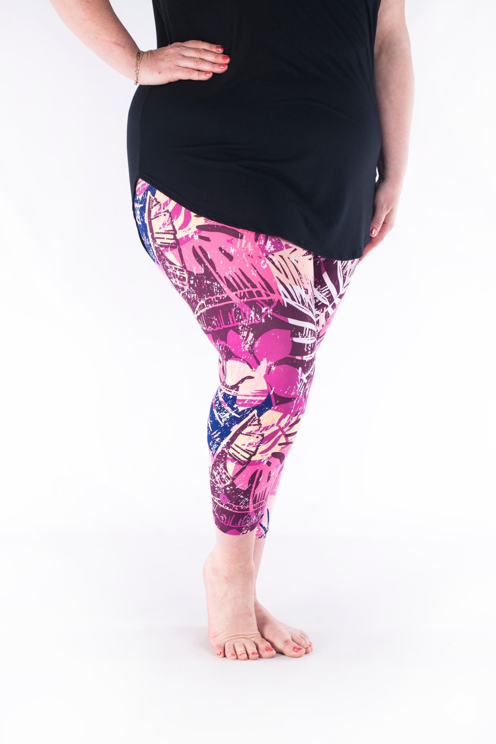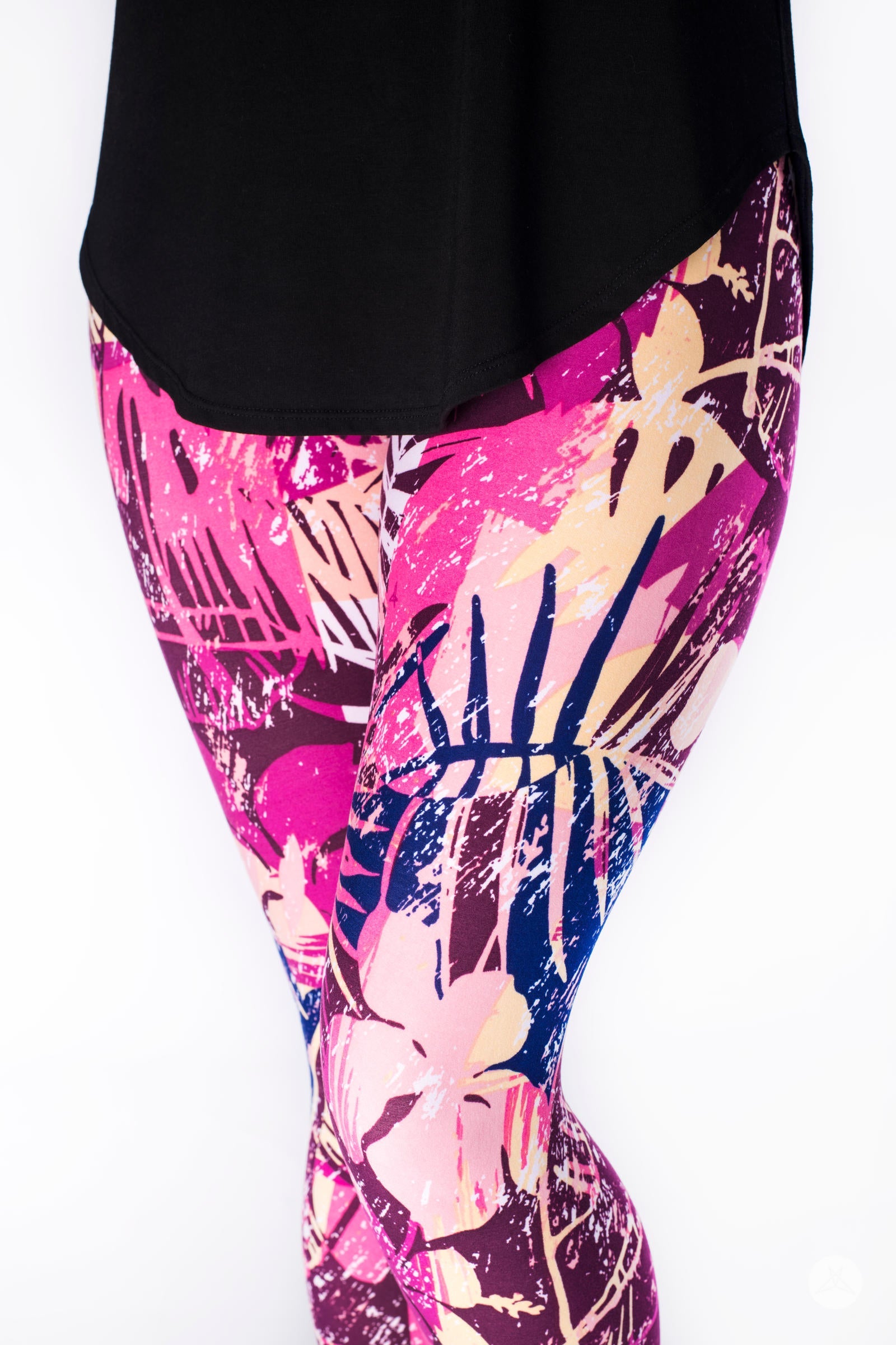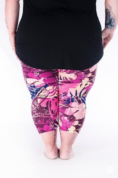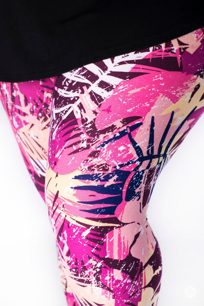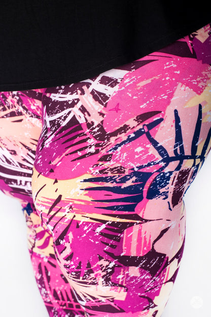 Easily Adored Crops feature a gorgeous palm leaf and plumeria pattern with a faux distressed overlay.