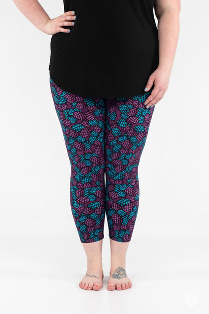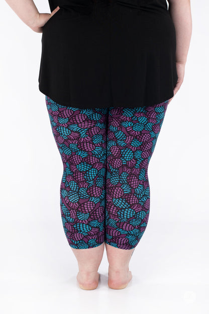 Razzle Dazzle présente un imprimé d'ananas super amusant à échelle moyenne dans des violets, des bleus sarcelle et une touche de noir. Associez cet imprimé avec un t-shirt classique noir et des sandales noires pour un look sans effort qui éblouira, où que vous alliez !