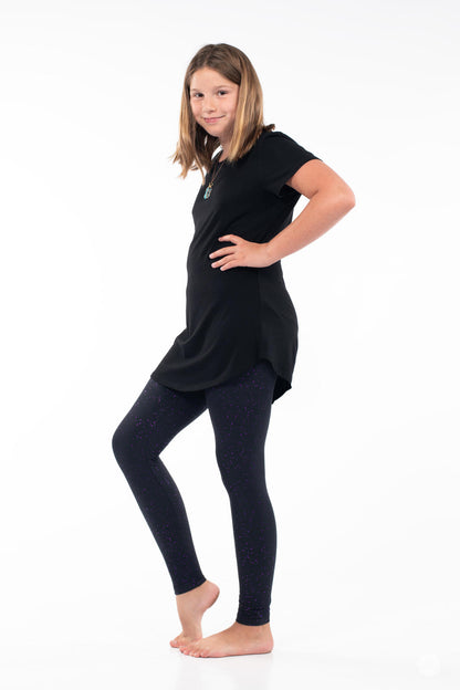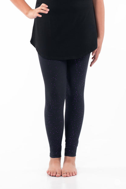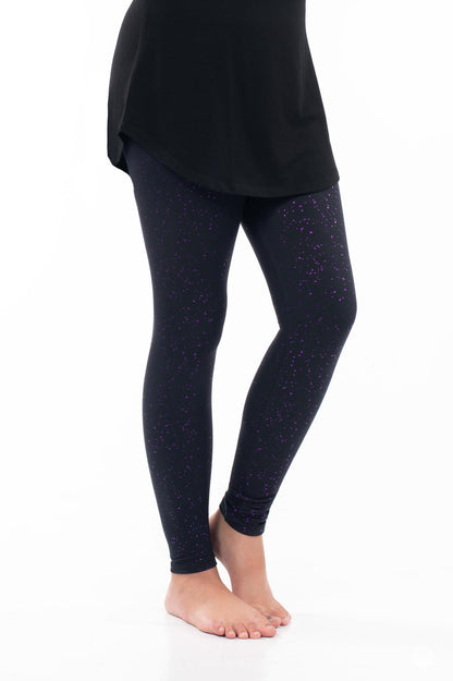 If you picture the night sky shimmering with a touch of amethyst magic, these sparkle leggings are it! Crafted with purple metallic foil detailing, speckled against a soft black background, they add just the right amount of sparkle and colour to your look.