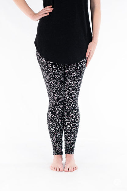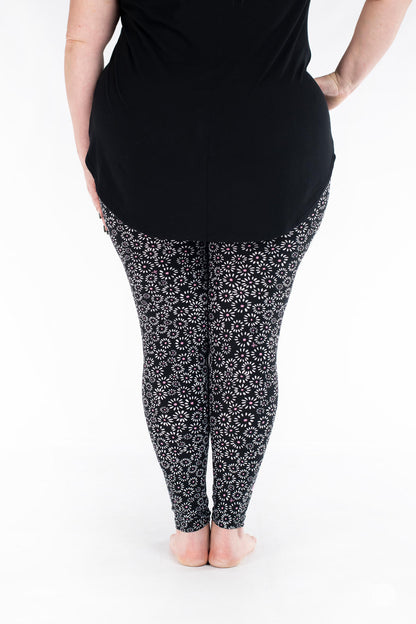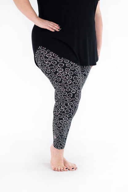 Cet imprimé à base de noir présente des marguerites blanches stylisées avec des centres roses et est parfait pour tous ceux qui souhaitent commencer le printemps tôt !