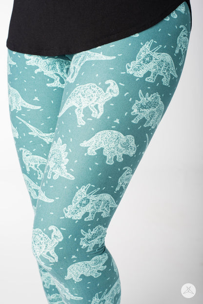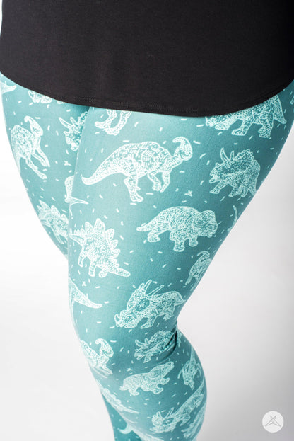Dino-mite SweetLegs are here and they’re a classic from the Jurassic! All your favourite prehistoric pals are etched in turquoise atop a sea green background, making this print go-to for any avid dino fan!