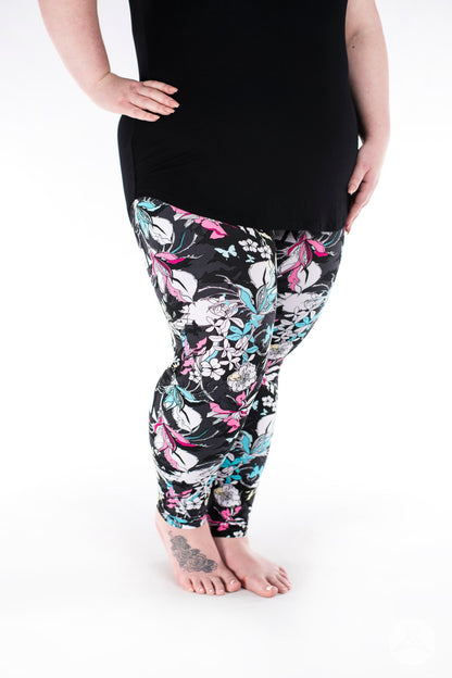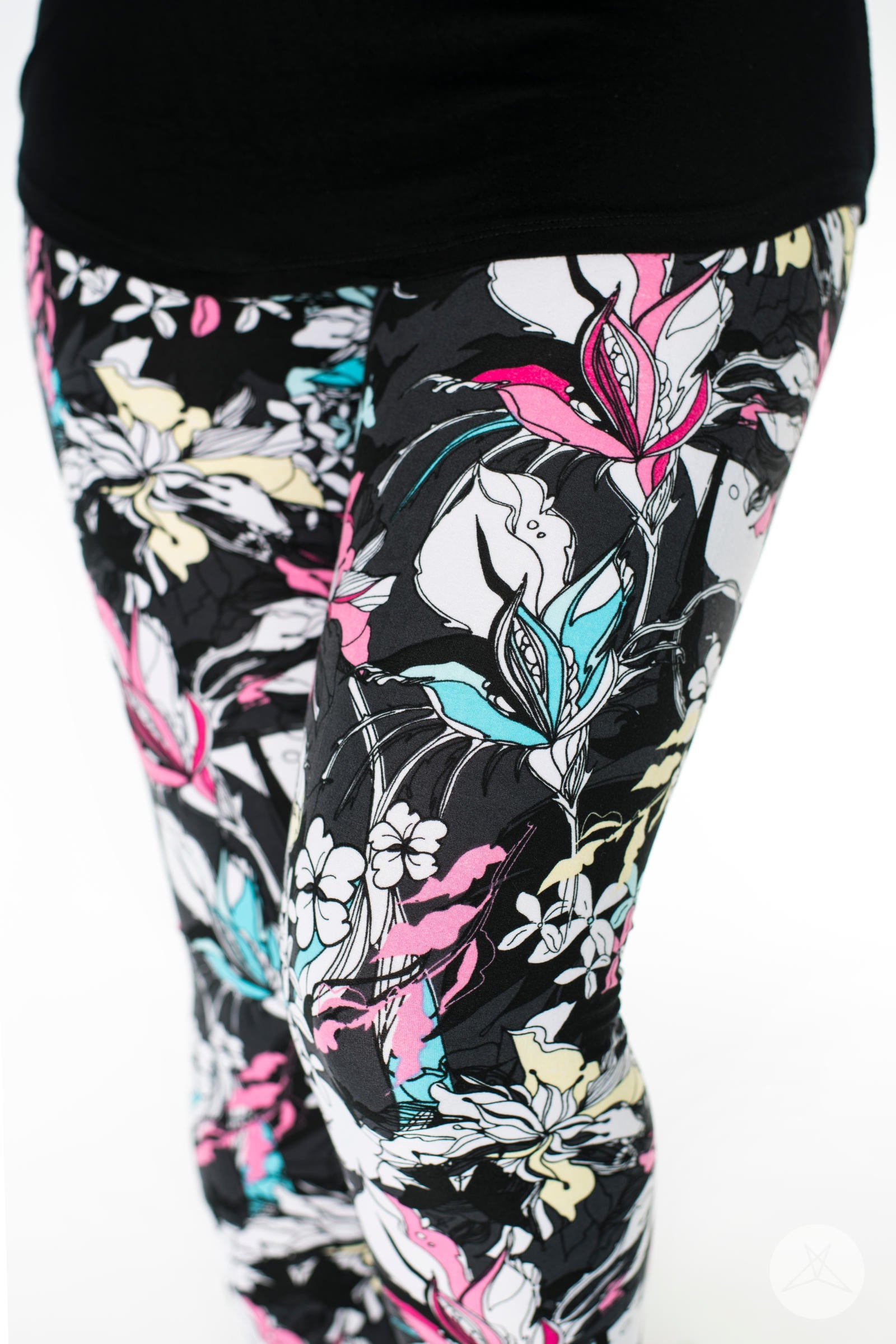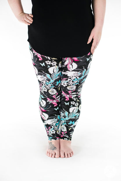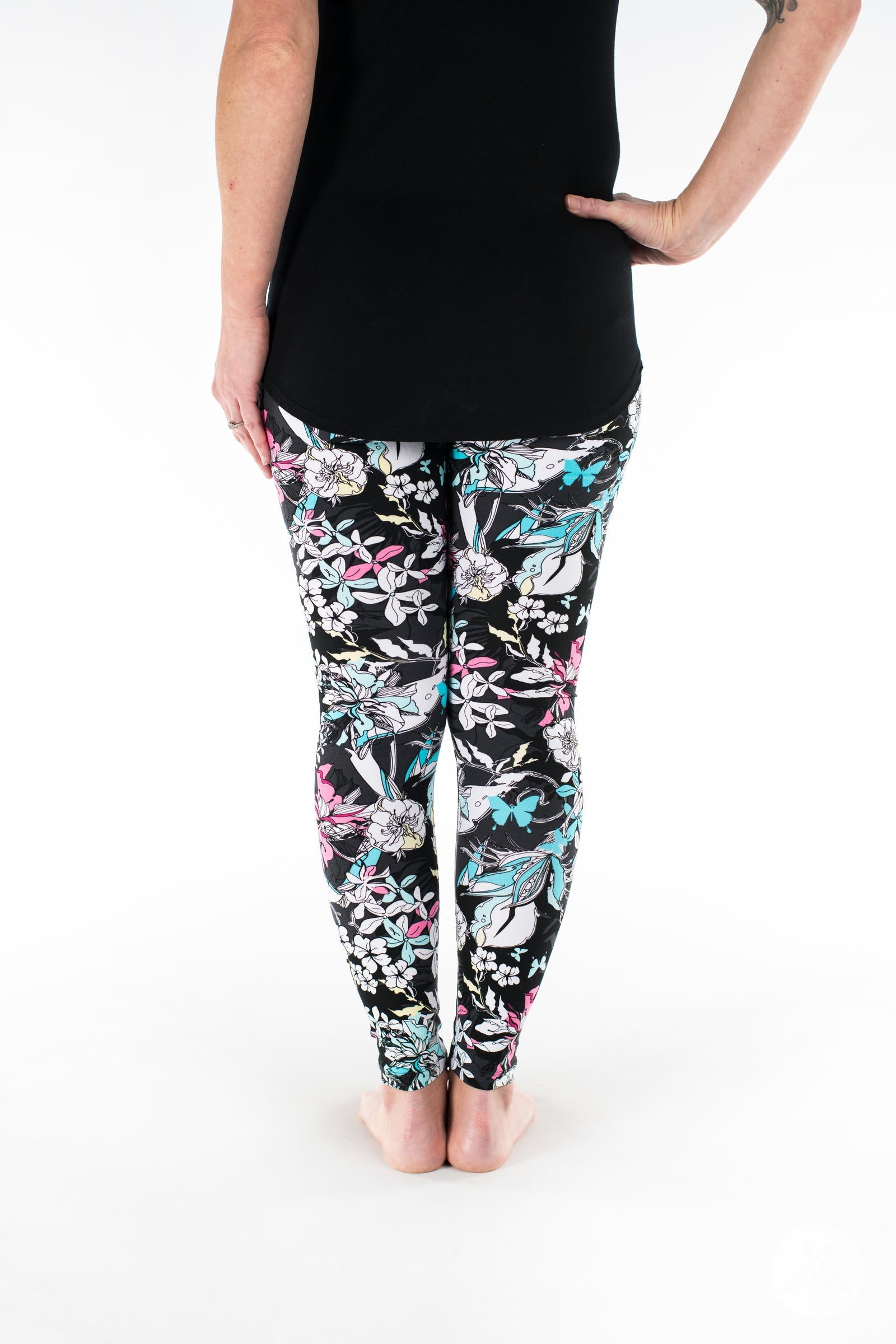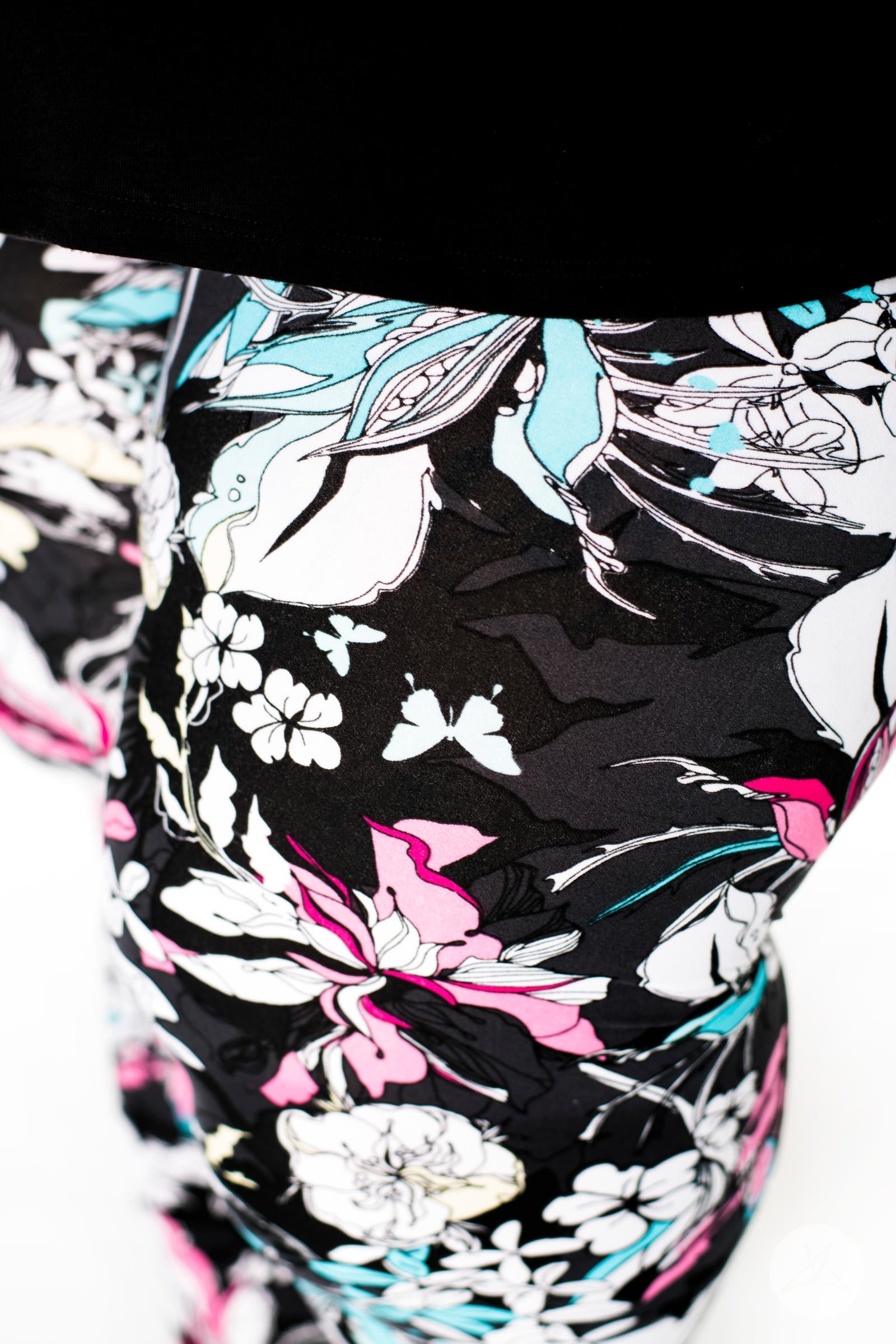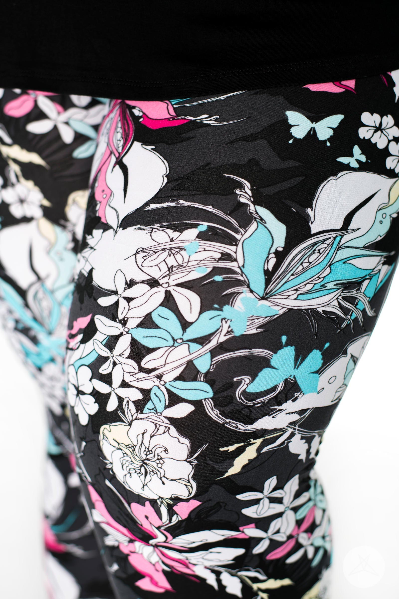 SweetLegs is proud to welcome Fleur Real SweetLegs, a gorgeous addition to our 2019 leggings collection! This stunning garden scene features flowers and butterflies in tones of white, pink, buttercup yellow and blue with accents of charcoal on a black background.