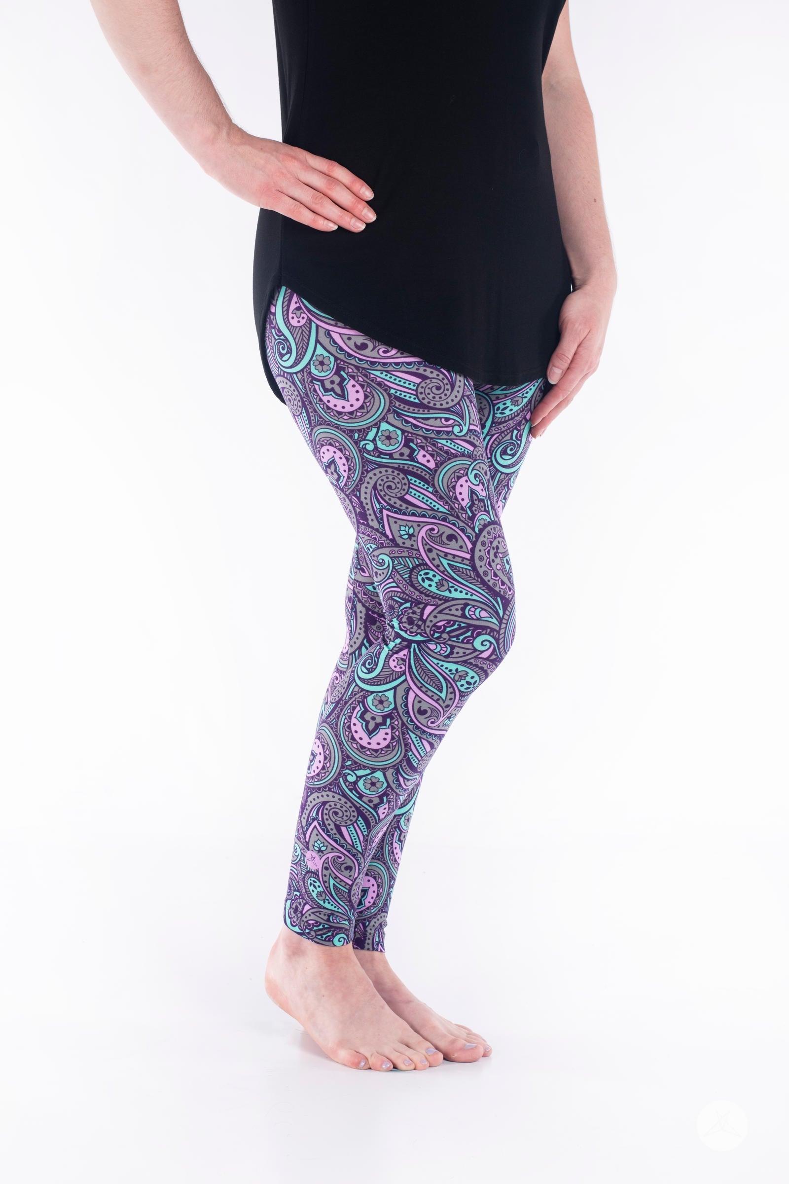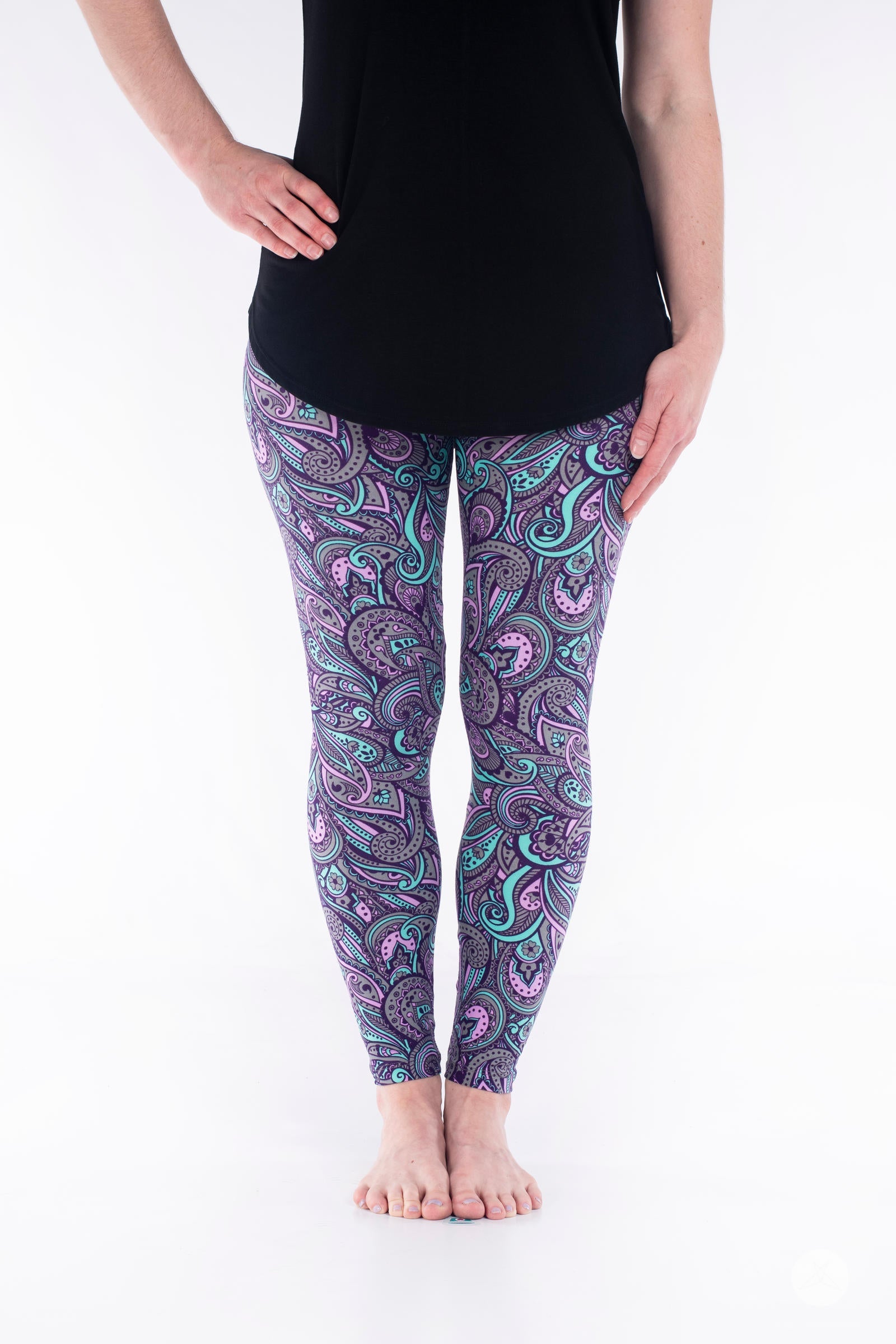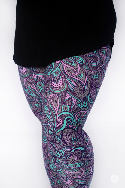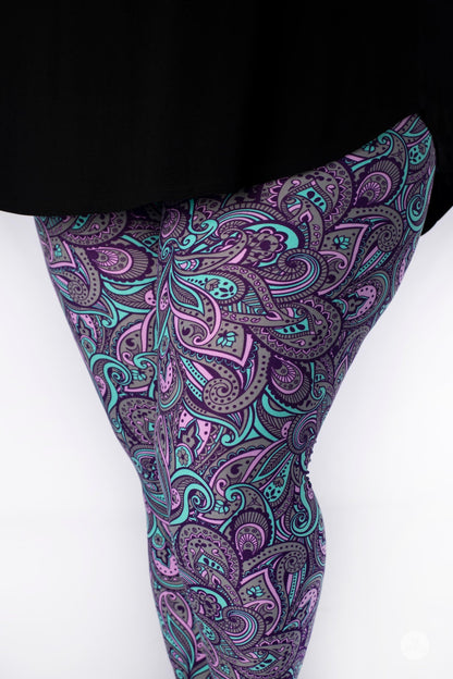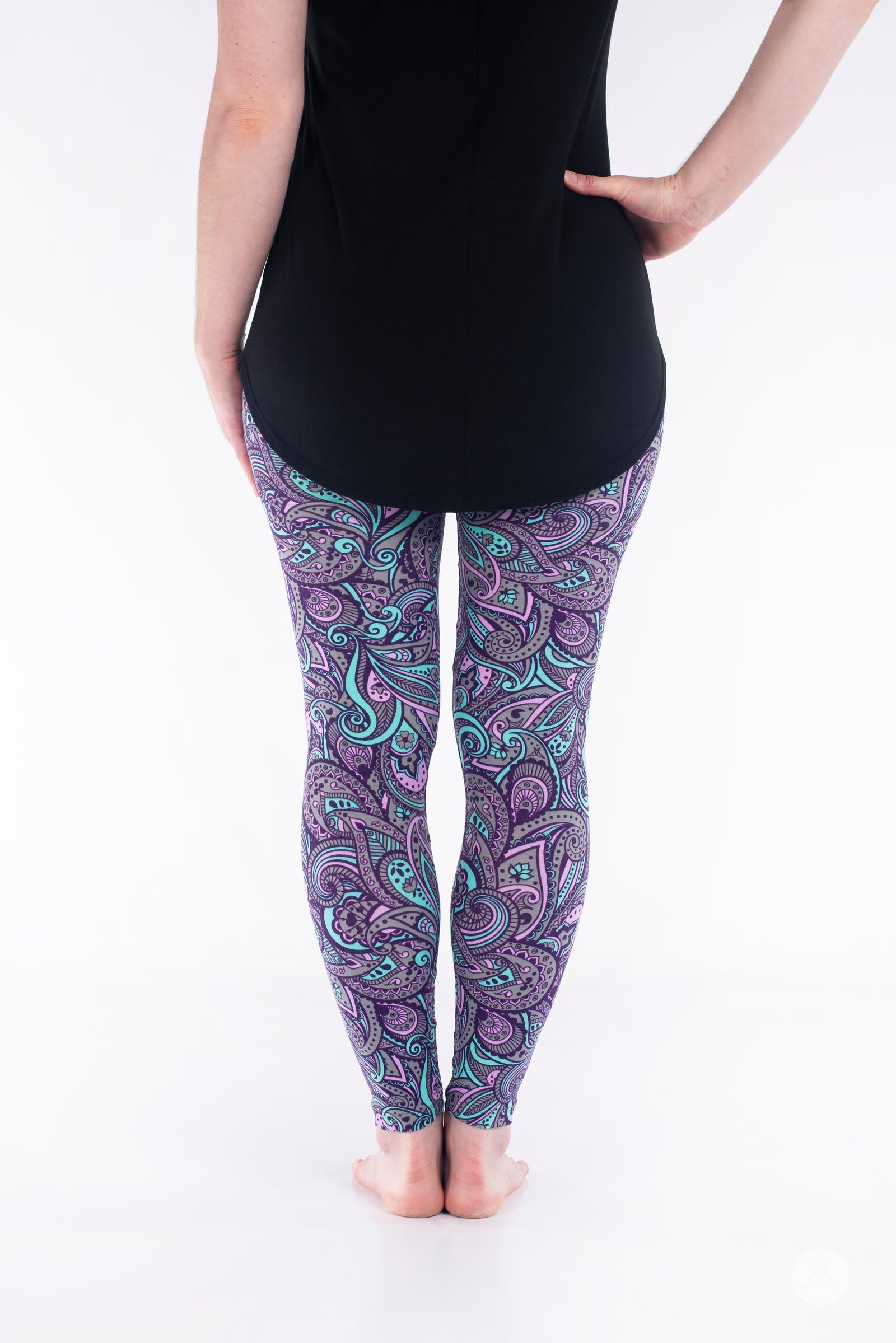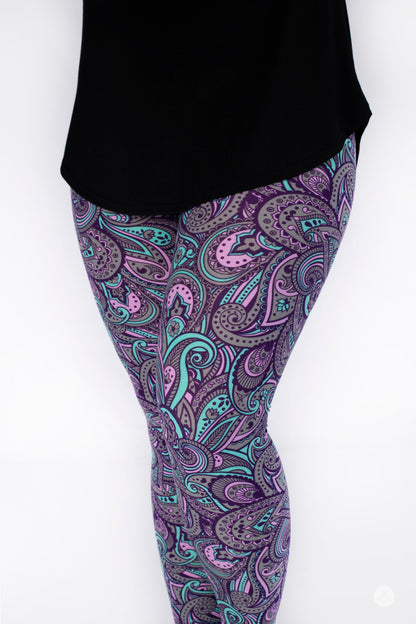 Ce legging amusant présente un motif cachemire violet et bleu sarcelle, parfait pour ceux qui aiment se démarquer avec style.