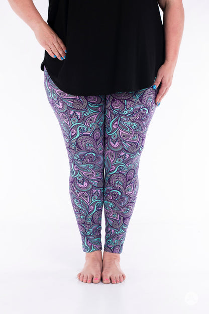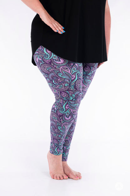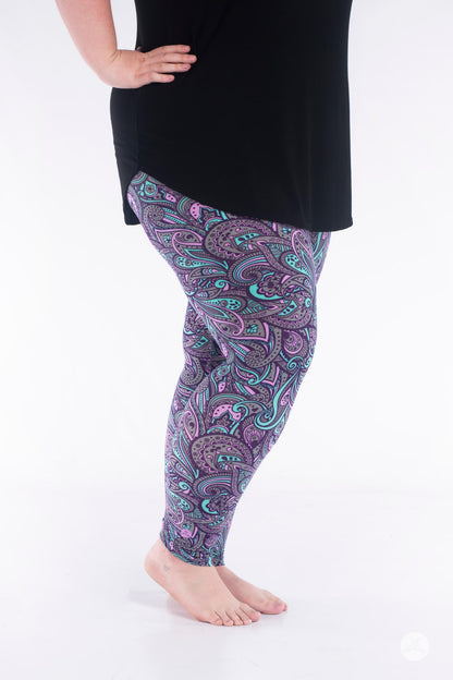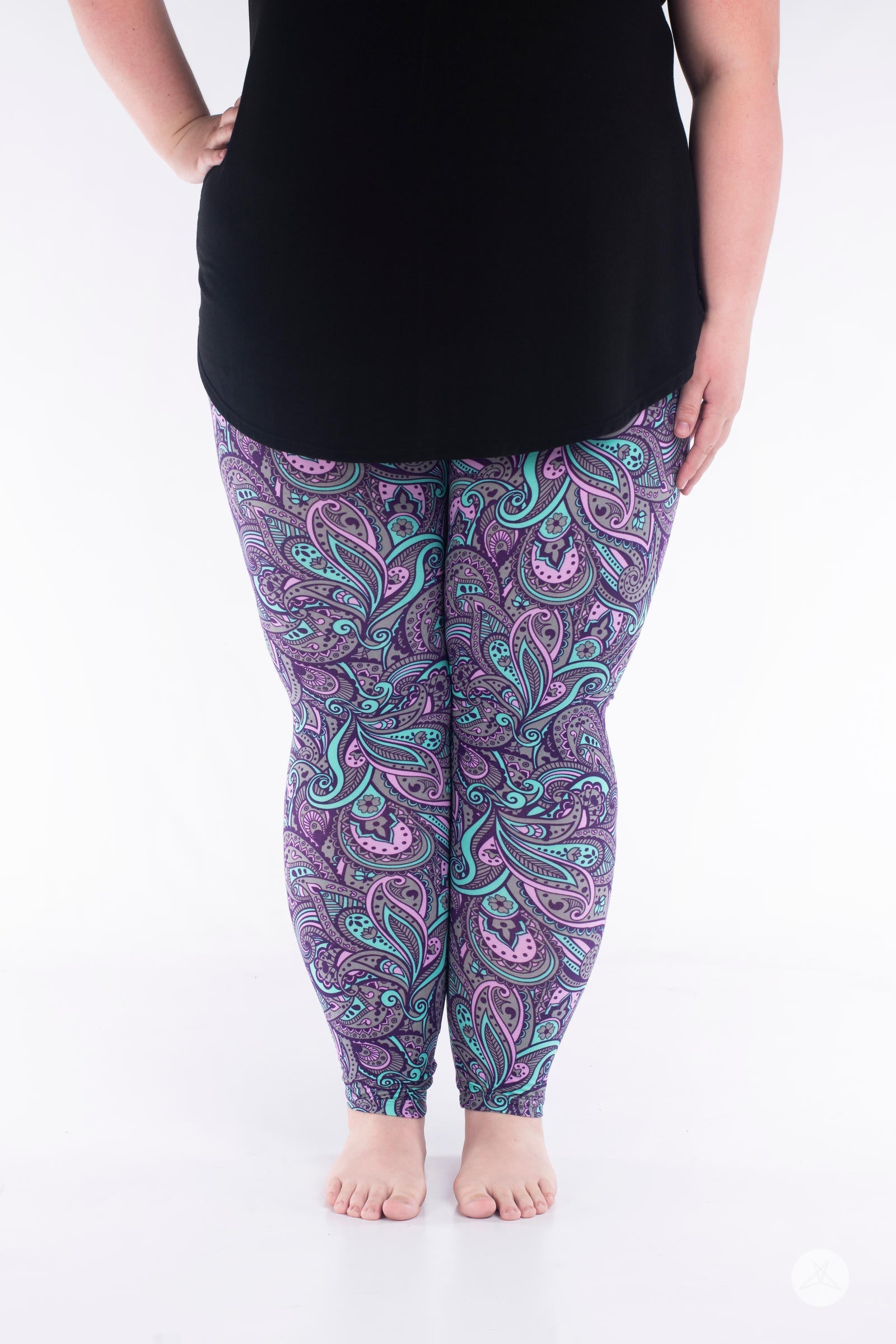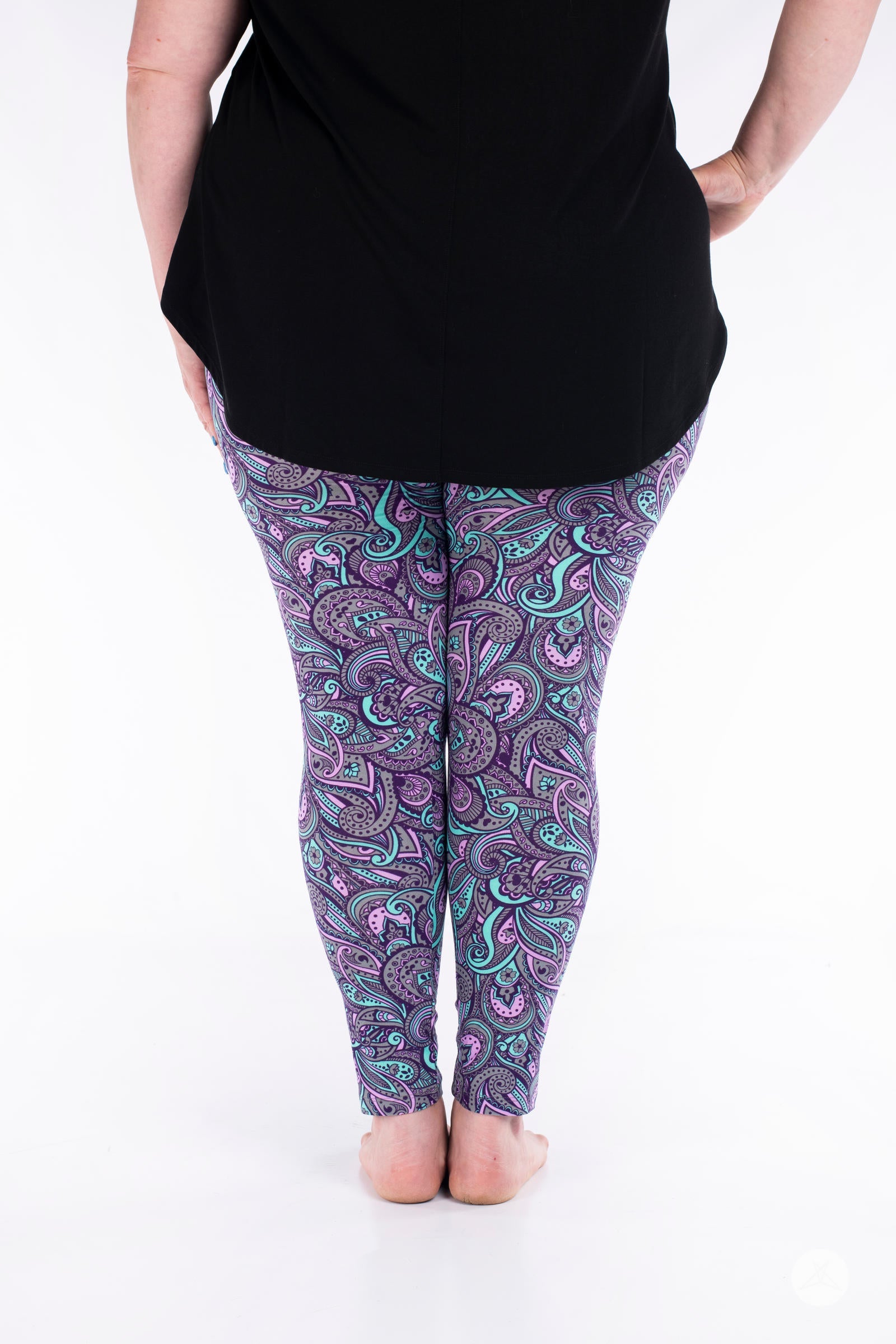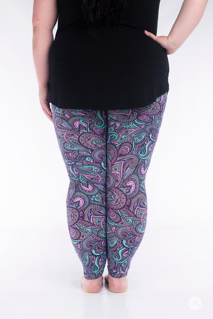 Ce legging amusant présente un motif cachemire violet et bleu sarcelle, parfait pour ceux qui aiment se démarquer avec style.