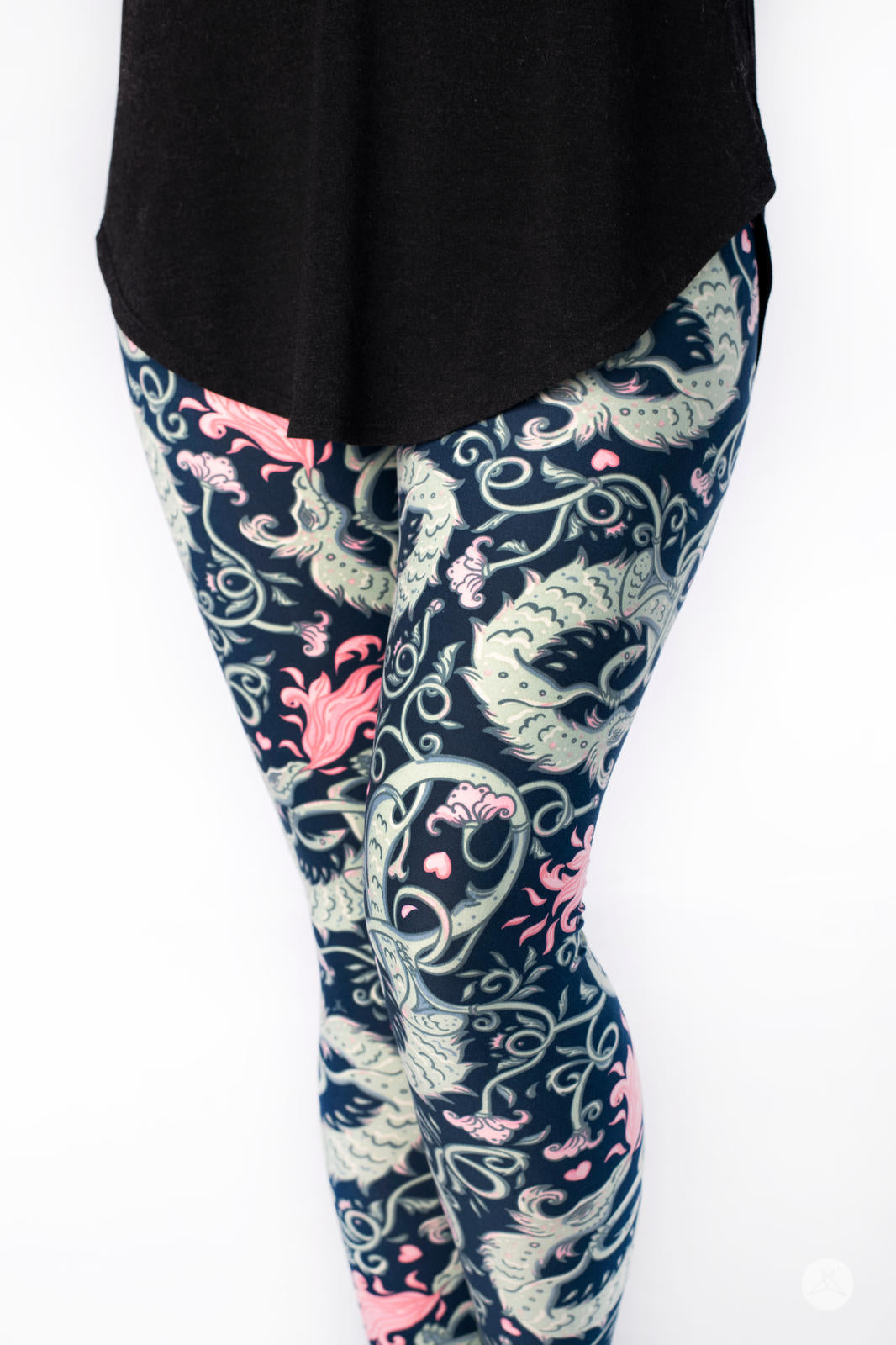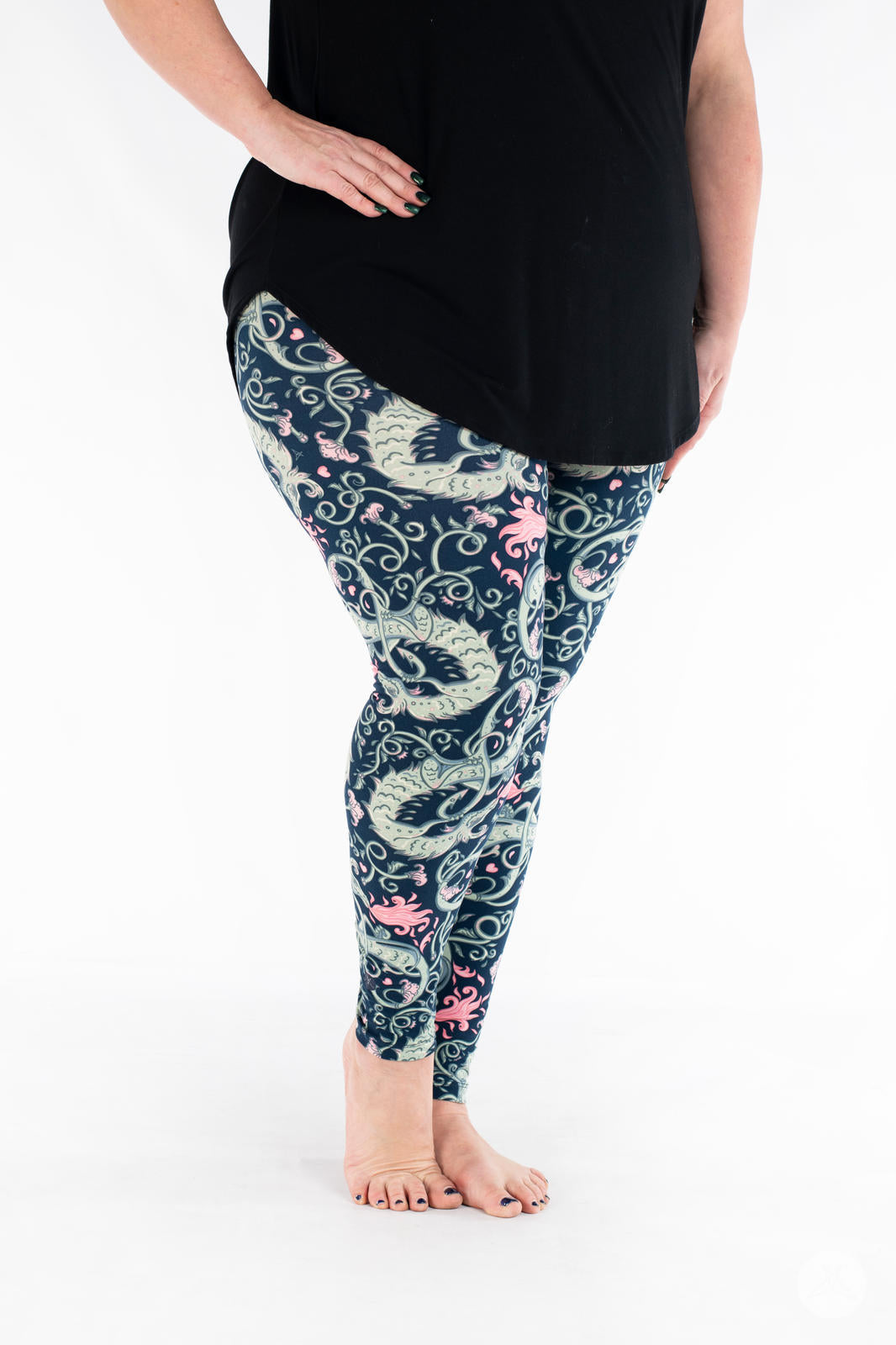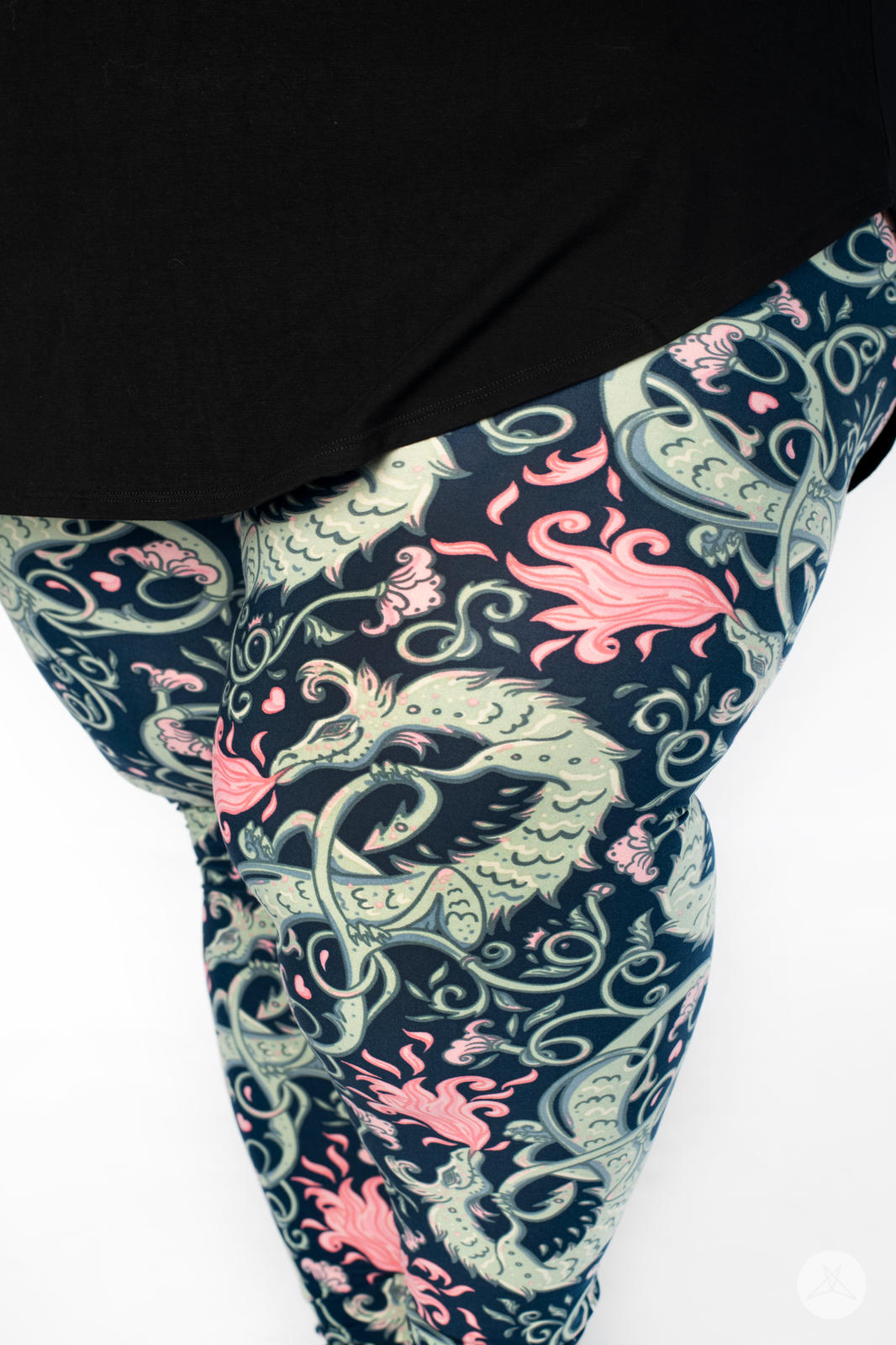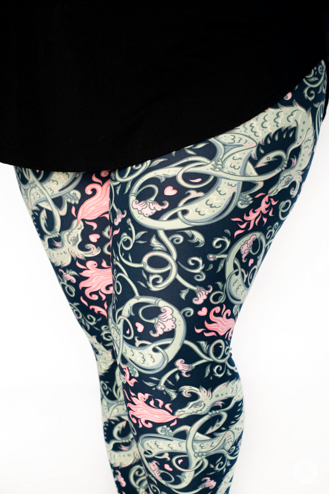Les dragons vert sauge crachent un feu rose parmi des fleurs délicates sur cette impression fantaisie amusante qui ravira à coup sûr tout collectionneur passionné de SweetLegs !