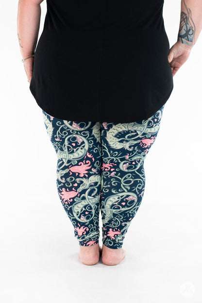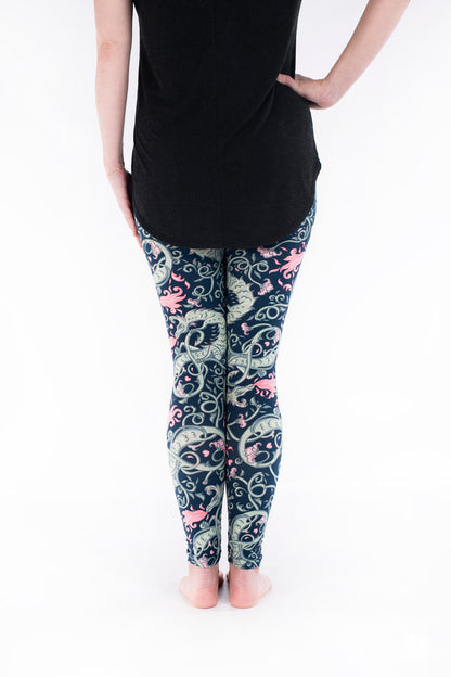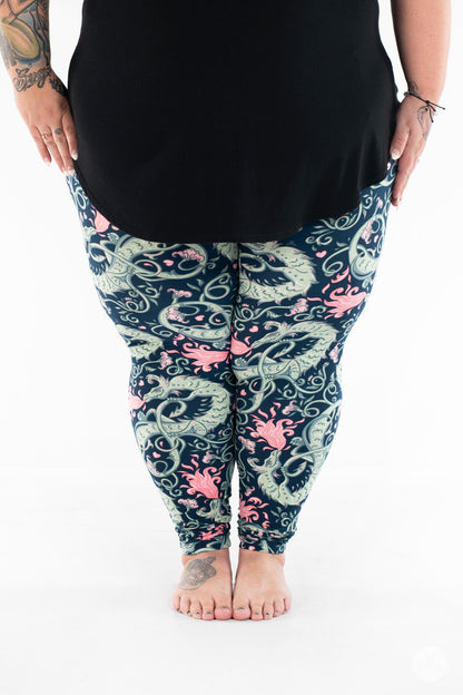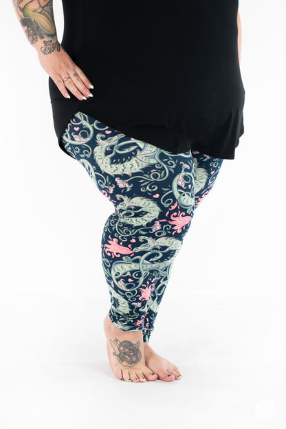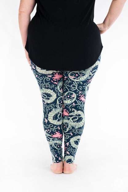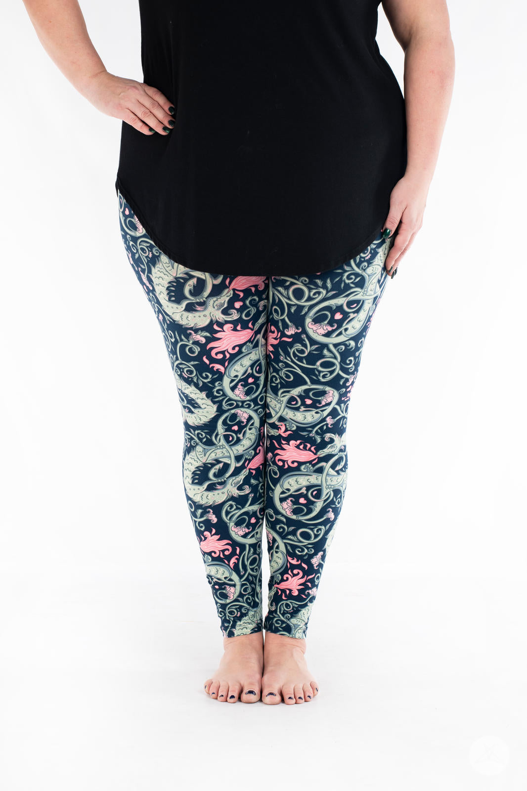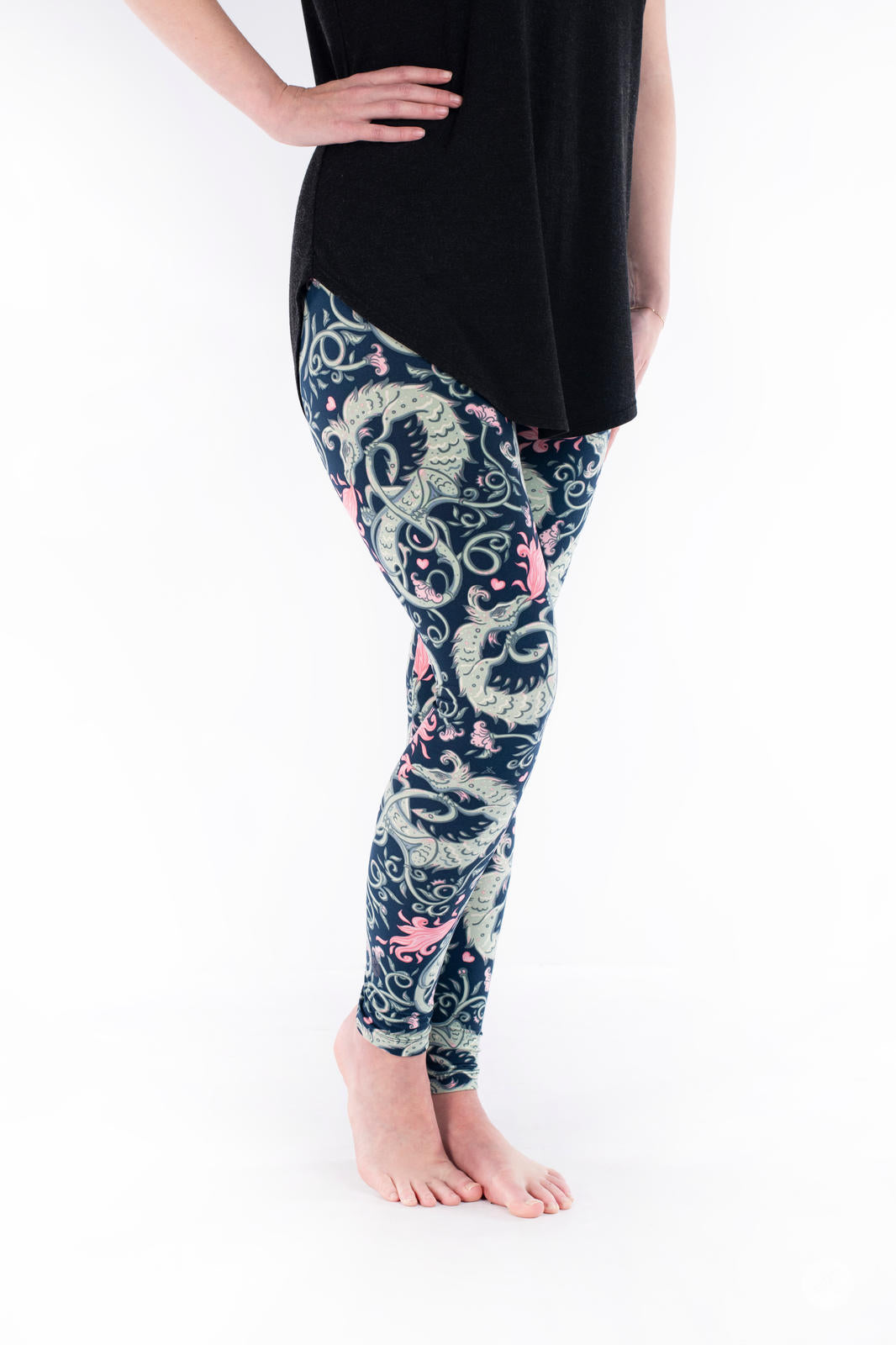 Les dragons vert sauge crachent un feu rose parmi des fleurs délicates sur cette impression fantaisie amusante qui ravira à coup sûr tout collectionneur passionné de SweetLegs !