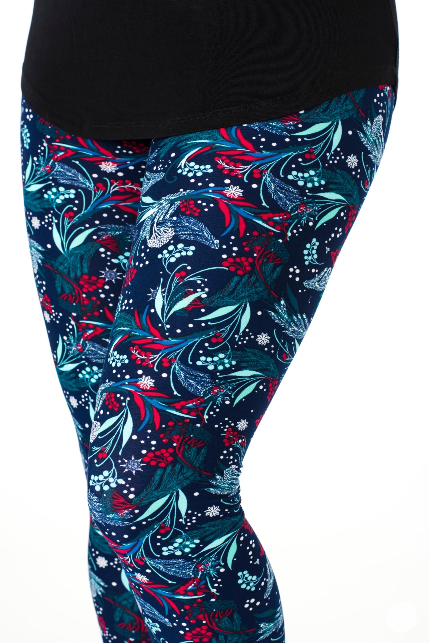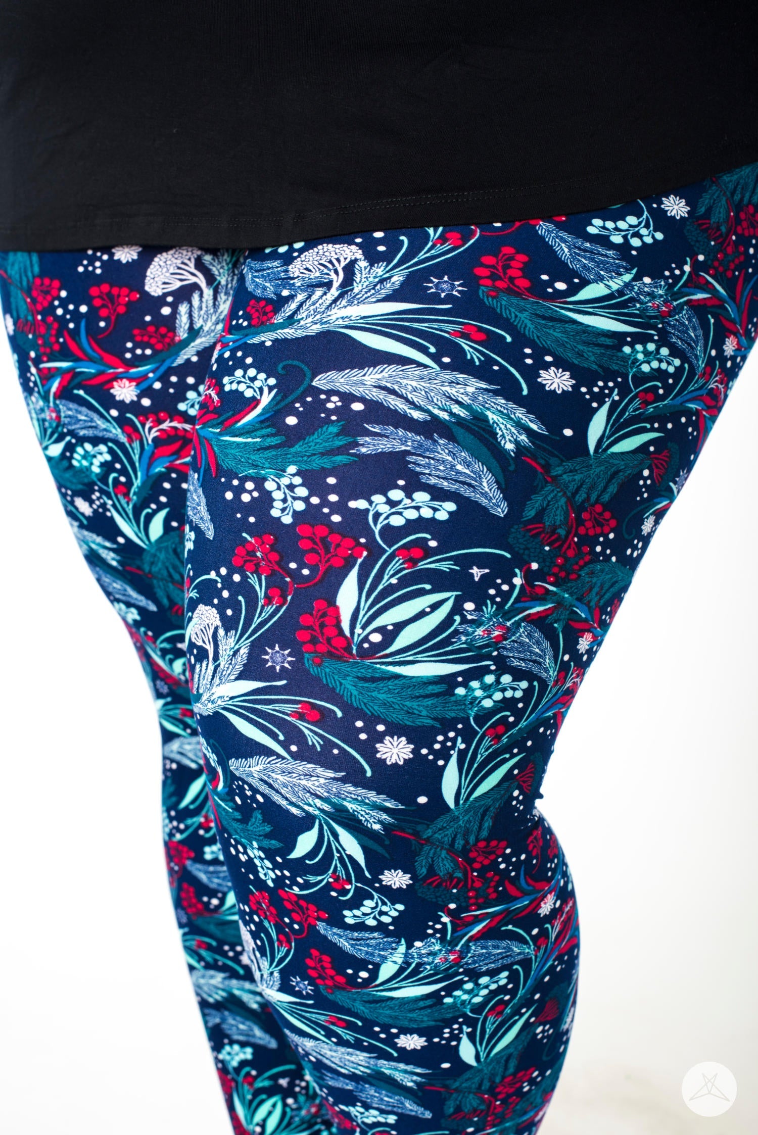 SweetLegs is delighted to introduce our newest winter SweetLegs, Mystic Mountain! This gorgeous print features a navy background with a swirling cornucopia of winter foliage and snowflakes in teal, deep red, blue, and white.