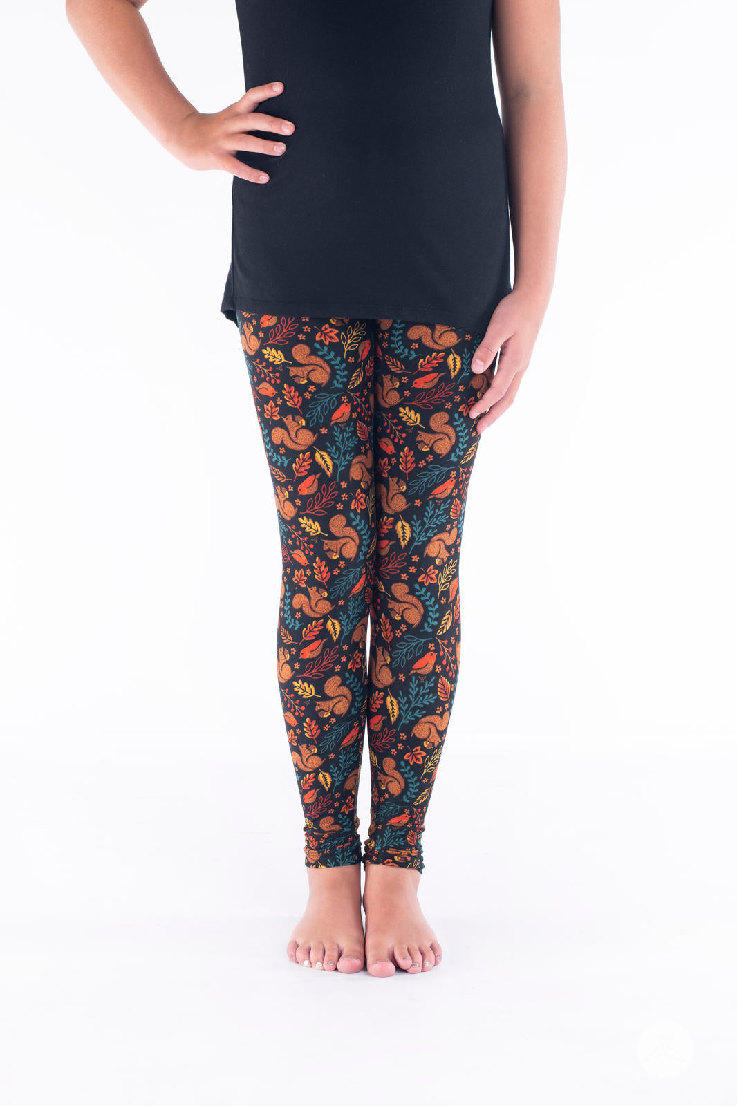 This print features fuzzy squirrels and chirping birds amongst fall foliage on a deep black background and is a perfect complement to your autumn wardrobe!