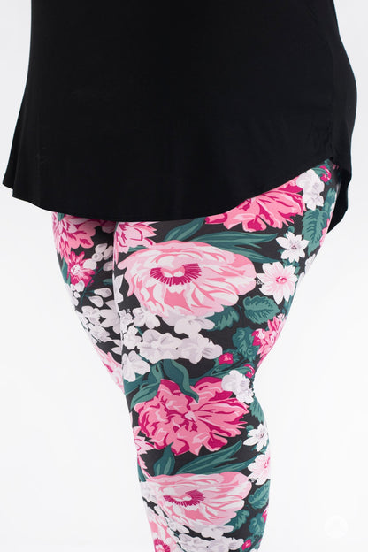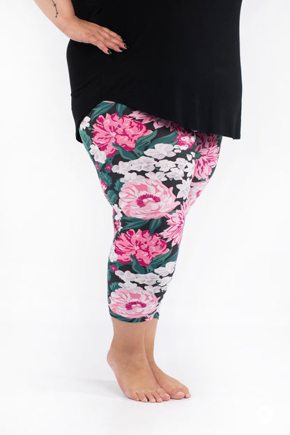 Seeking Splendor est un superbe imprimé floral à grande échelle dans des tons de rose, lavande, gris et émeraude, le tout sur un fond gris foncé.