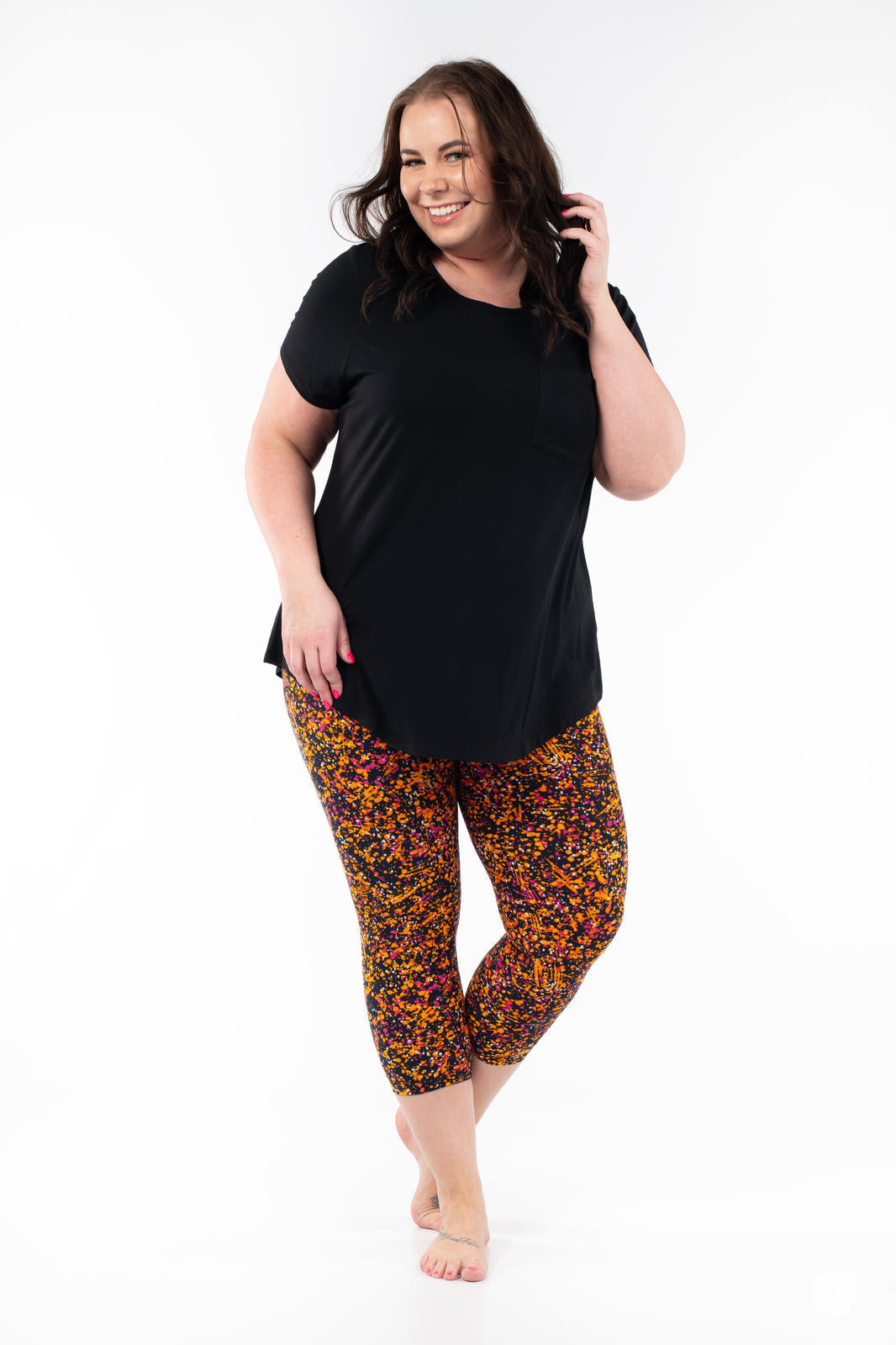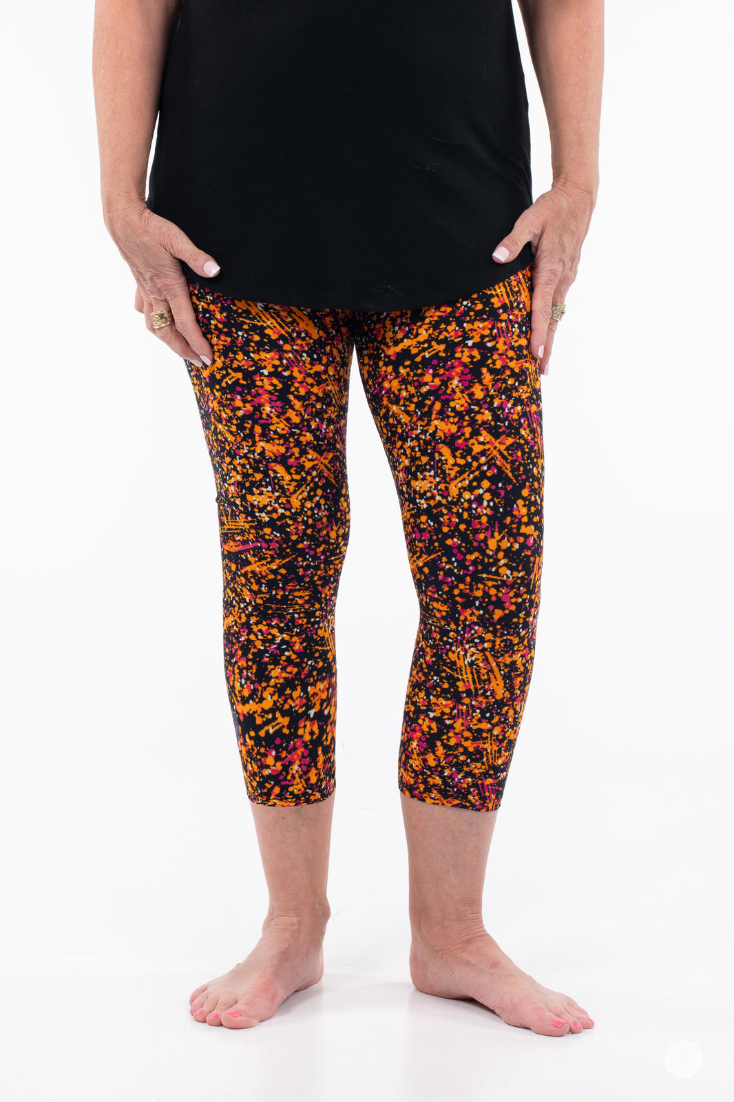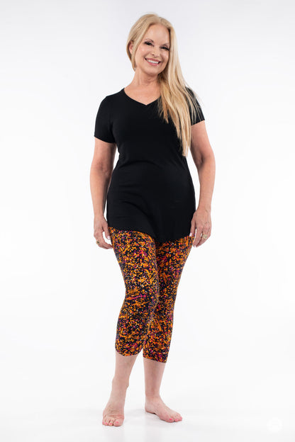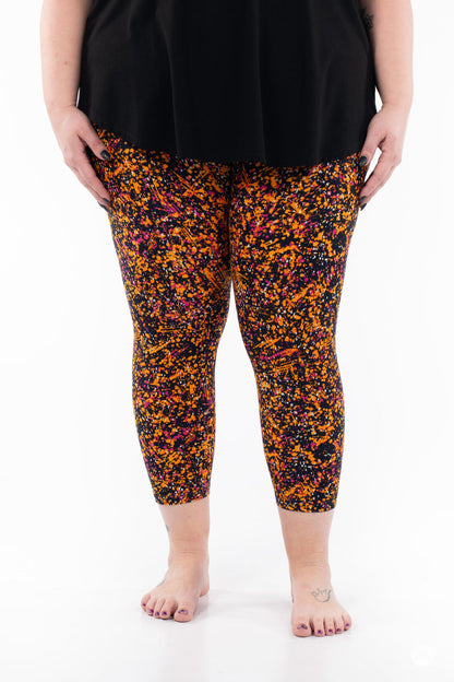 Canalisez votre Pollock intérieur dans Splatterday Night ! Avec des éclaboussures d'orange et de rose fuchsia sur une base bleu marine, ces leggings vibrants évoquent les couchers de soleil d'été, les nuits de feu de joie ou votre prochain chef-d'œuvre artistique. C'est l'imprimé parfait pour apporter une touche de couleur à votre samedi soir.