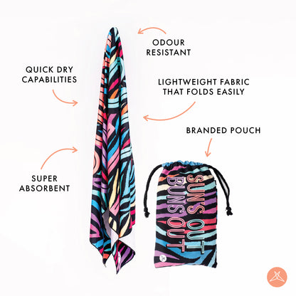 Pour un plaisir instantané, ajoutez simplement du soleil, du sable et notre nouvelle serviette de plage SweetLegs ! La serviette Sun's Out Buns Out est légère et compacte, mais une fois déballée, elle est de grande taille. Son toucher doux et soyeux, sa technologie ultra-absorbante et à séchage rapide en font le fourre-tout idéal, que vous alliez à la plage pour la journée, au camping pour le week-end ou en partant dans un endroit exotique !