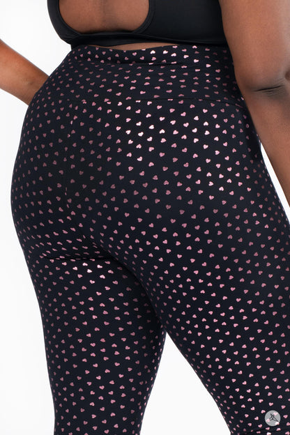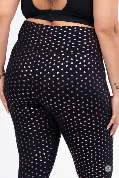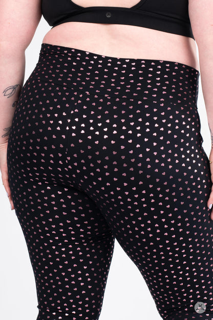 Sweetheart Sparkle features dainty pink metallic foil hearts sprinkled across a soft black background. These adorable leggings add a touch of sparkle to your Valentine’s Day outfit – or any day you’re feeling a little extra love. These high-waisted leggings feature a non-elasticized yoga style waistband for a sleek silhouette and secure fit.