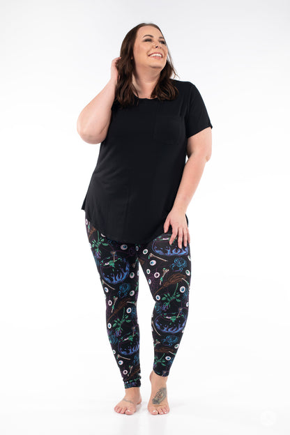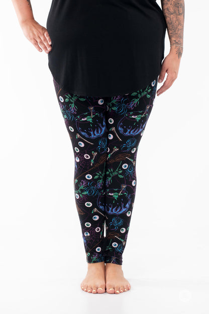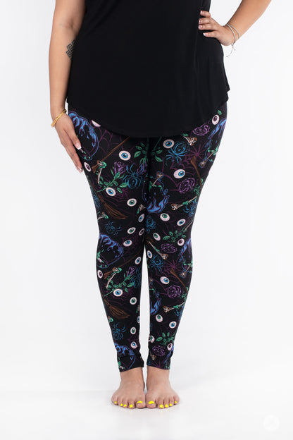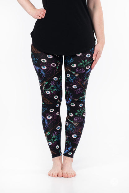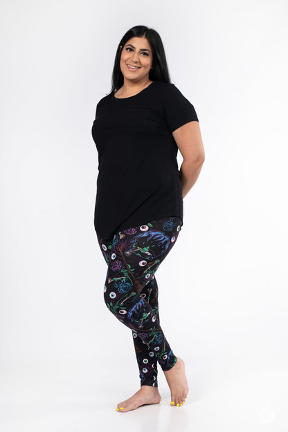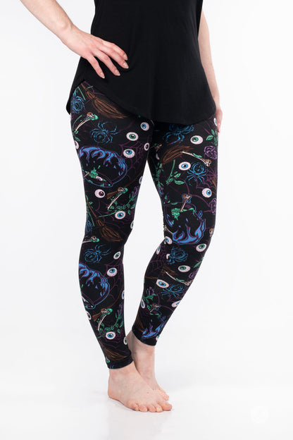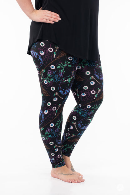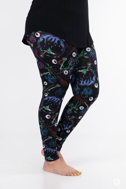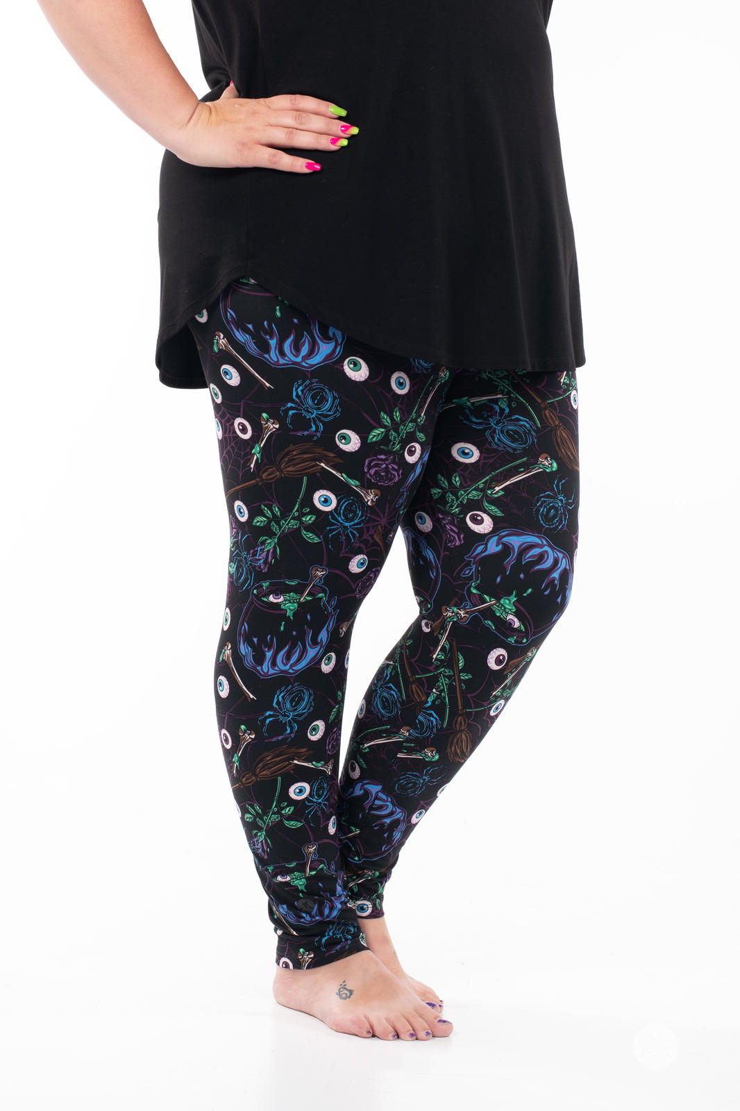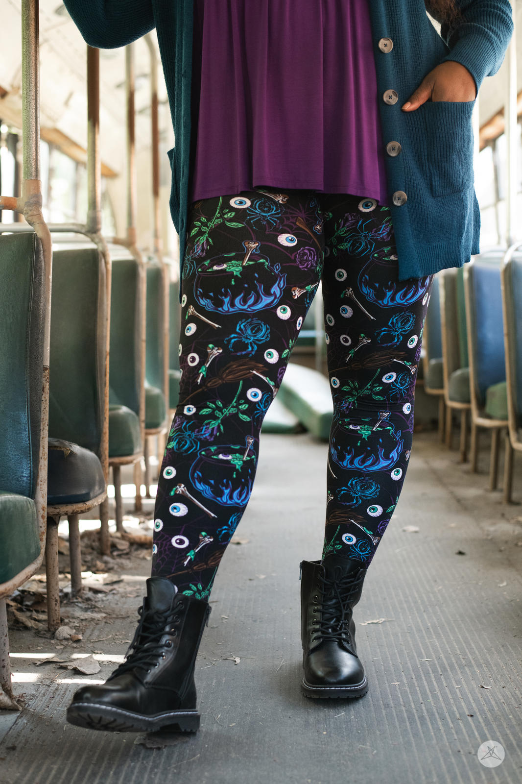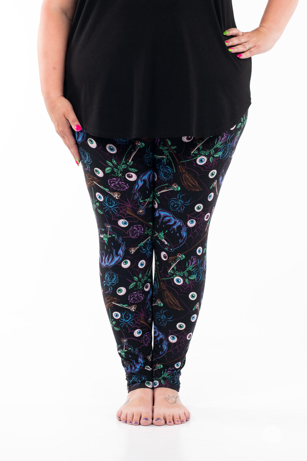Double, double, toil and trouble; here’s a print with cauldron bubbles! These leggings feature a black backdrop filled with eyeballs, spiders, bones, and other spooky ingredients - perfect for concocting a witch’s brew.