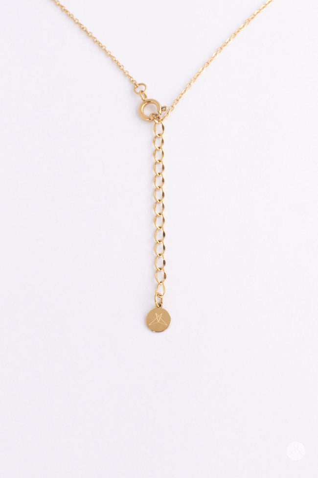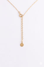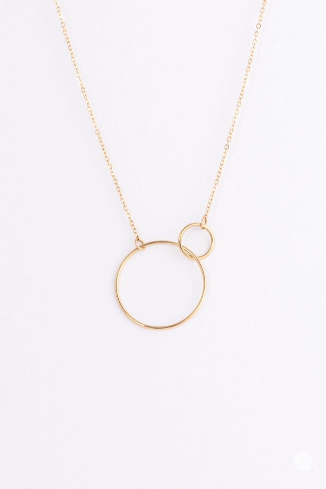 A timeless gold, dual circle, infinity pendant. Measuring 18 inches in length and made from 14kt gold plated stainless steel. Signature insignia stamped on extender